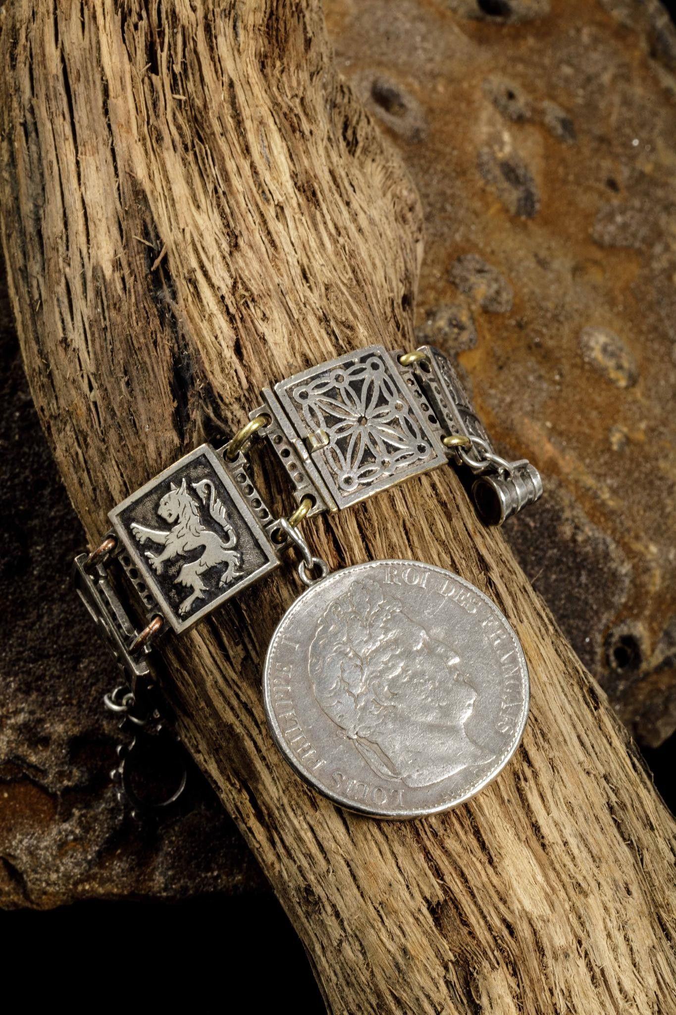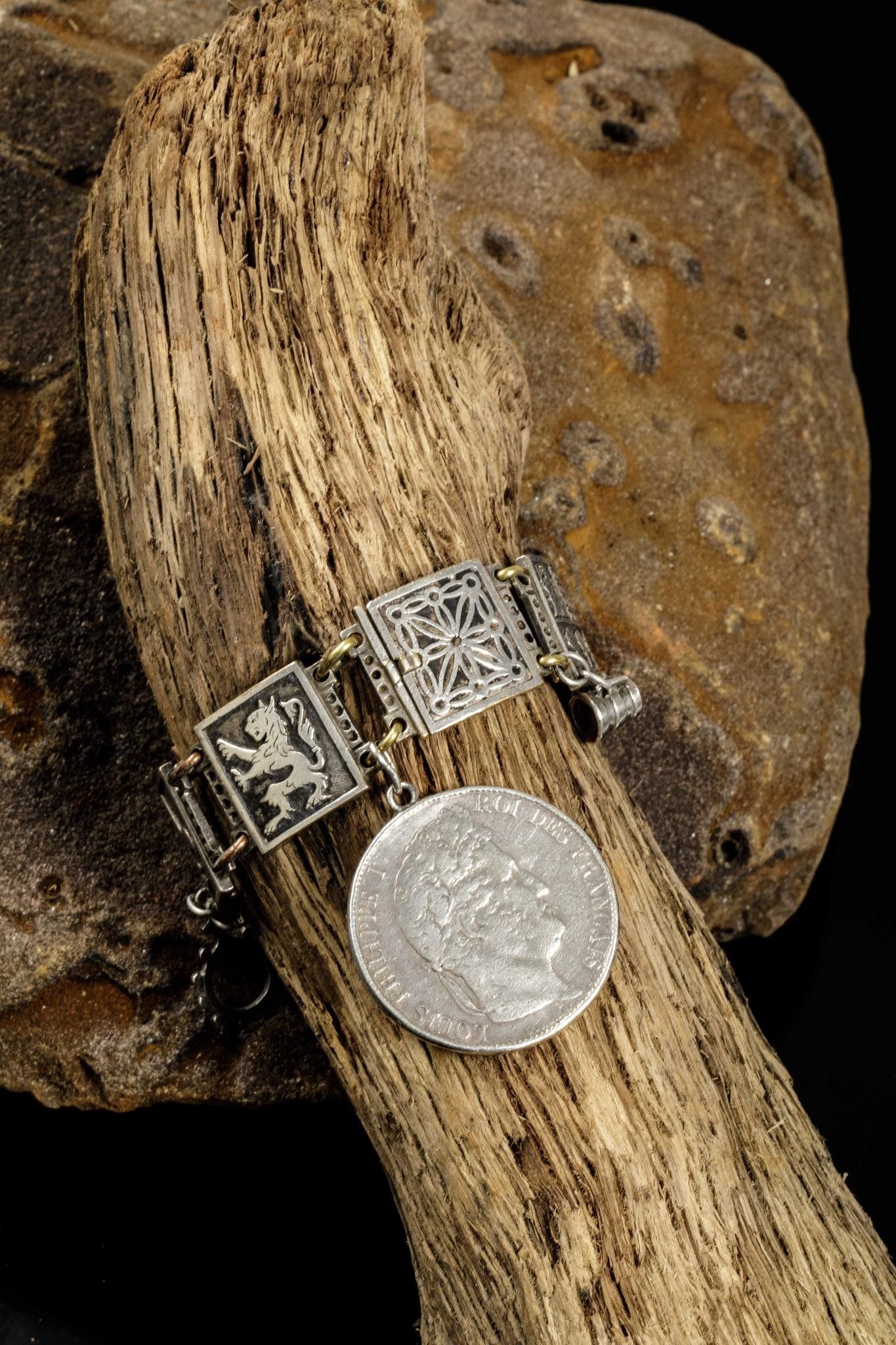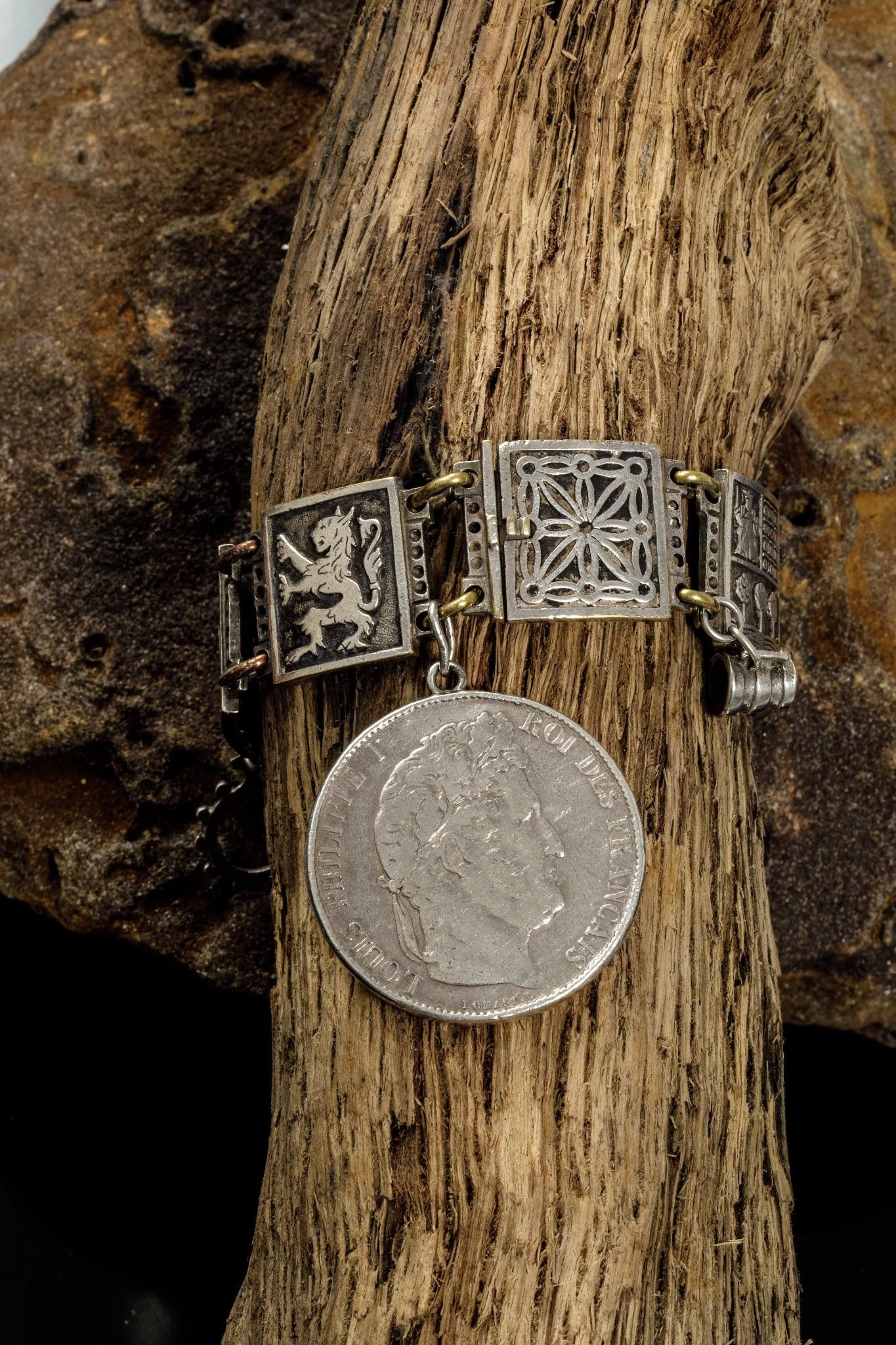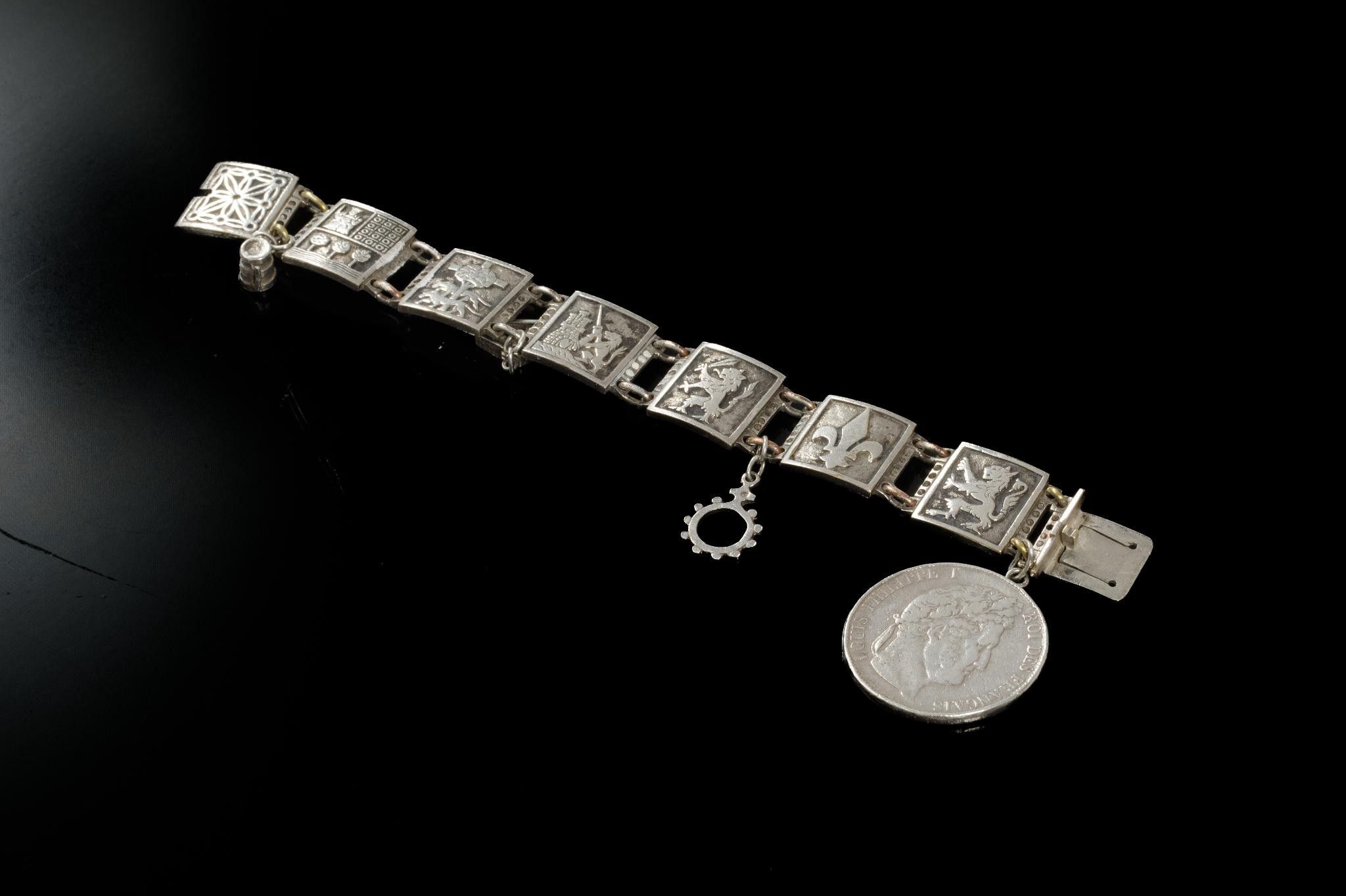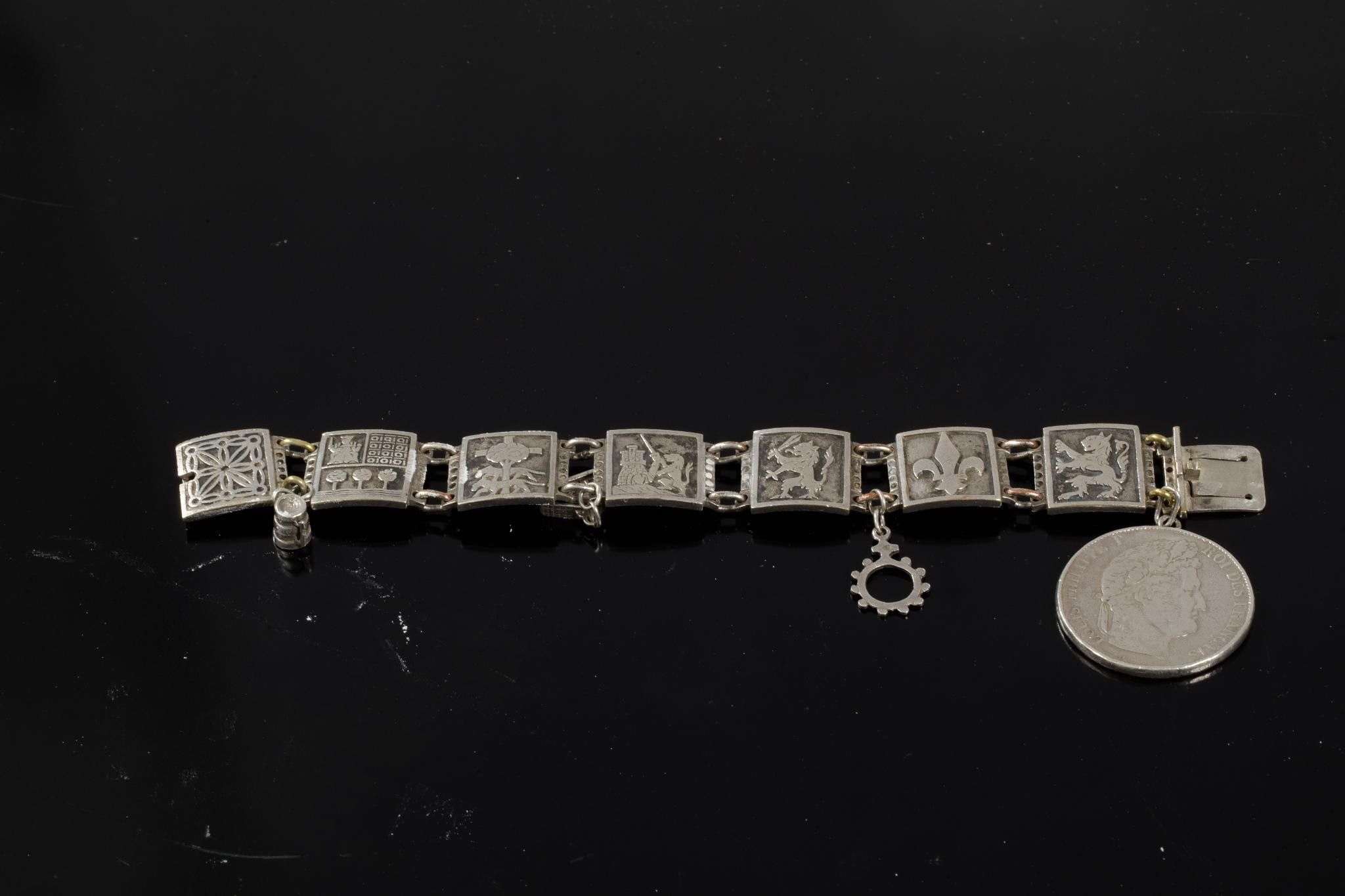 Silver and silver-plated metal bracelet with links depicting seven coats of arms of the seven provinces of the Basque Country on the reverse side inscribed Labourd, Soule, Alava, Biscave, Guipuzcoa, Navarre, adorned with pendants depicting a Basque house, a tenainier and a 5 franc coin Argent Louis Philippe 1848