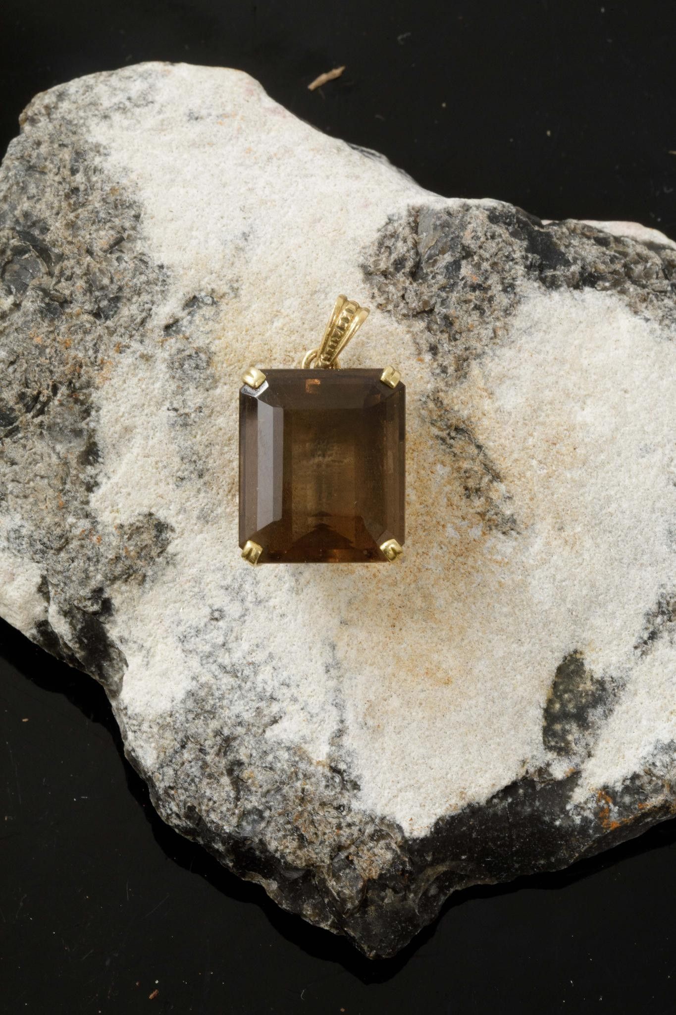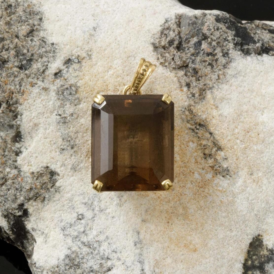 Emerald-cut smoky quartz pendant in four-prong gilt metal setting