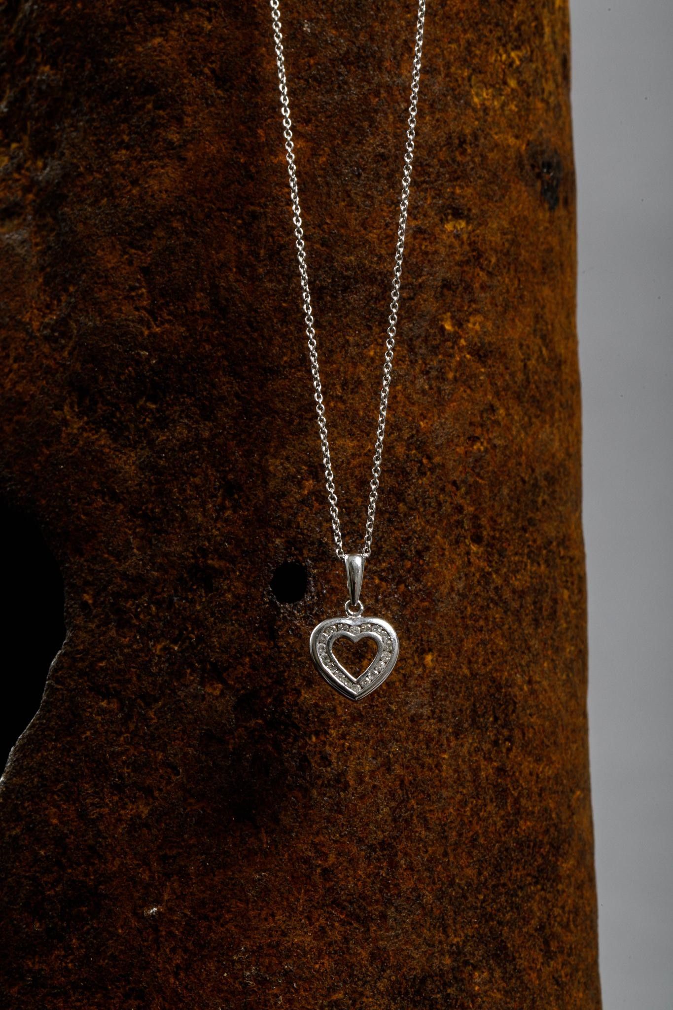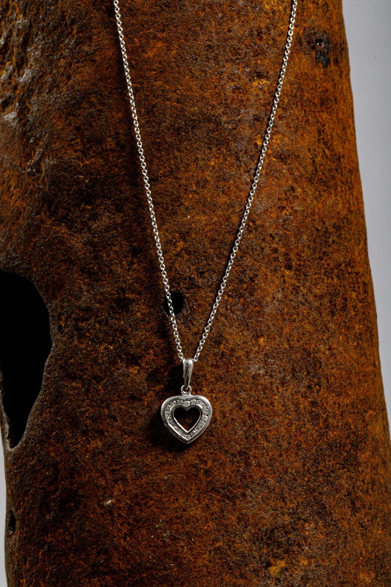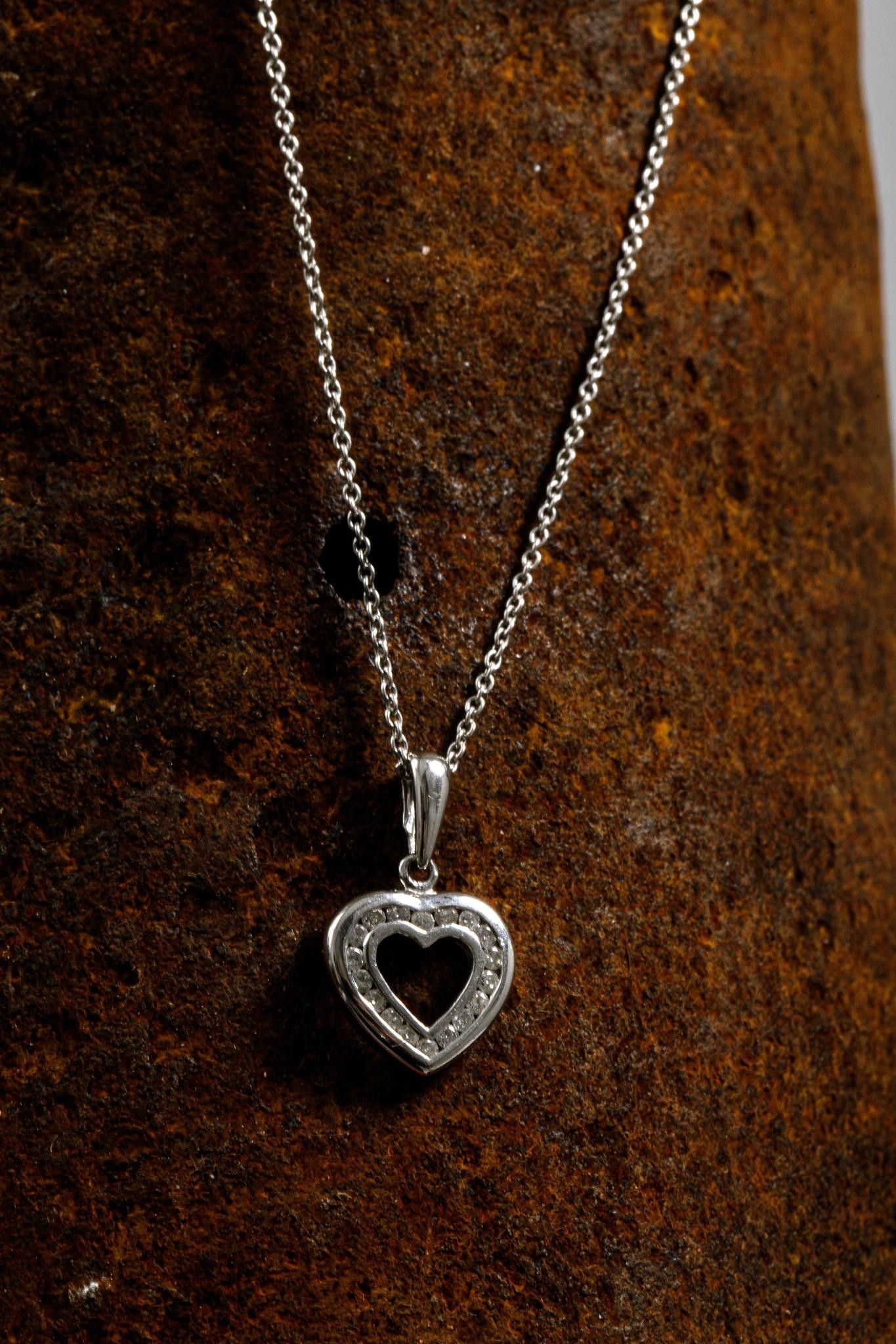 750 thousandths white gold chain (eagle head hallmark) holding an openwork heart-shaped pendant set with small round brilliants