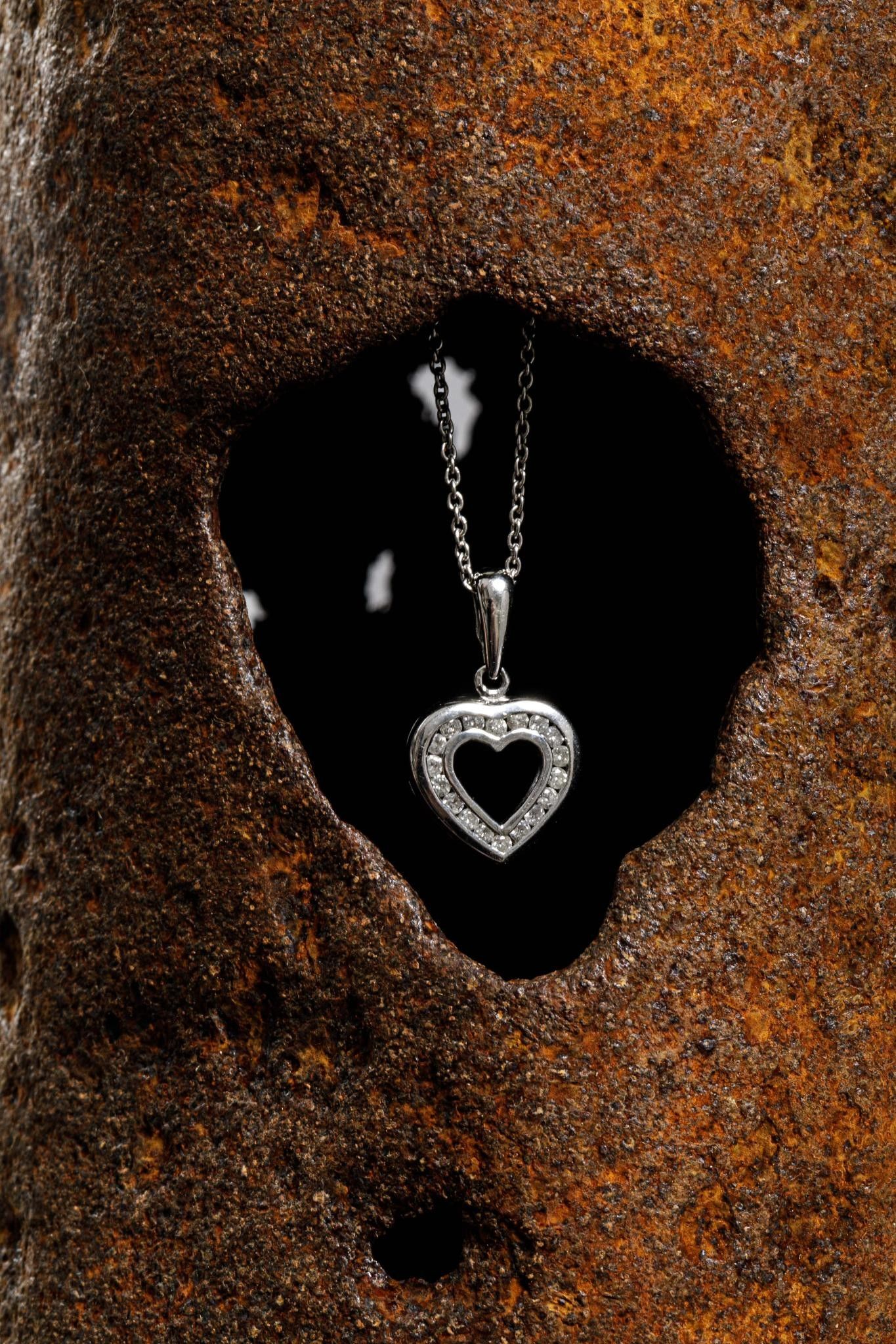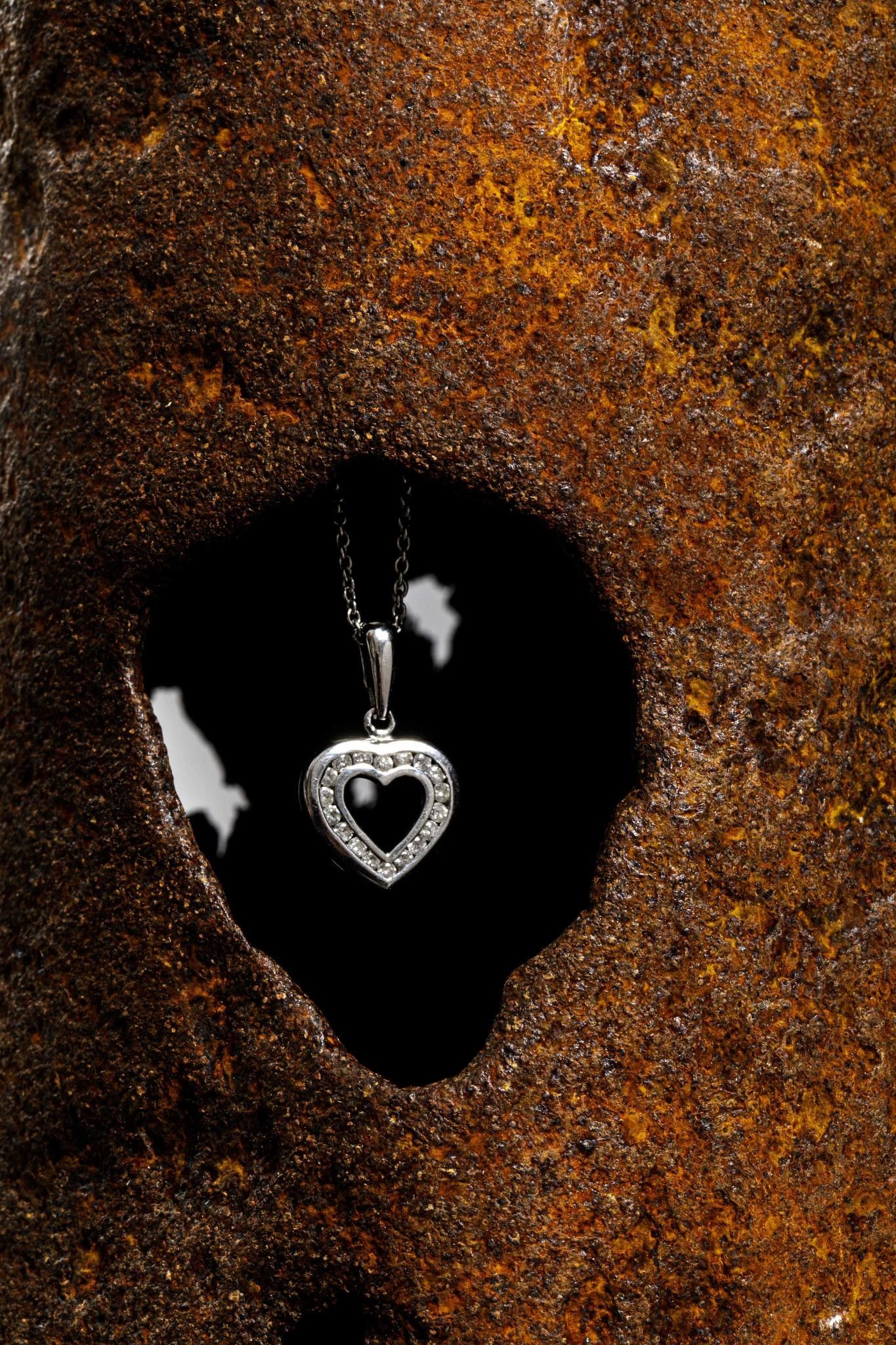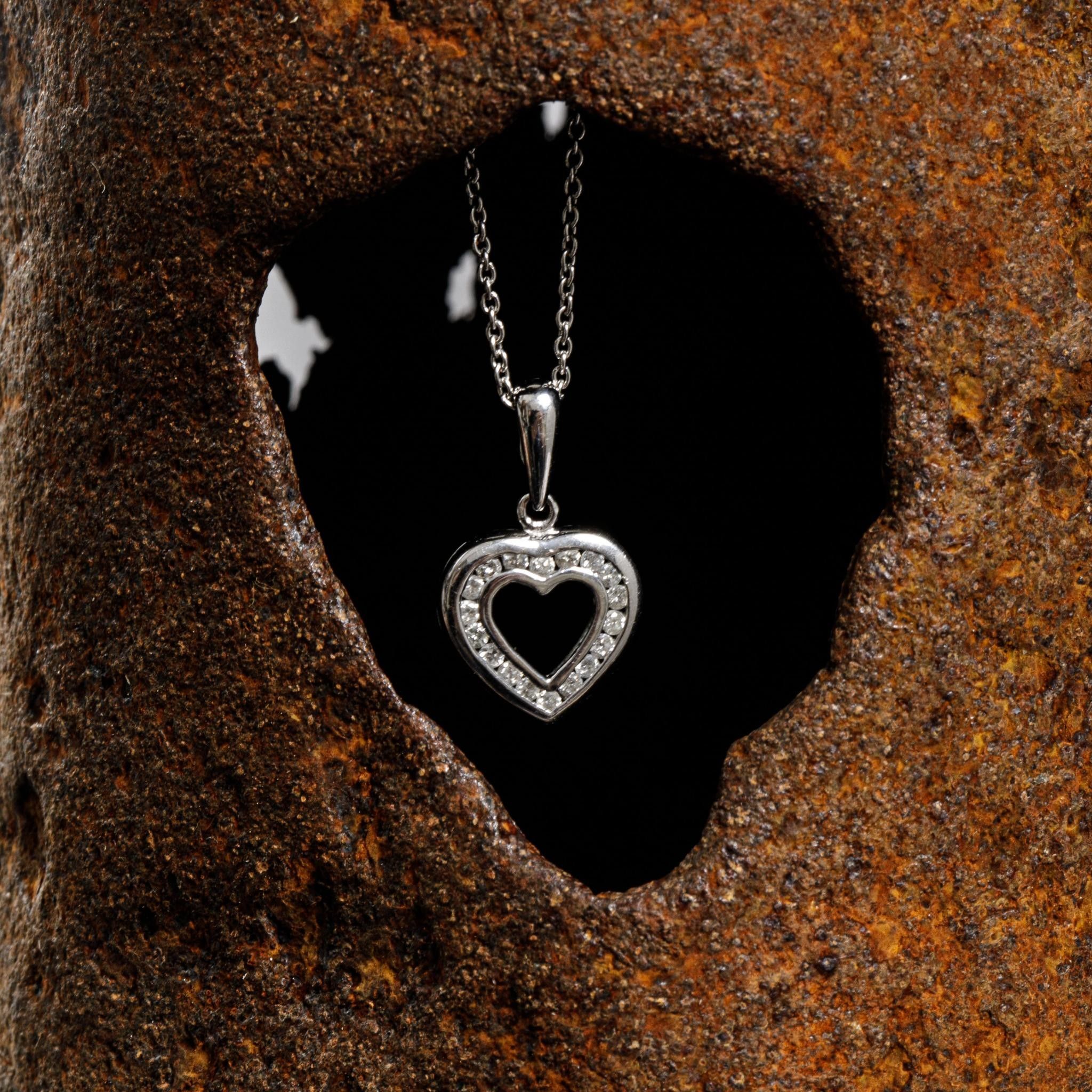 750 thousandths white gold chain (eagle head hallmark) holding an openwork heart-shaped pendant set with small round brilliants
