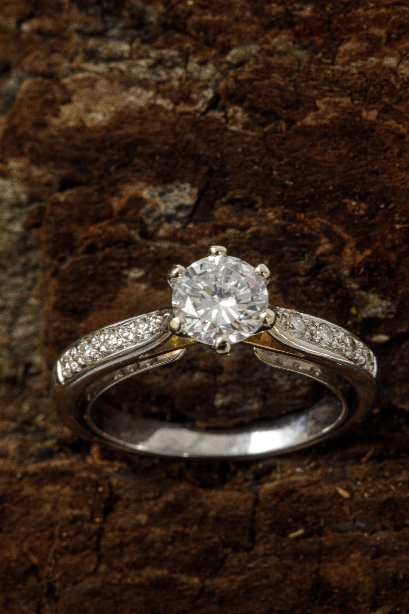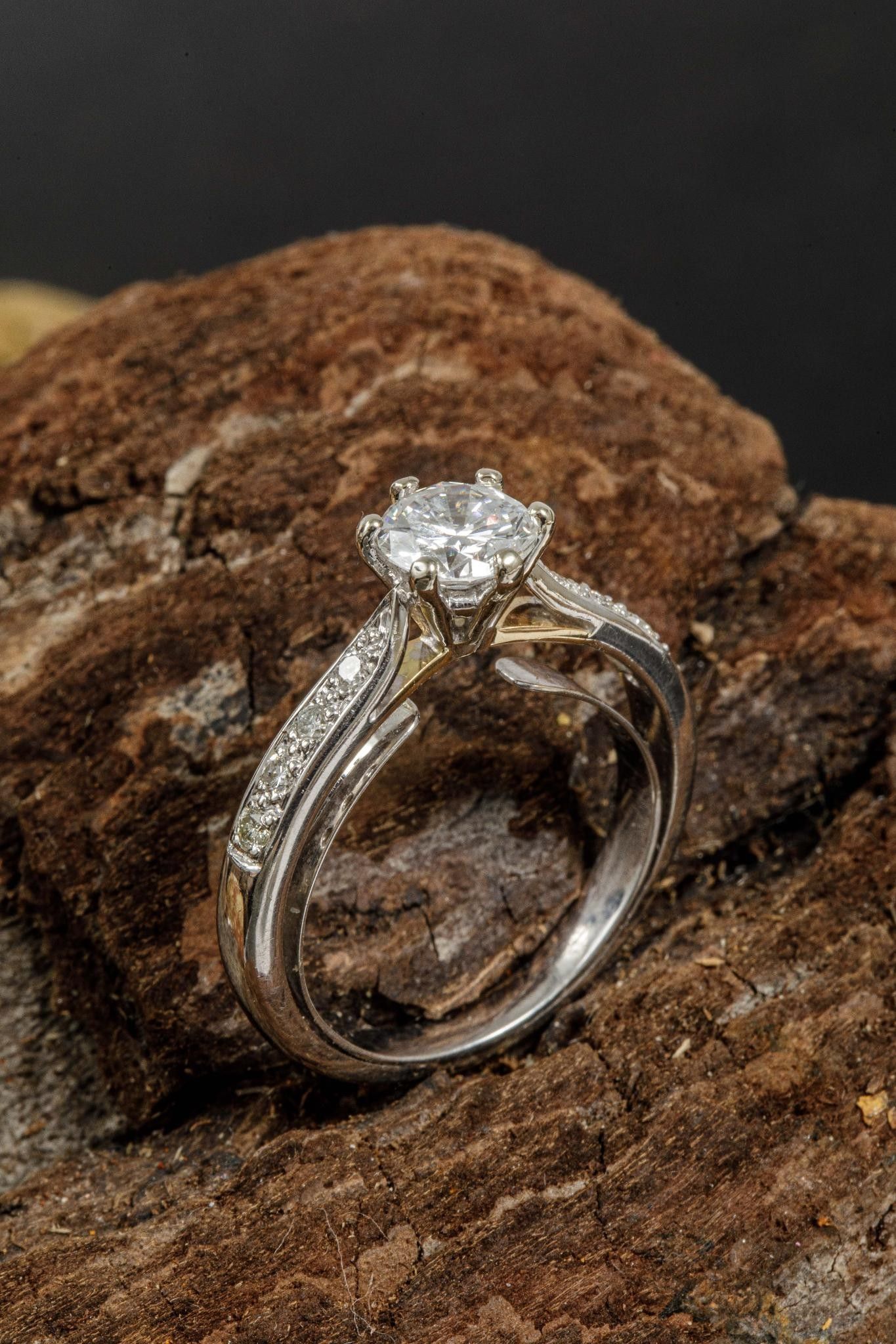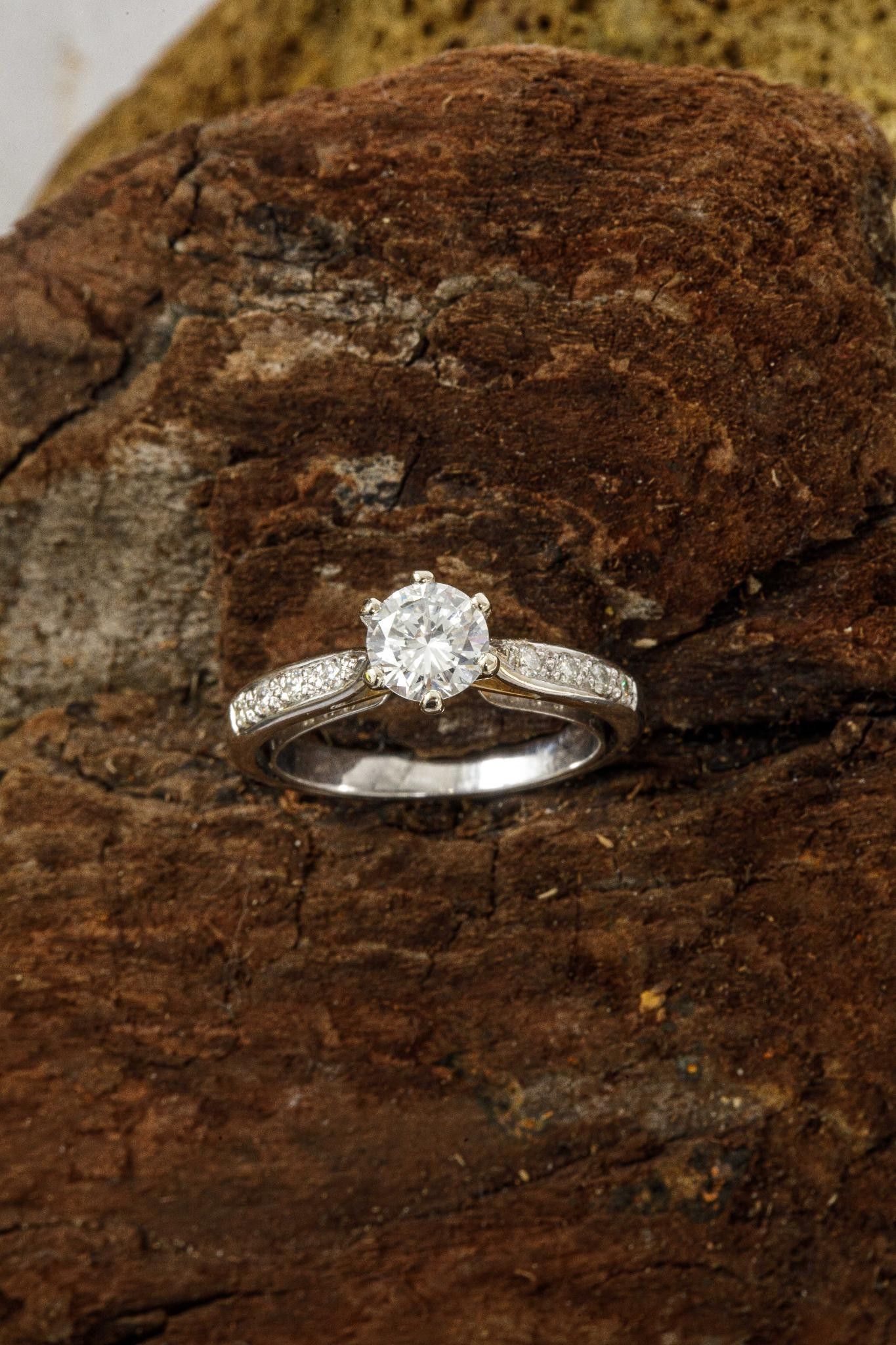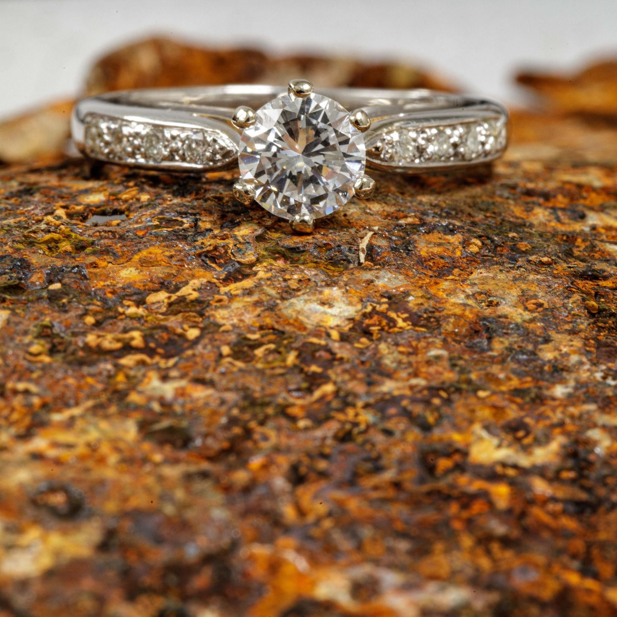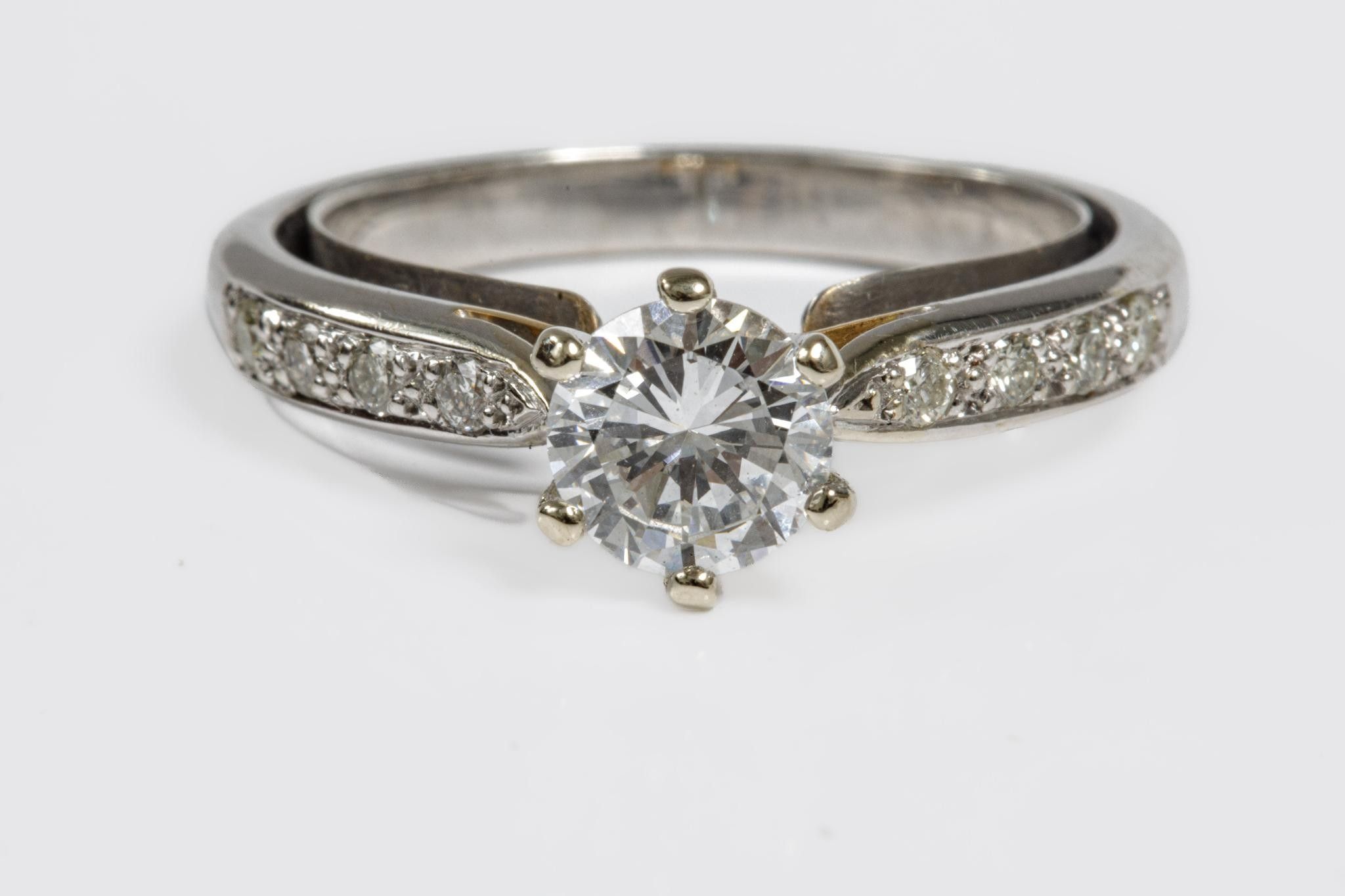 Ring in white gold 750 thousandths (eagle head hallmark) set with a round brilliant diamond calibrating 0.92 carat E colour, SI1 clarity Fluorescence none, shouldered by four brilliants