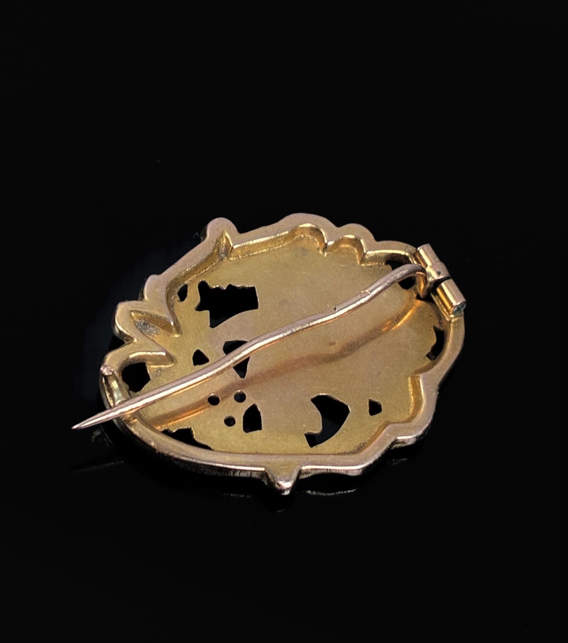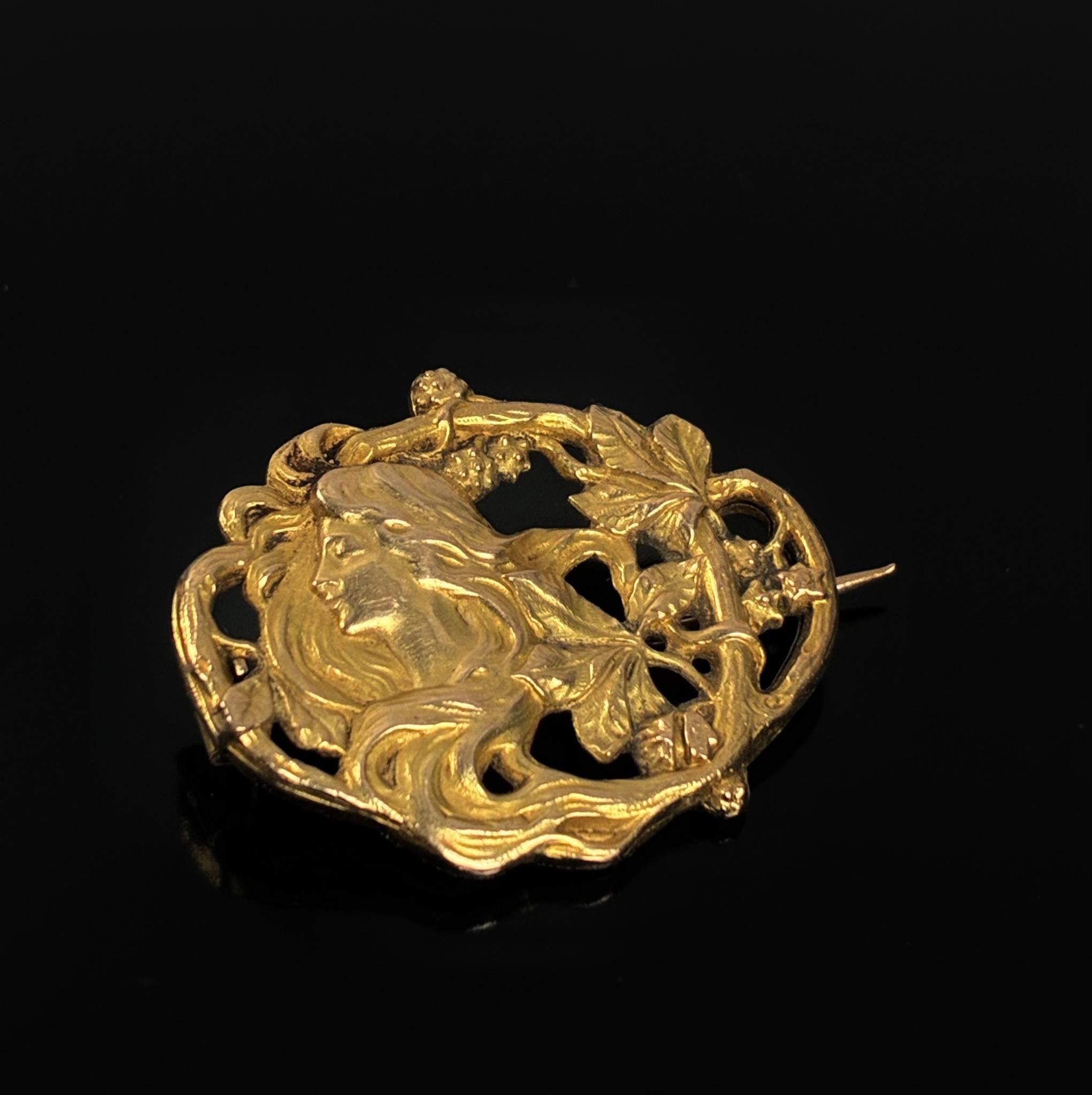 750 thousandths yellow gold brooch (horsehead hallmark) showing a woman's face with waving hair in a tangle of brambles and blackberries.