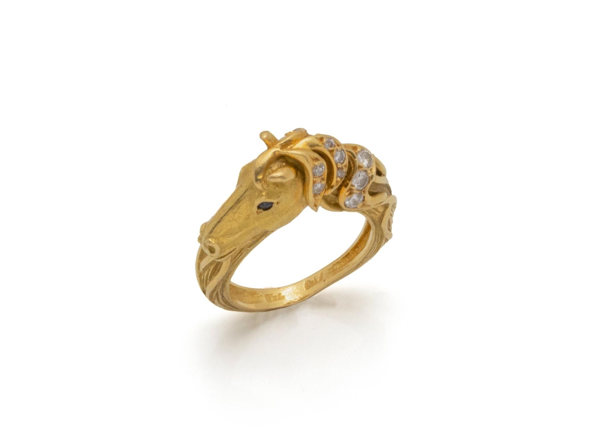 Sculpted 750 thousandths gold ring stylising a horse's head, the eyes dotted with small sapphires, the mane with brilliant-cut diamonds.