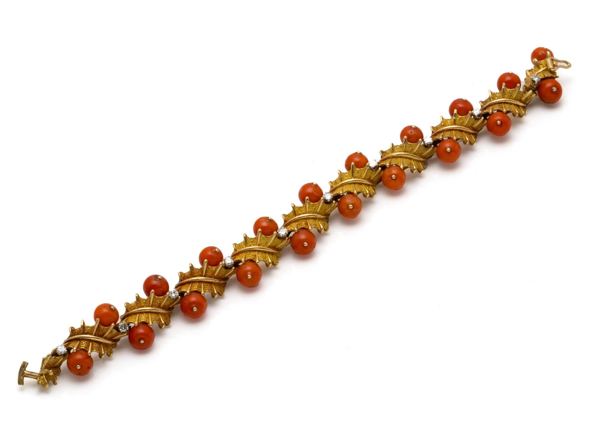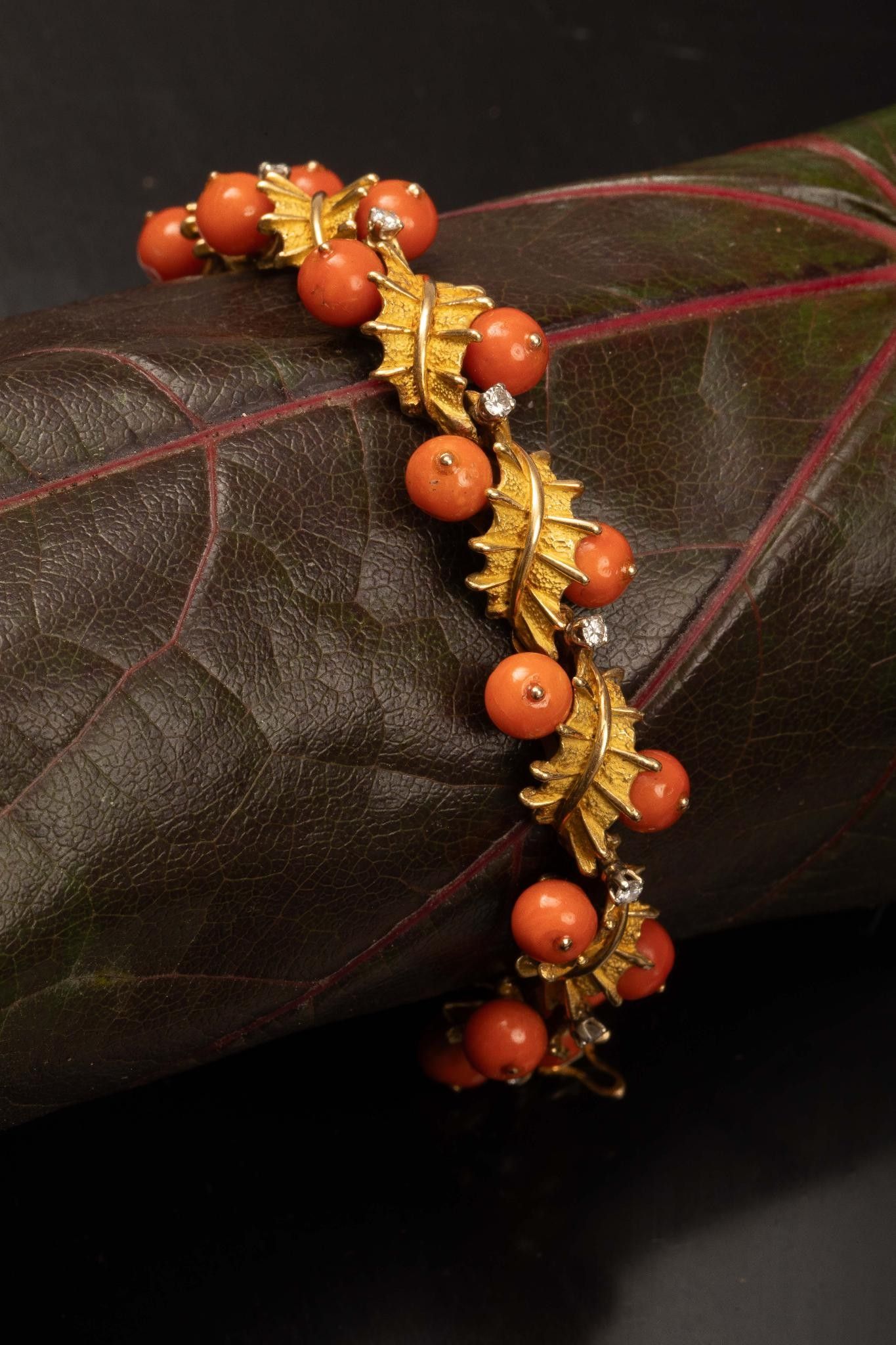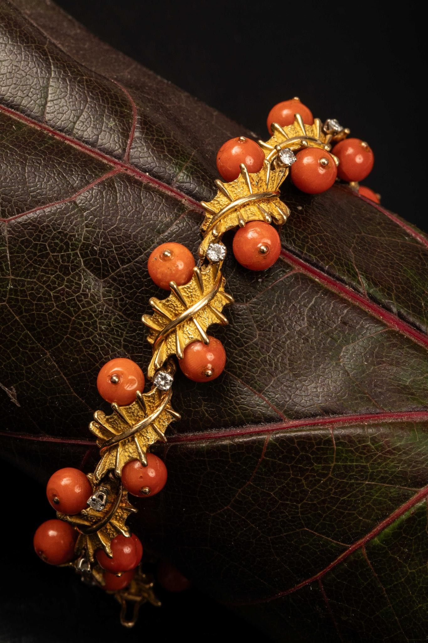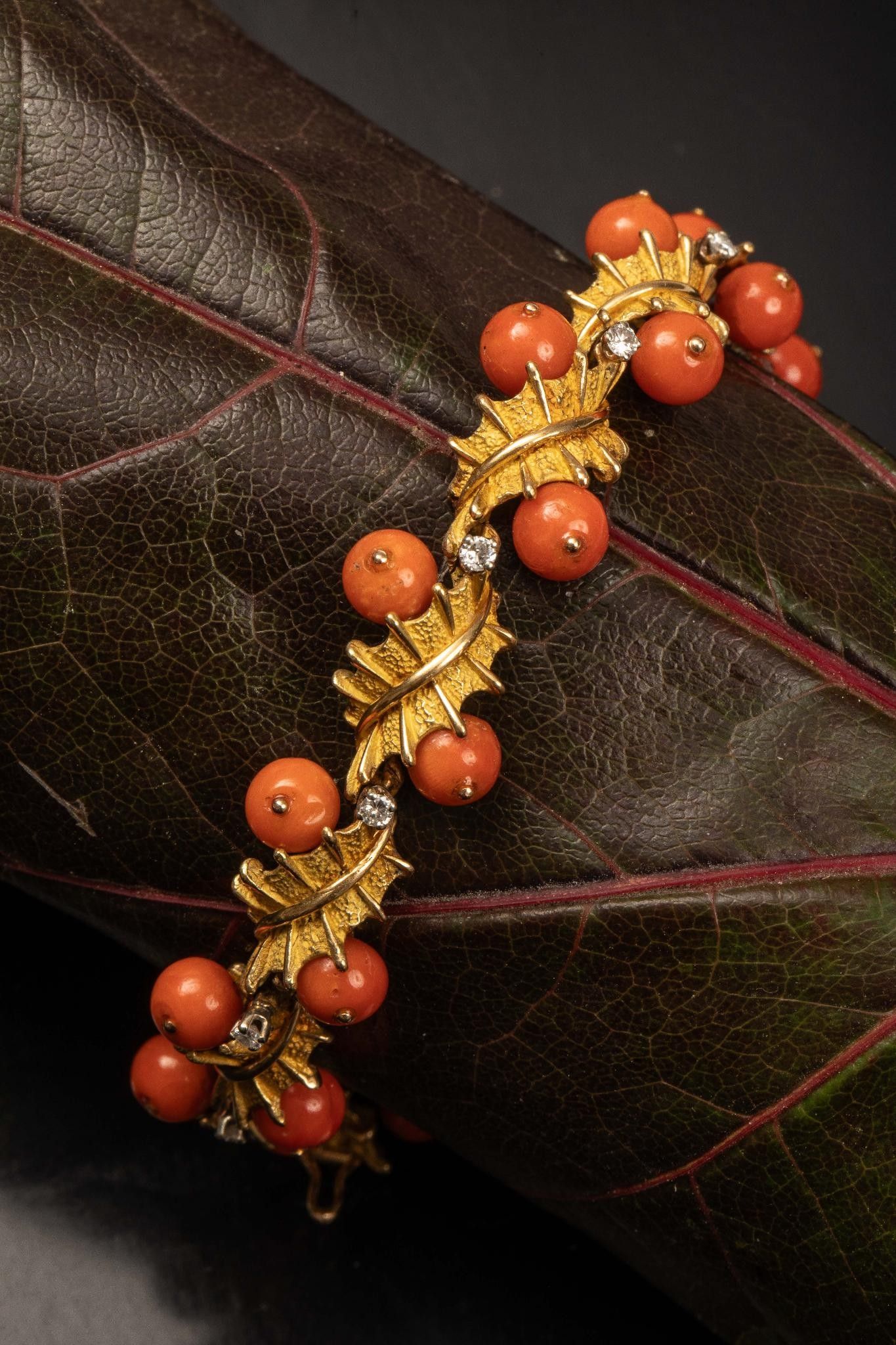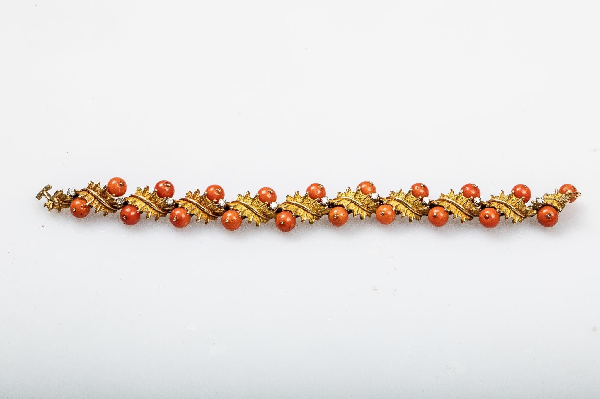 Articulated bracelet in 750 thousandths gold, comprising a series of chased links decorated with stylised holly leaves, embellished with coral pearls and punctuated with small brilliant-cut diamonds. It is fitted with an invisible ratchet clasp with eight safety catches.