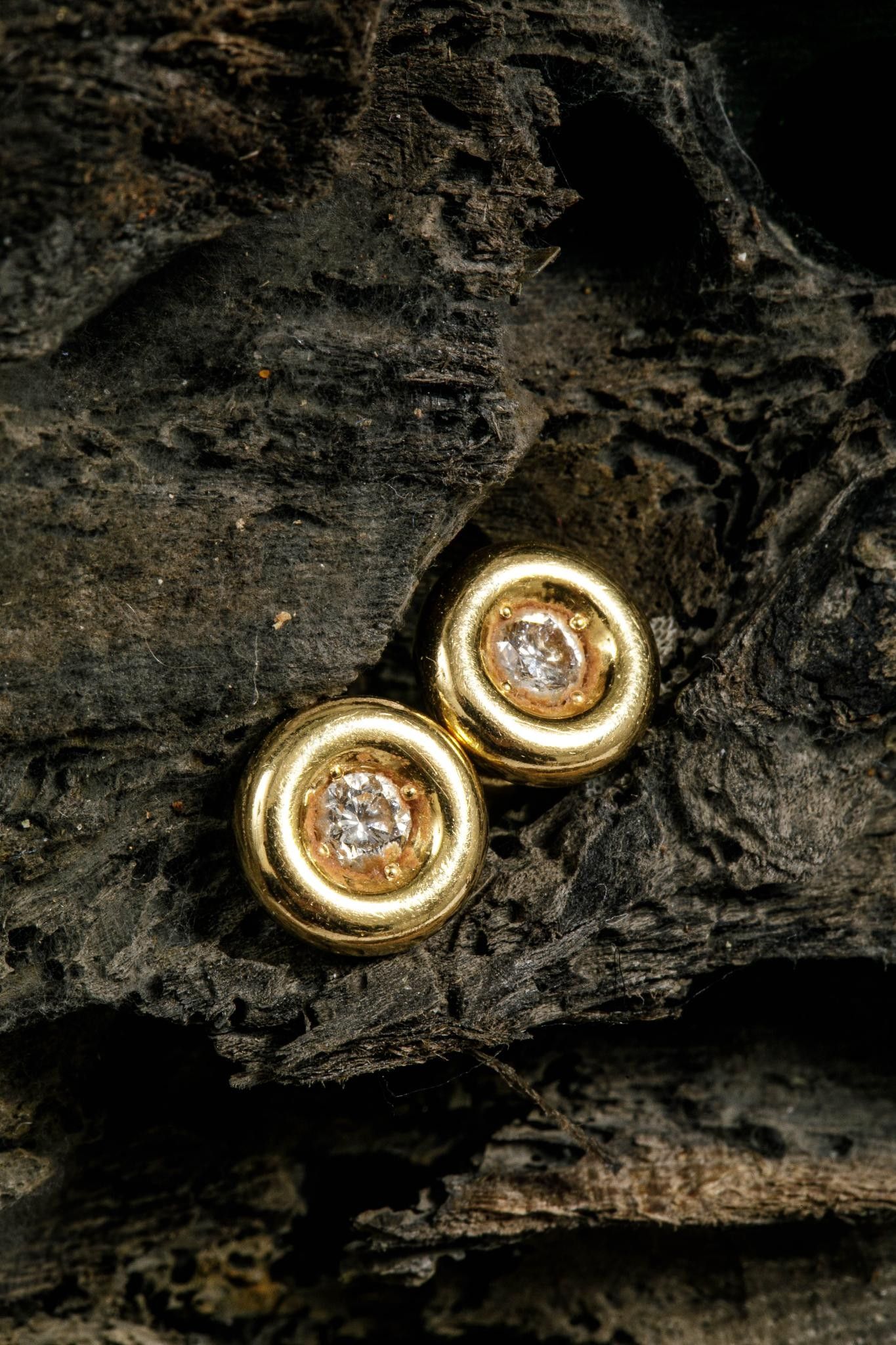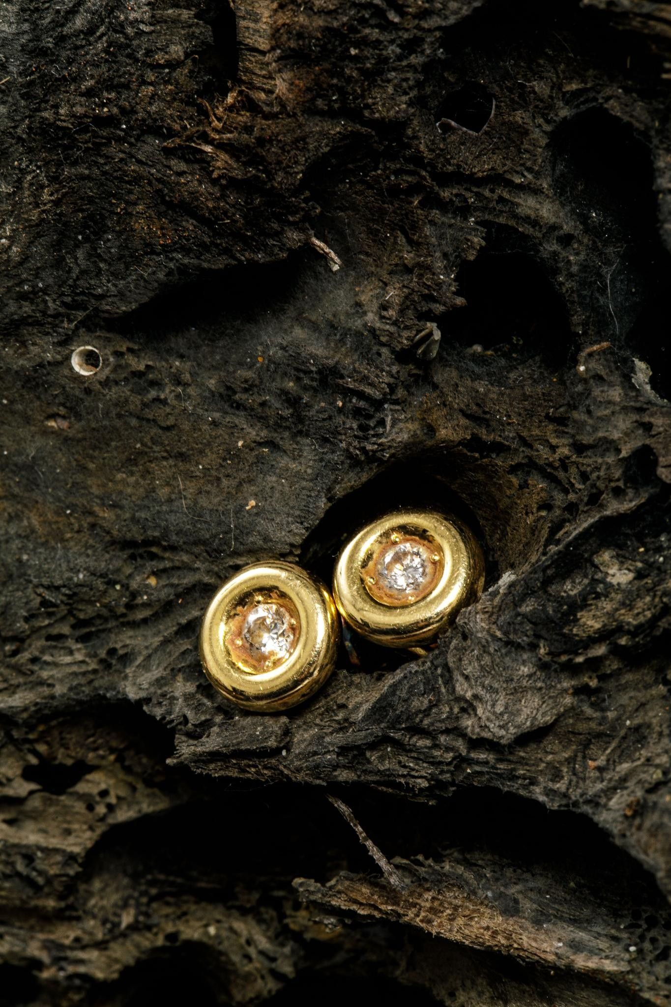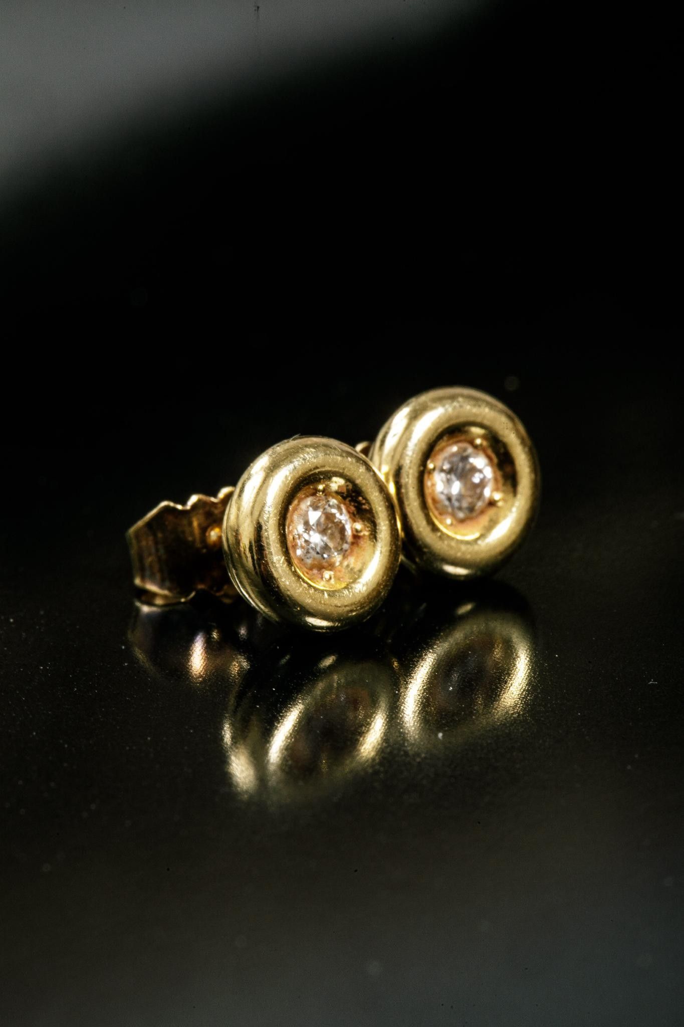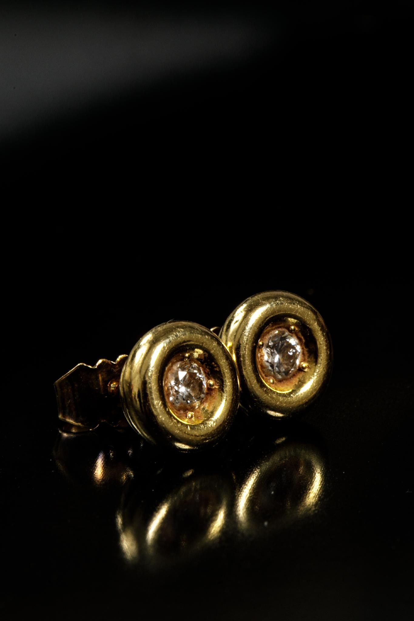 Pair of round stud earrings in 750 thousandths yellow gold (eagle head hallmark) set with diamonds