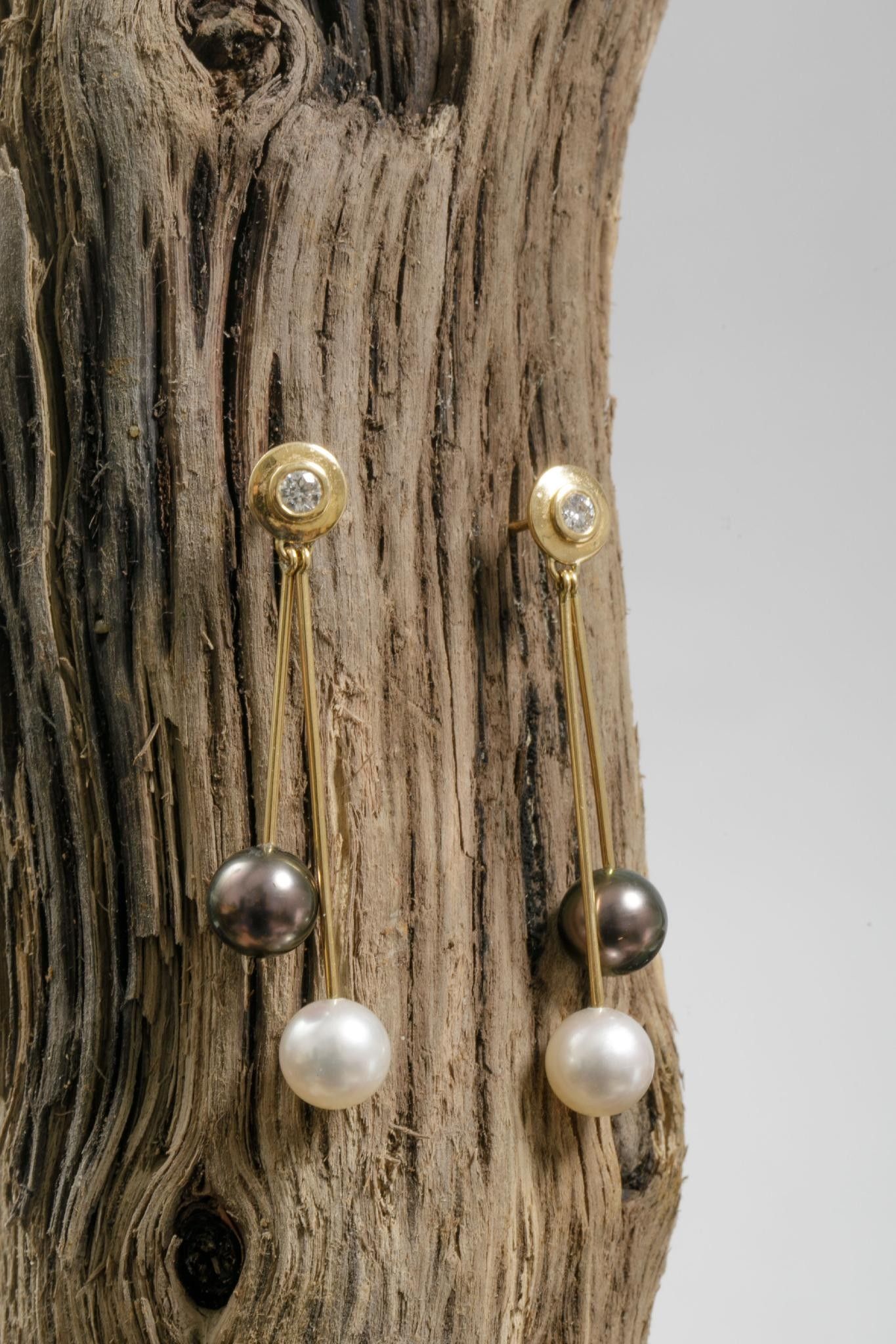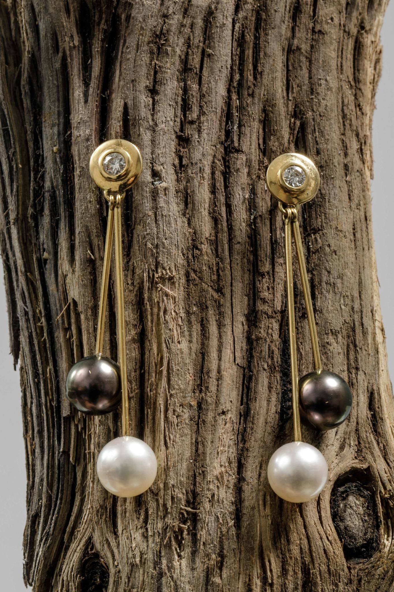 Pair of round stud earrings in 750 thousandths yellow gold centred on a small one forming double pendants of a black pearl and a white pearl, Alpa safety clasp