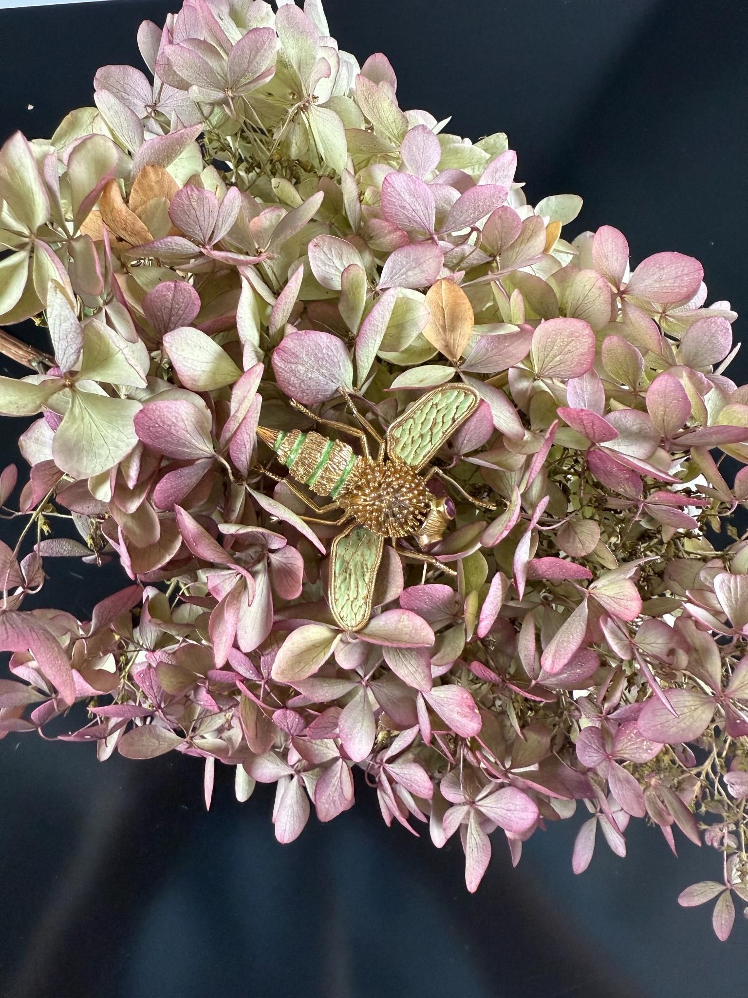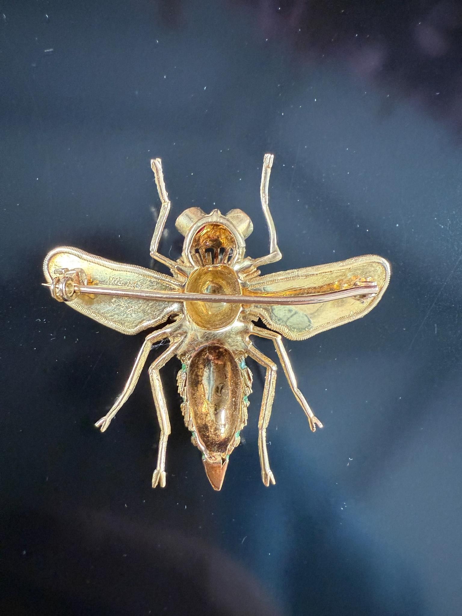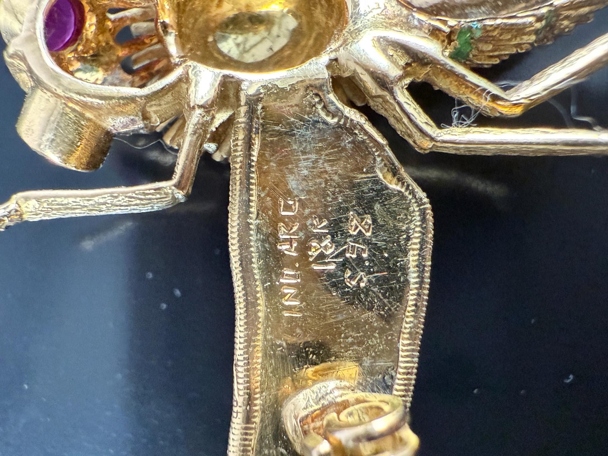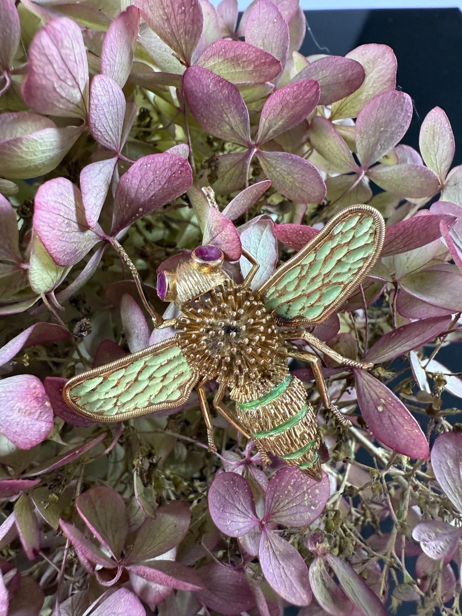 750 thousandths gold brooch styling a wasp dressed in enamel…