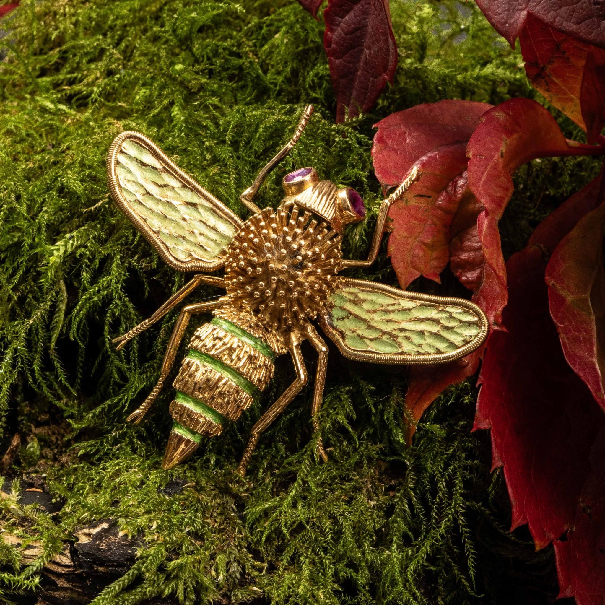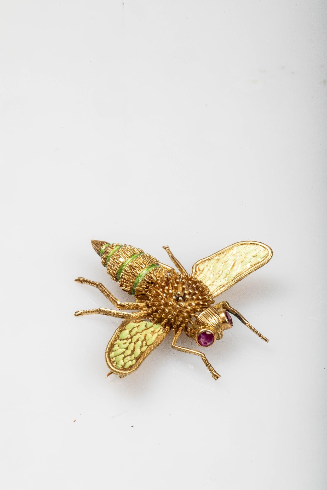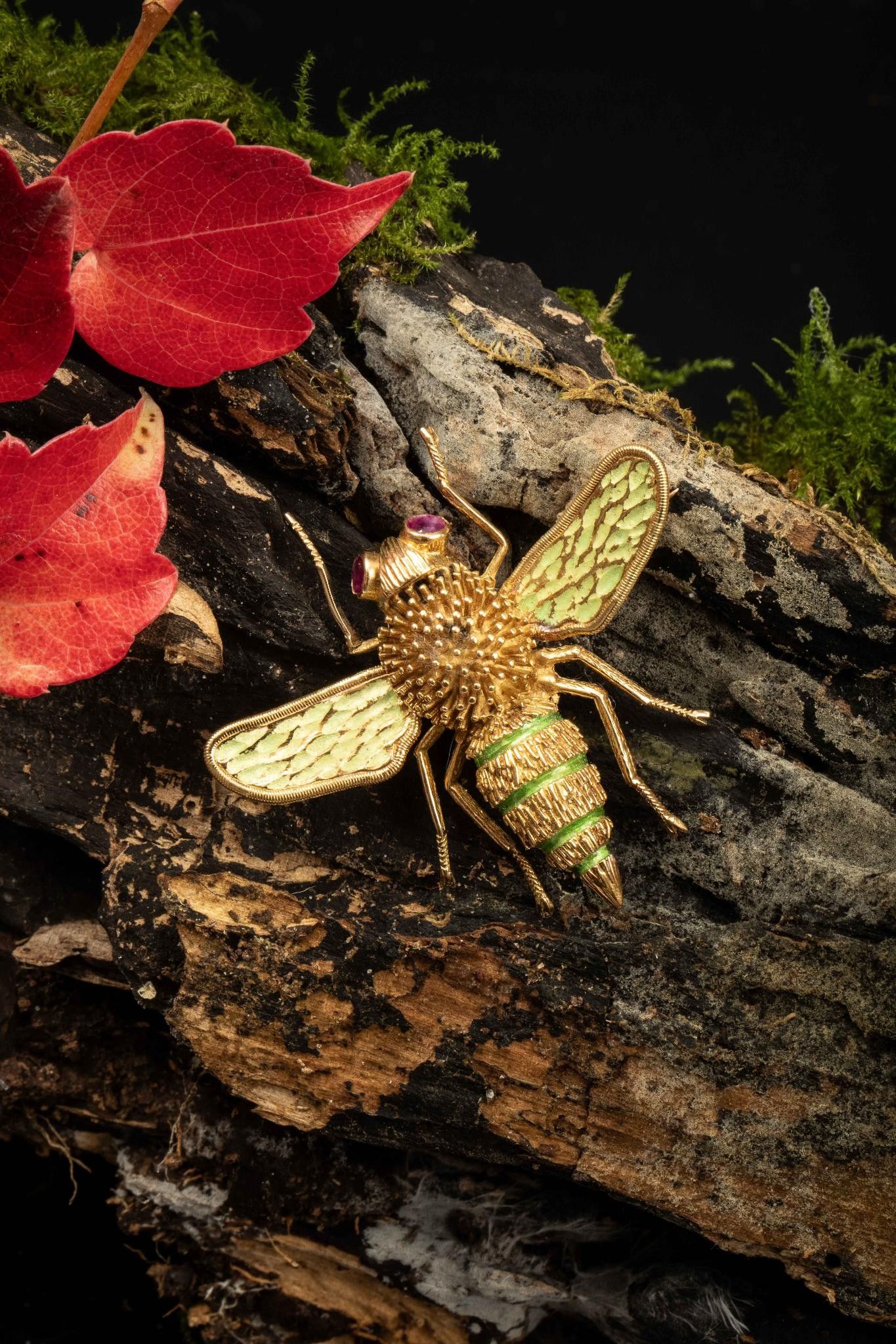 750 thousandths gold brooch styling a wasp dressed in enamel, the eyes in rubies.