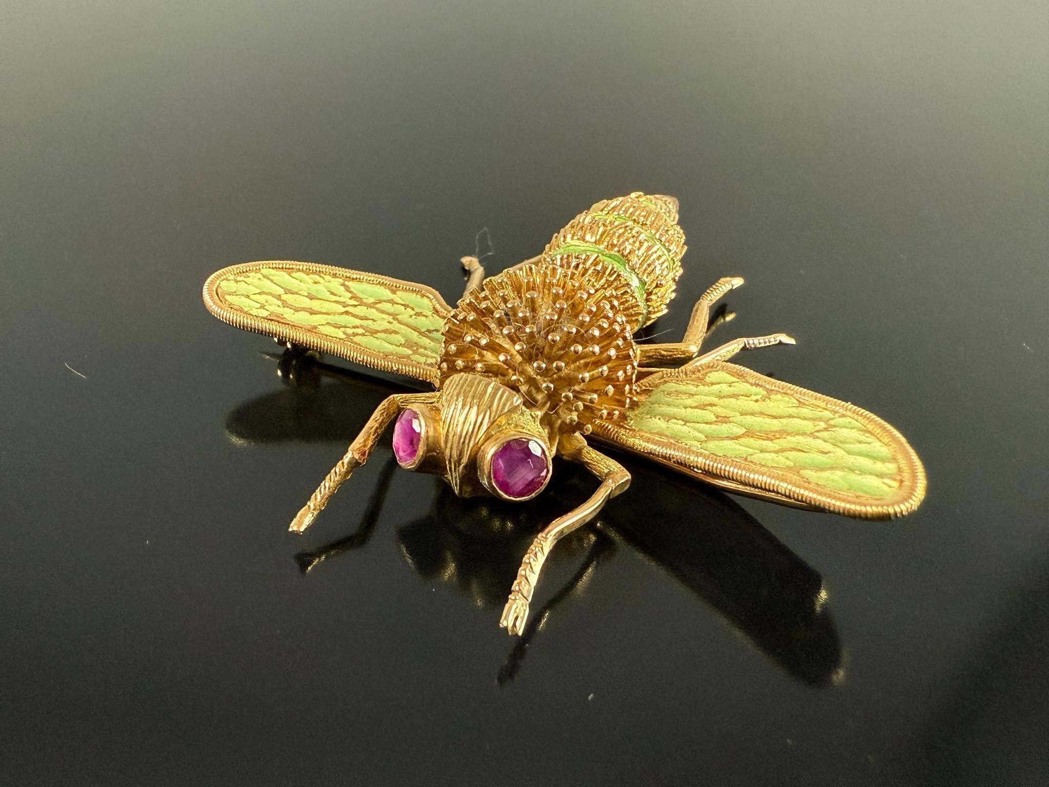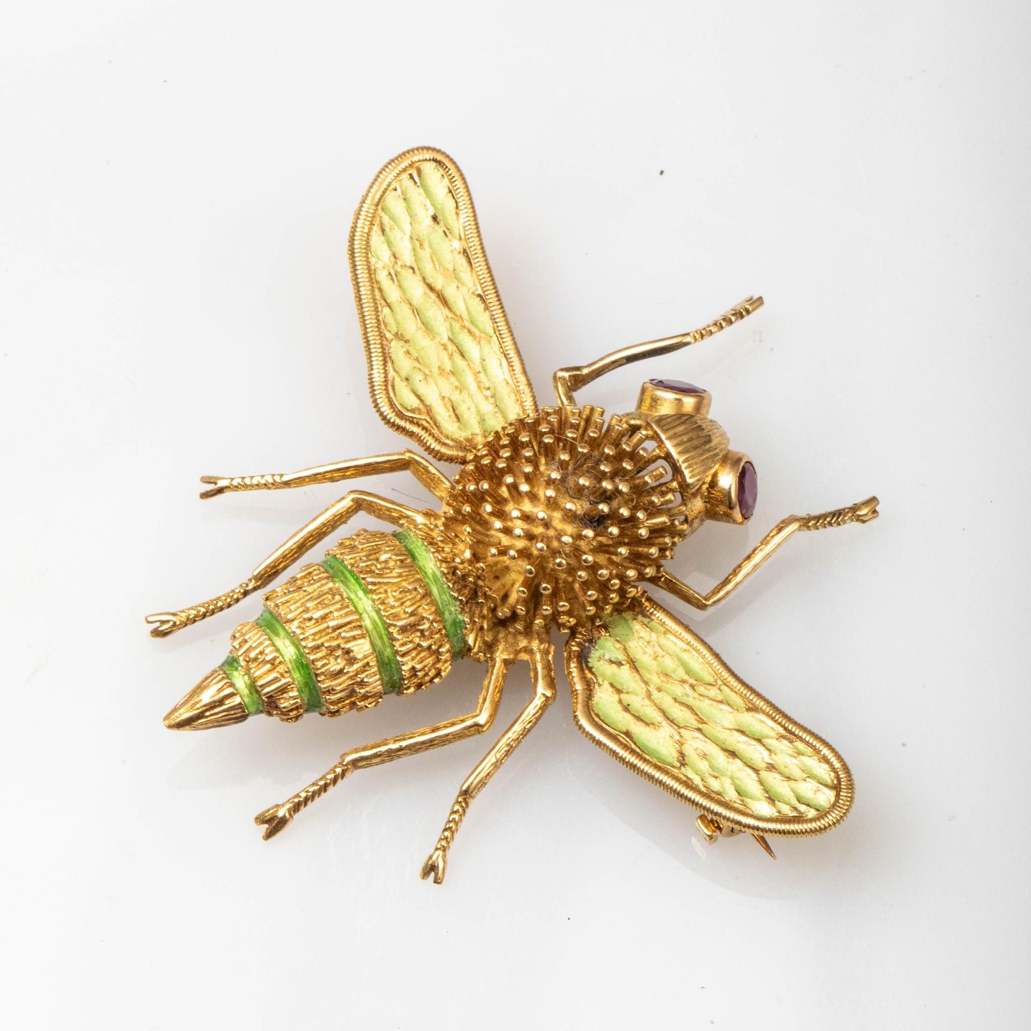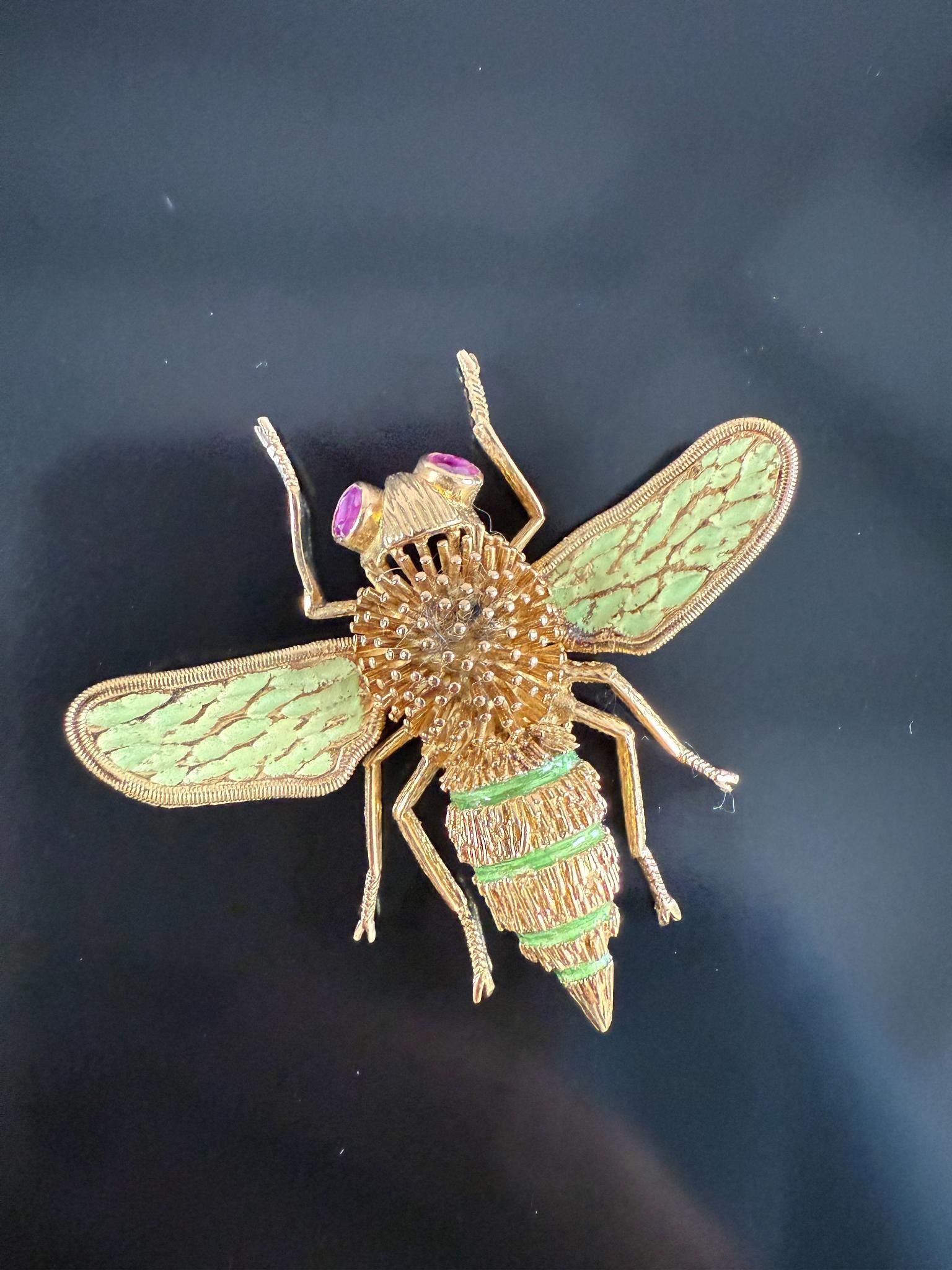 750 thousandths gold brooch styling a wasp dressed in enamel, the eyes in rubies.
