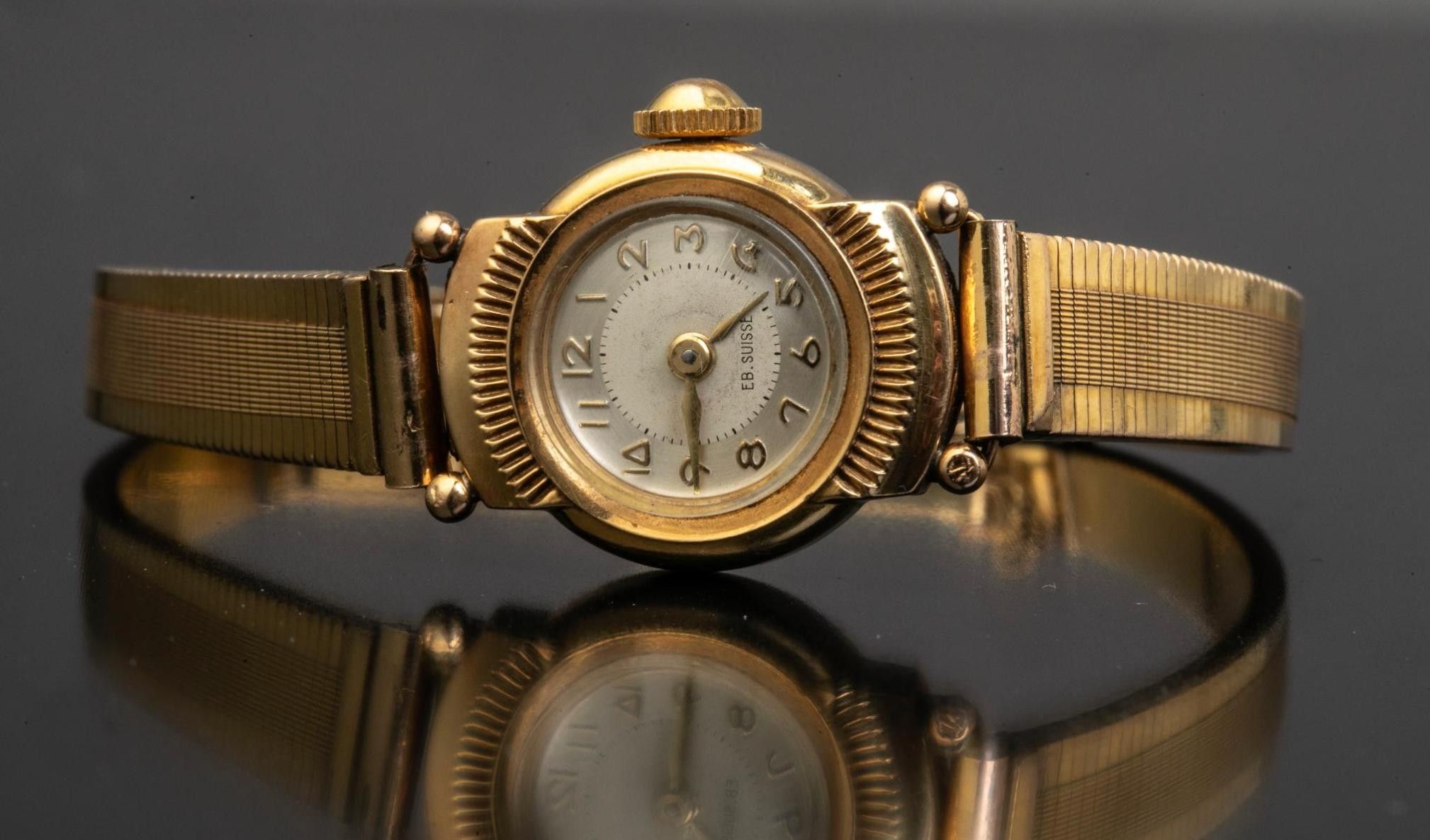 Ladies' wristwatch in yellow gold 750 thousandths, round dial with cream background marked EB SUISSE Roman numerals for the hours and railways, numbered 1319 on the back