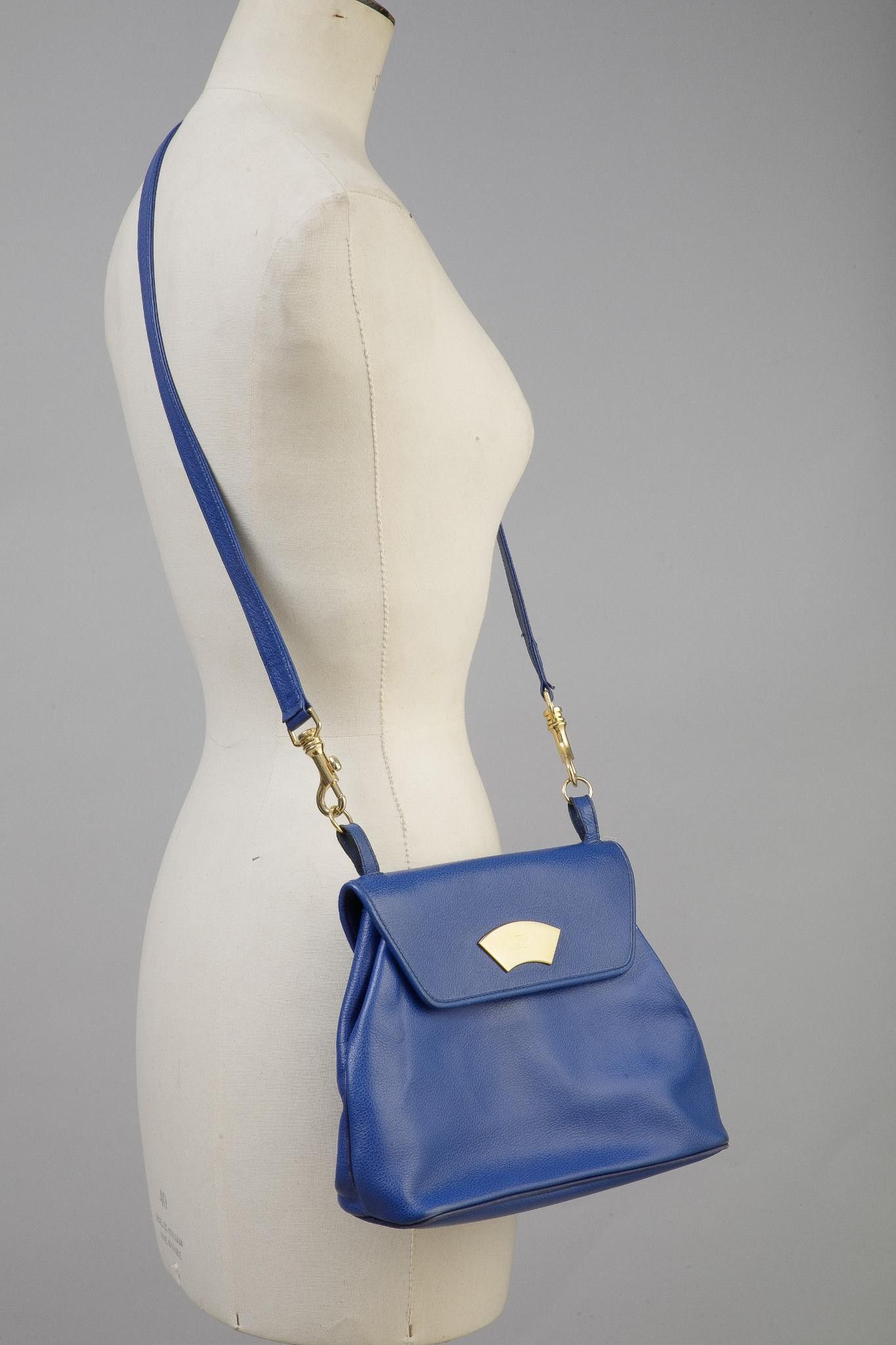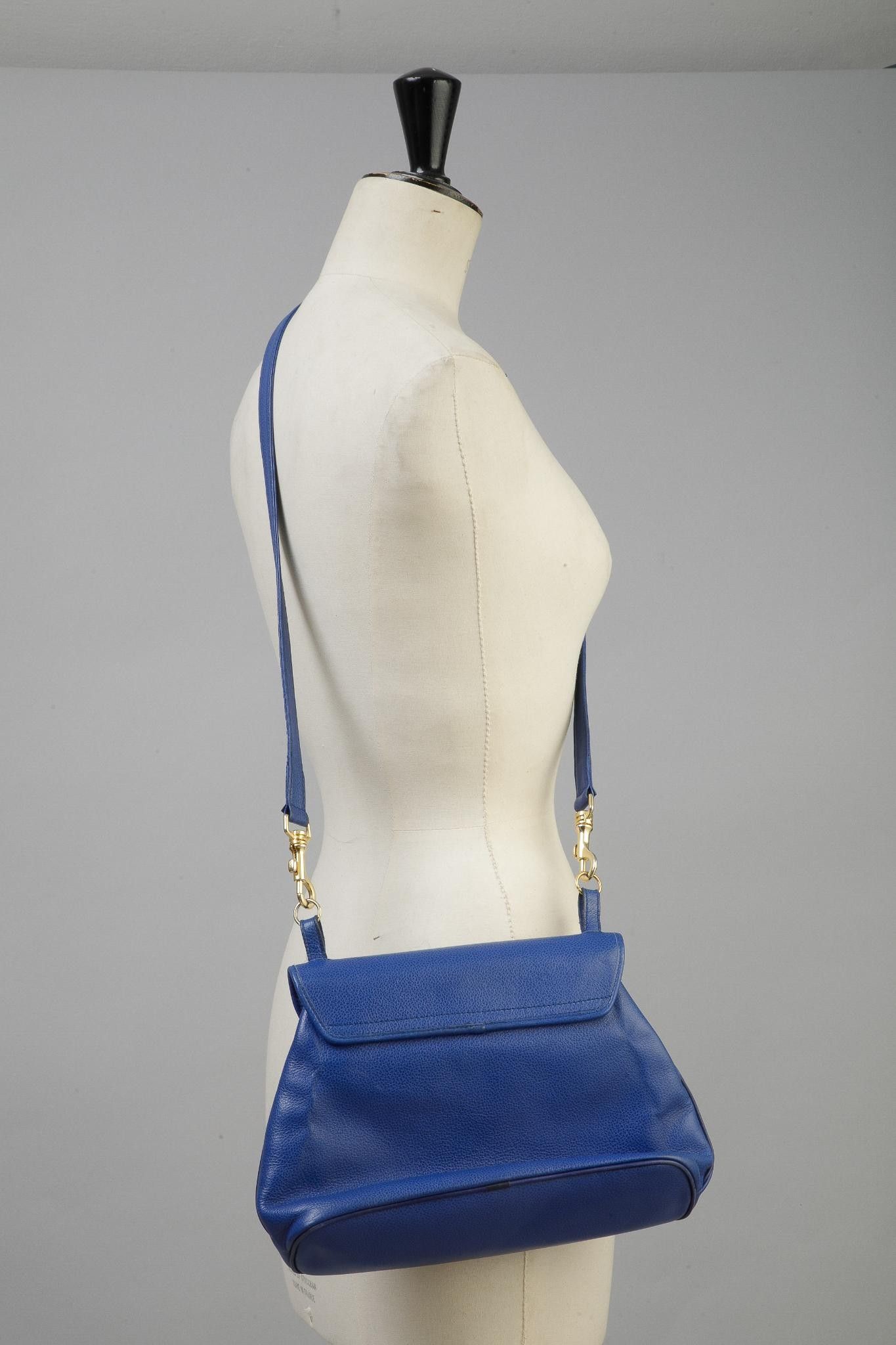 BAG with trapezoid flap in purplish-blue leather, adorned with a gilded fan-shaped clasp engraved with the initials "KL", removable shoulder strap.