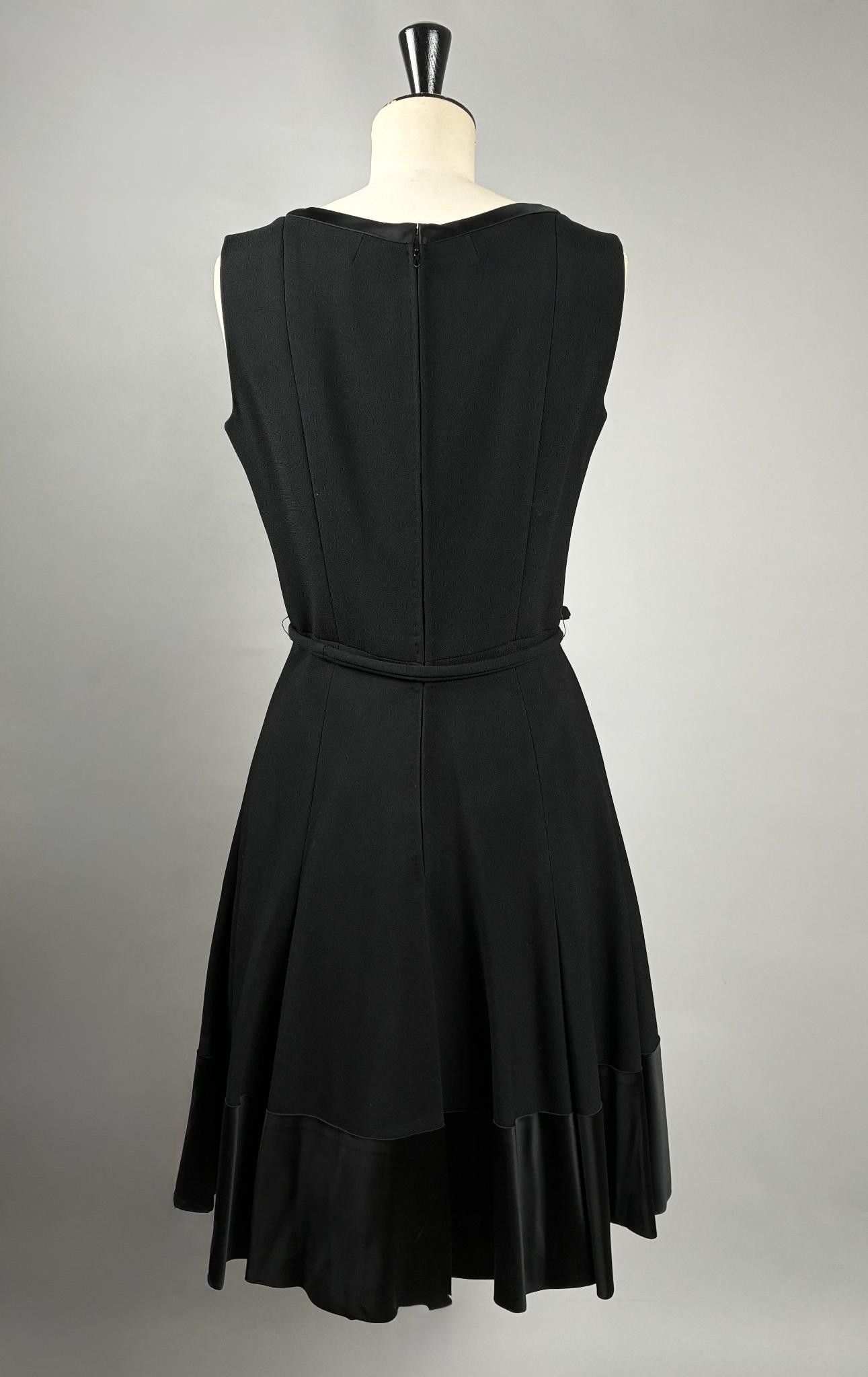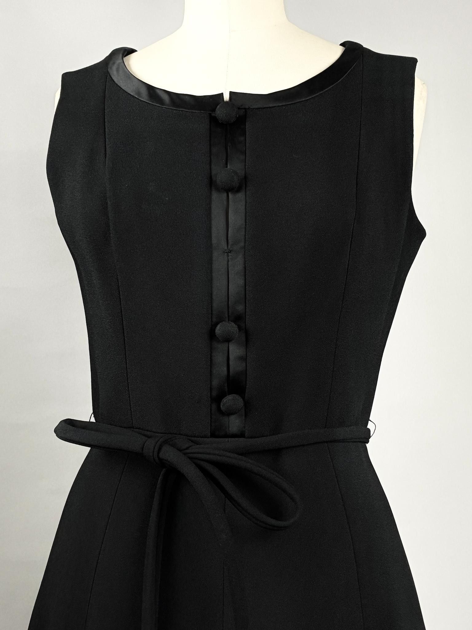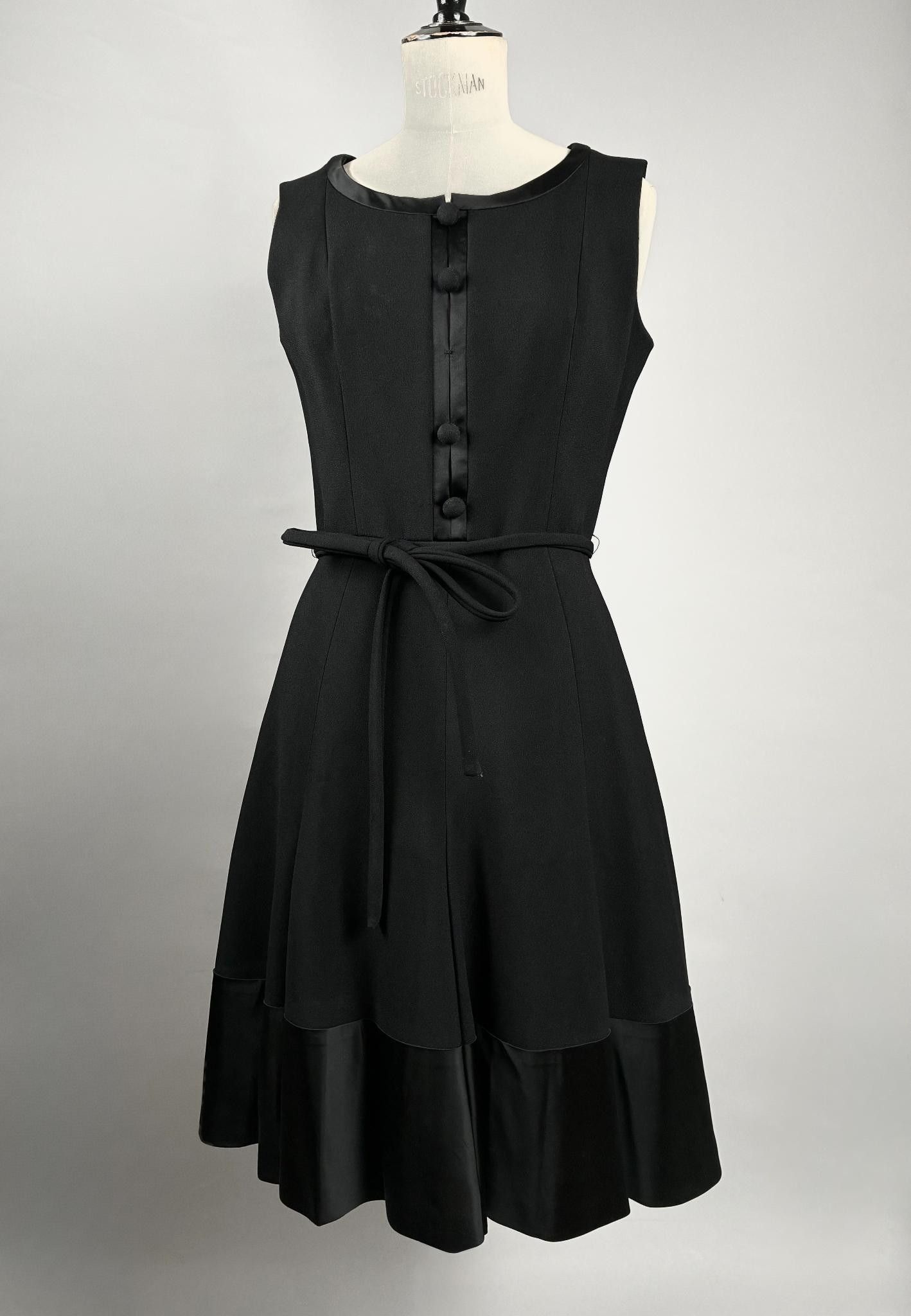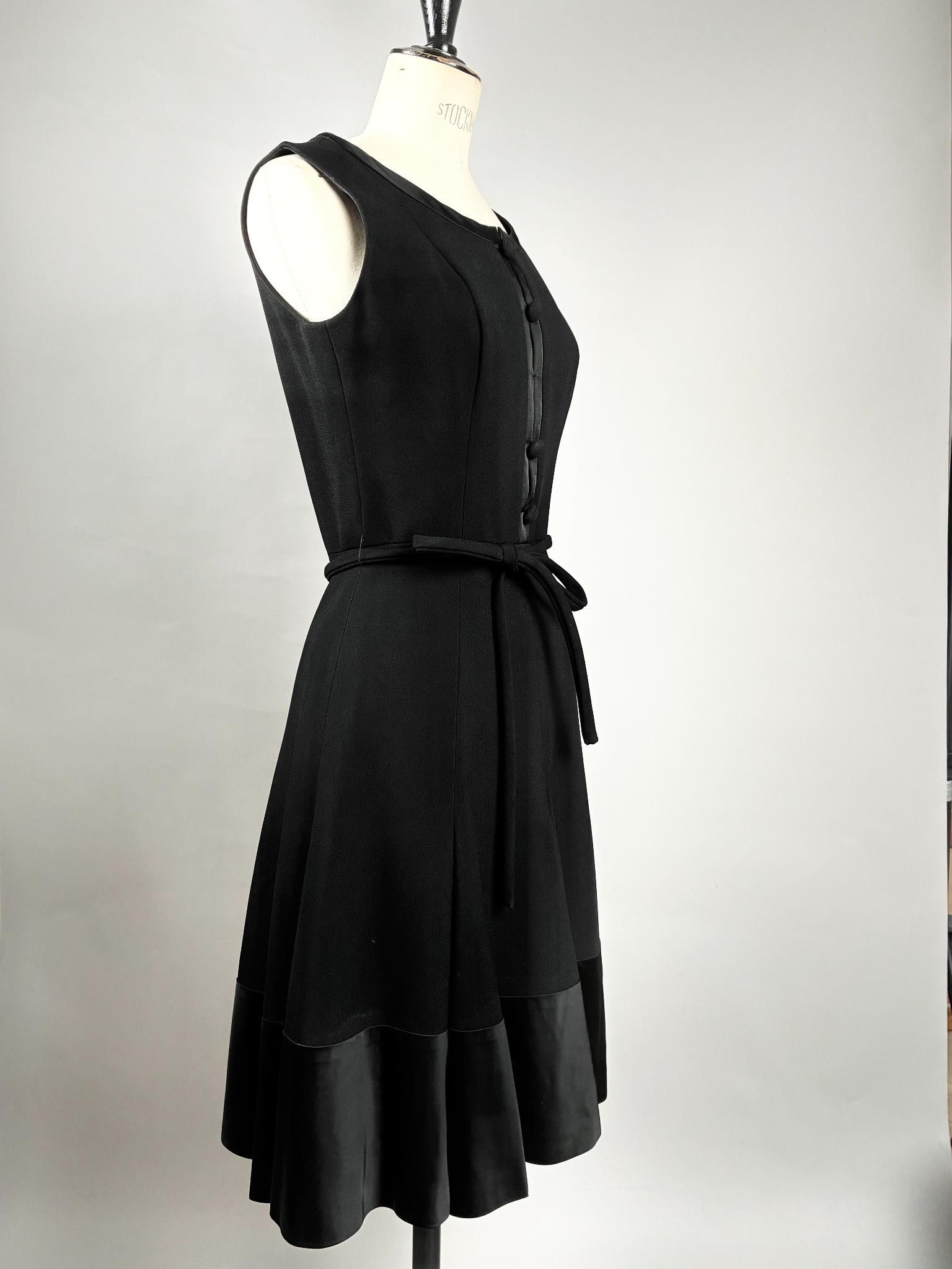 Belted cocktail dress in heavy black jersey trimmed on all sides with black satin, identical buttons
