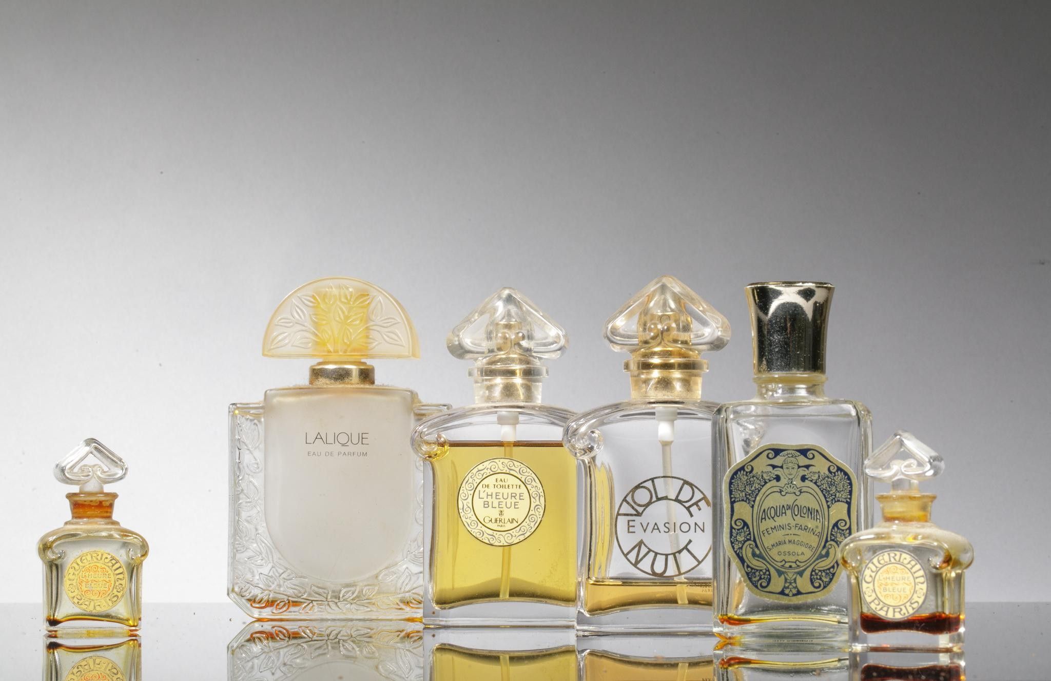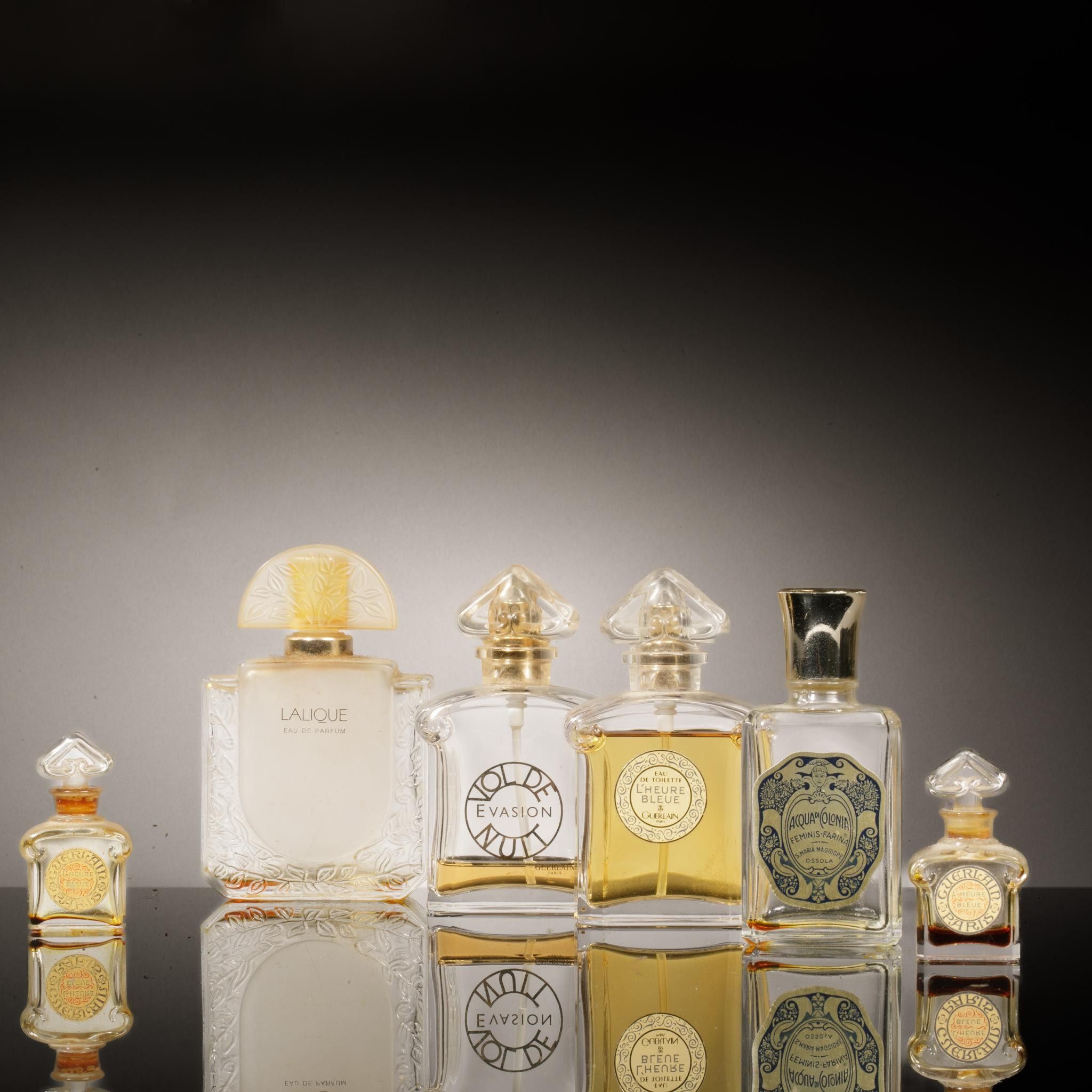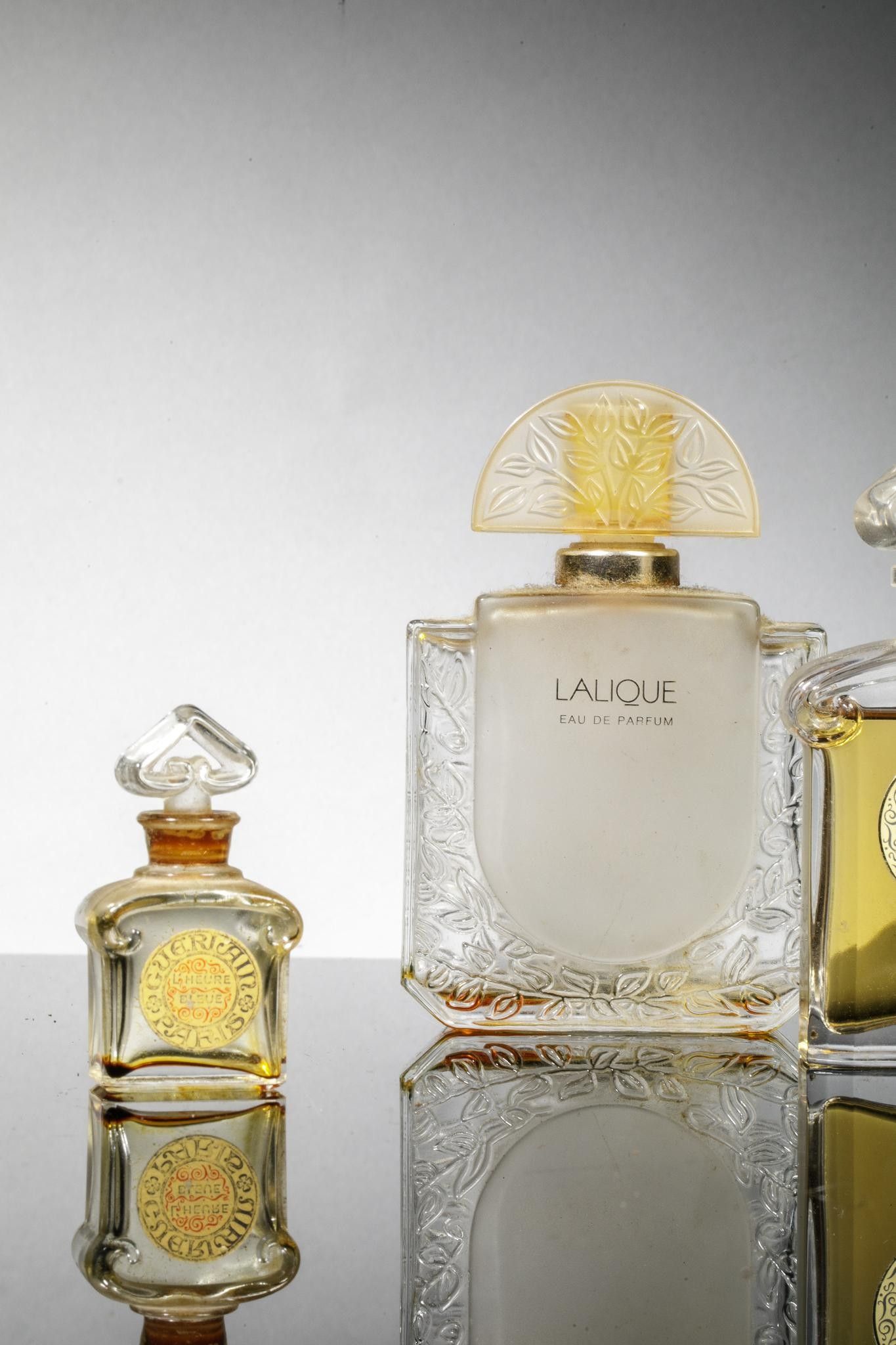 Three perfume bottles are included, one GUERLAIN Vol de l'Evasion in the same model, one LALIQUE in sandblasted glass and foliage motifs, and the other Acqua di Colonia de Santa Mara Maggiore in translucent glass and gilded stopper.