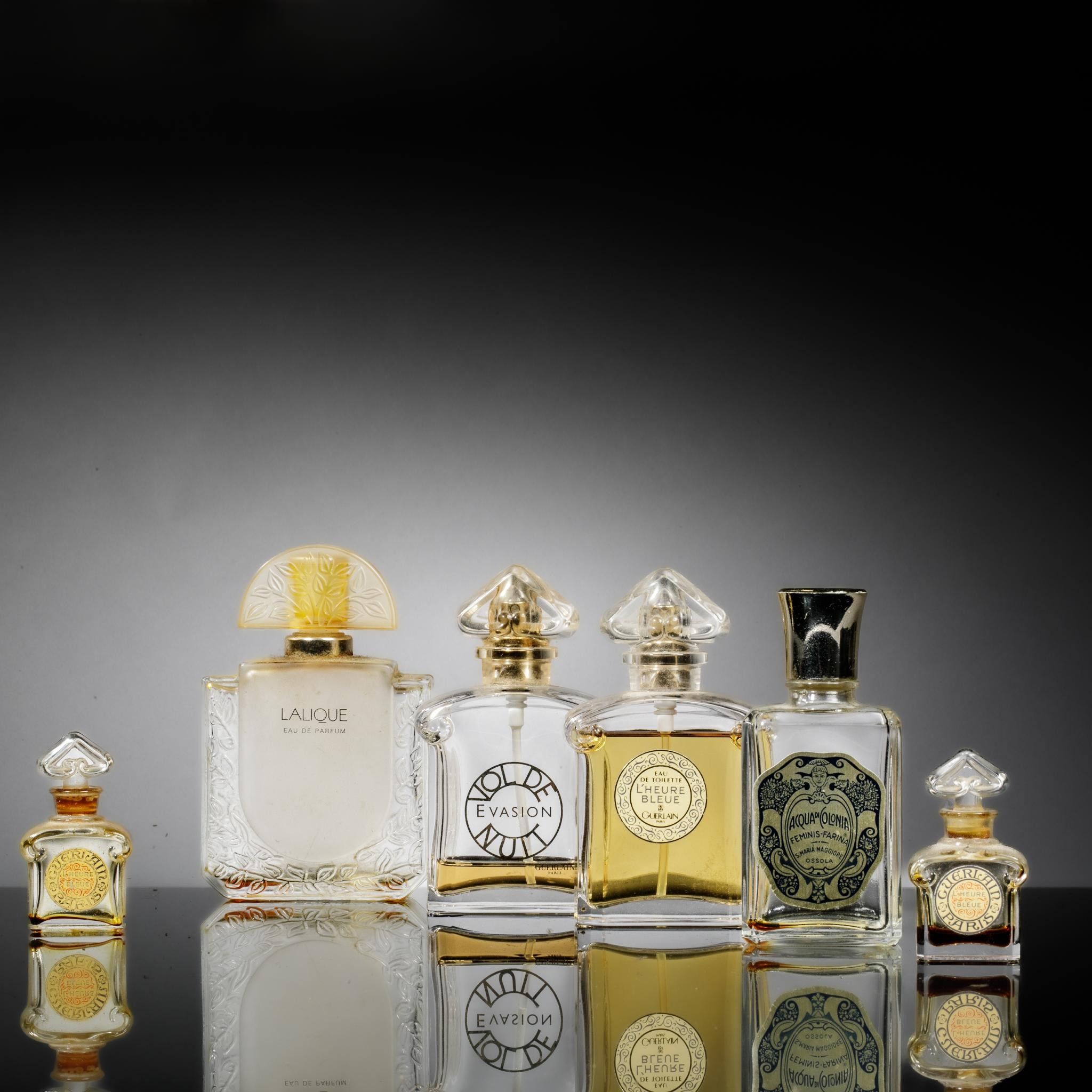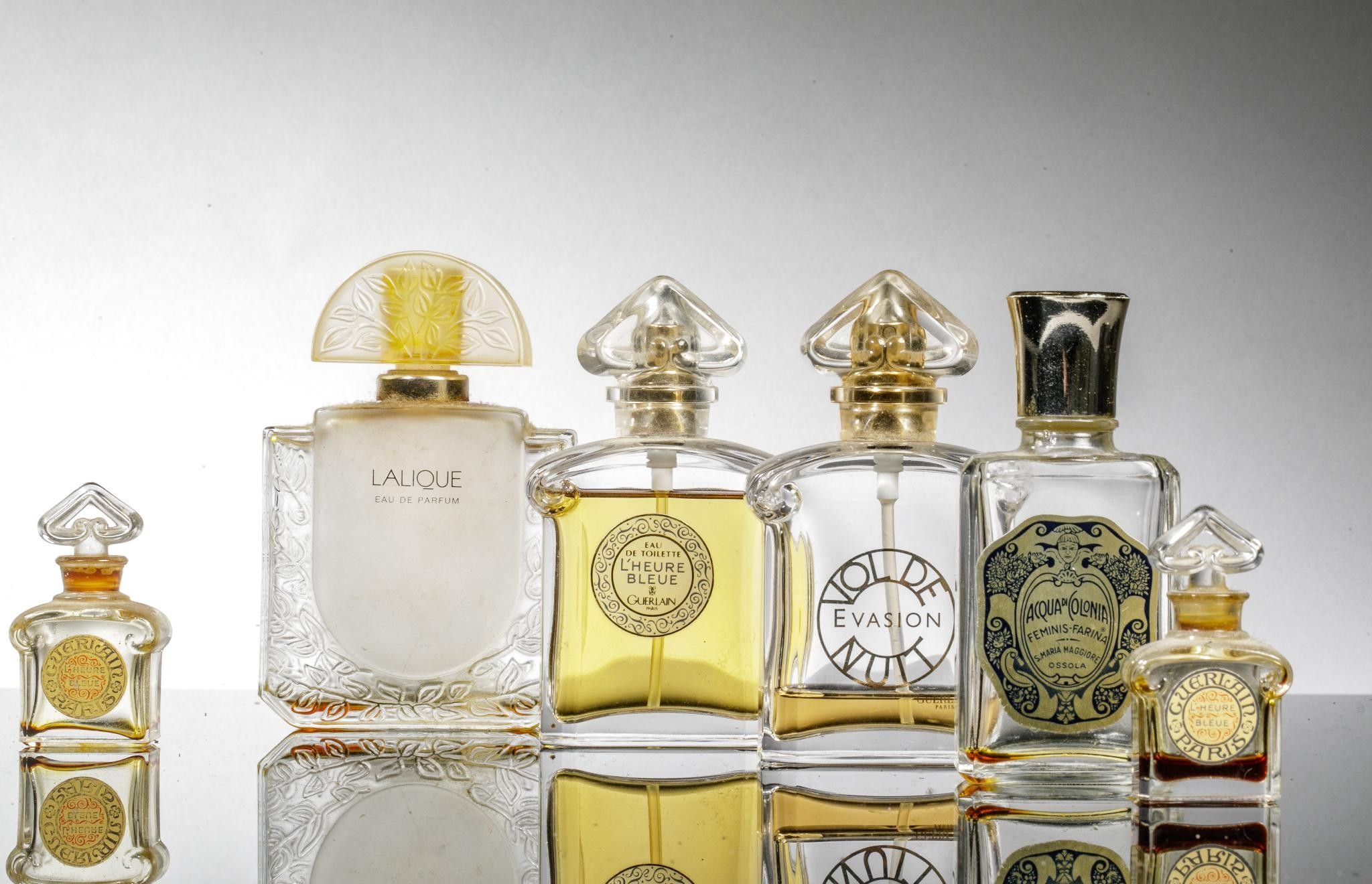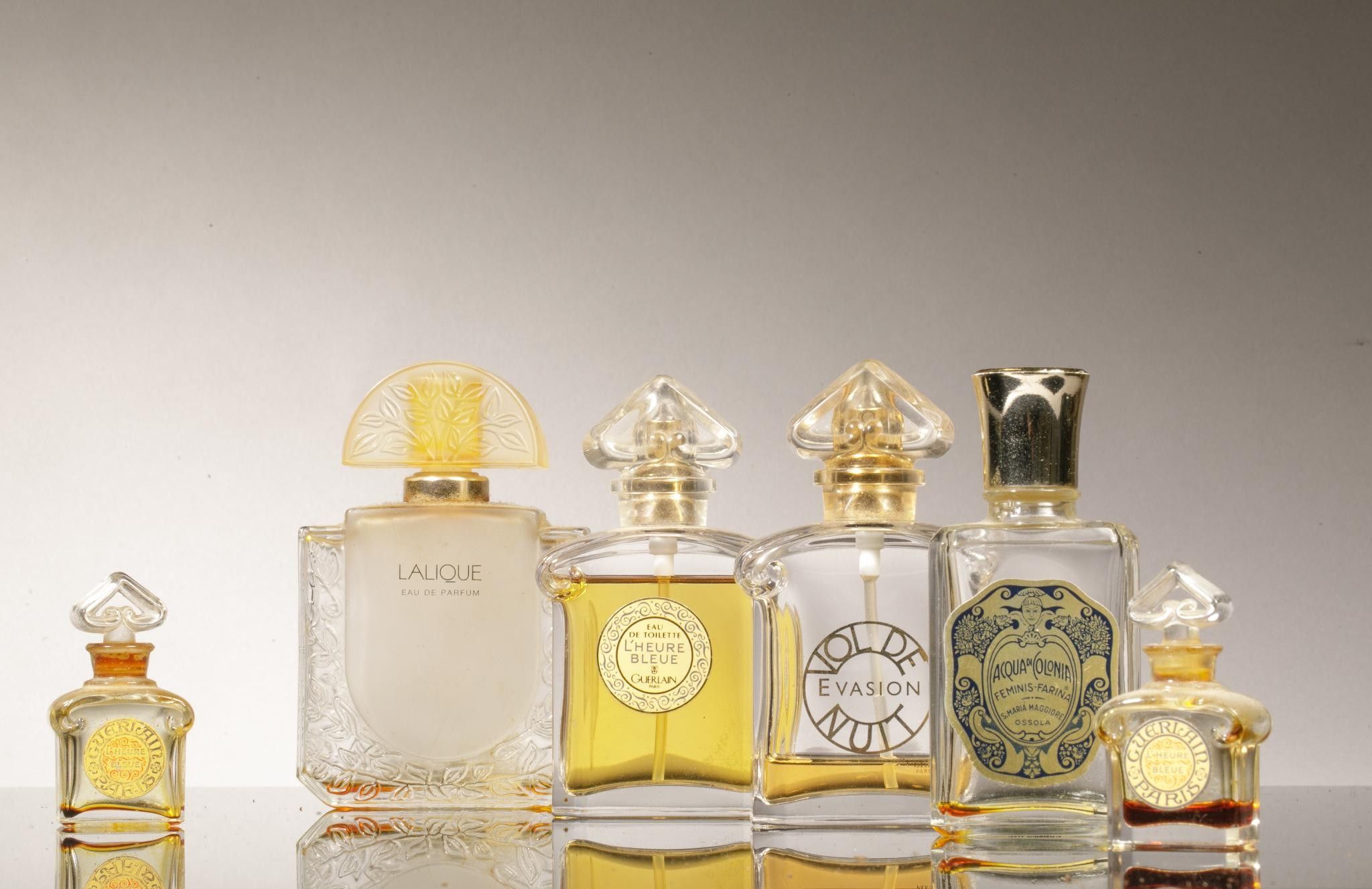 Three perfume bottles are included, one GUERLAIN Vol de l'Evasion in the same model, one LALIQUE in sandblasted glass and foliage motifs, and the other Acqua di Colonia de Santa Mara Maggiore in translucent glass and gilded stopper.