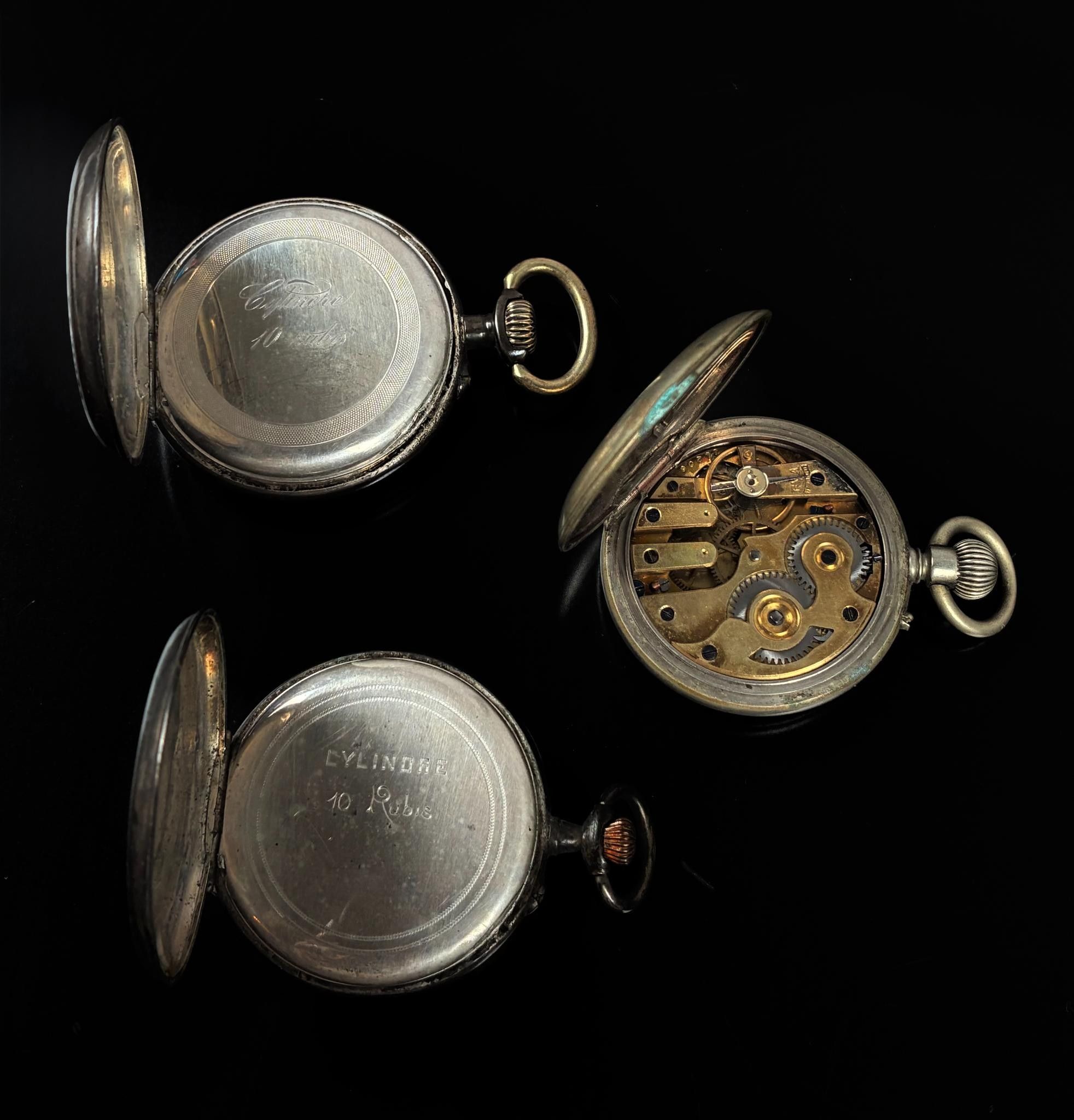 Set of four pocket watches, two in silver (crab hallmark and wild boar hallmark) and two in silver-plated metal, one of which is an Esto stopwatch.