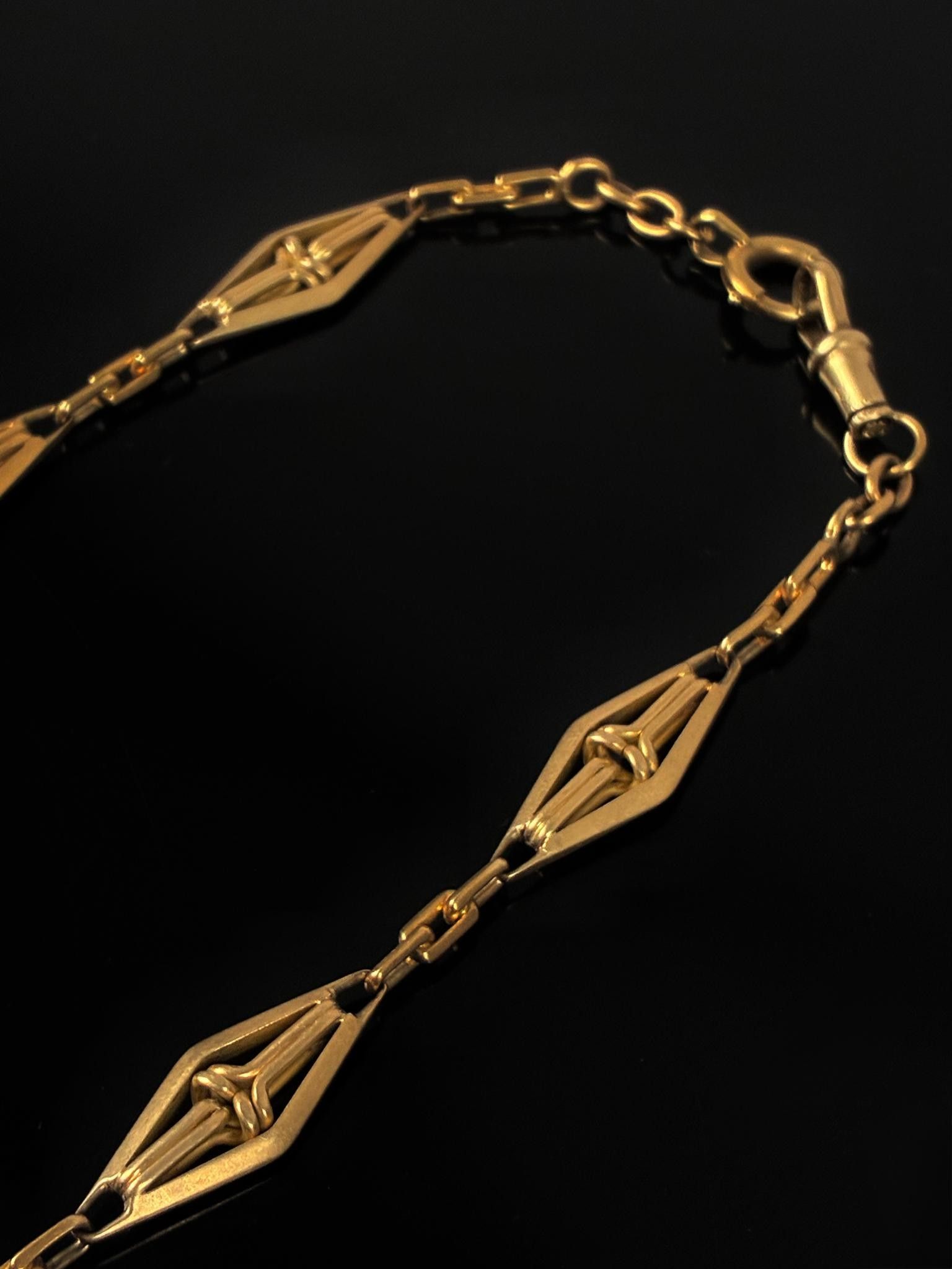 Waistcoat watch chain in 750 thousandths yellow gold (eagle head hallmark), diamond-shaped links with lobster clasp
