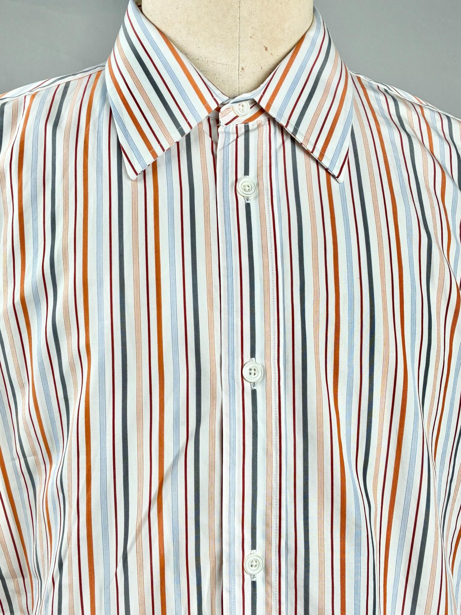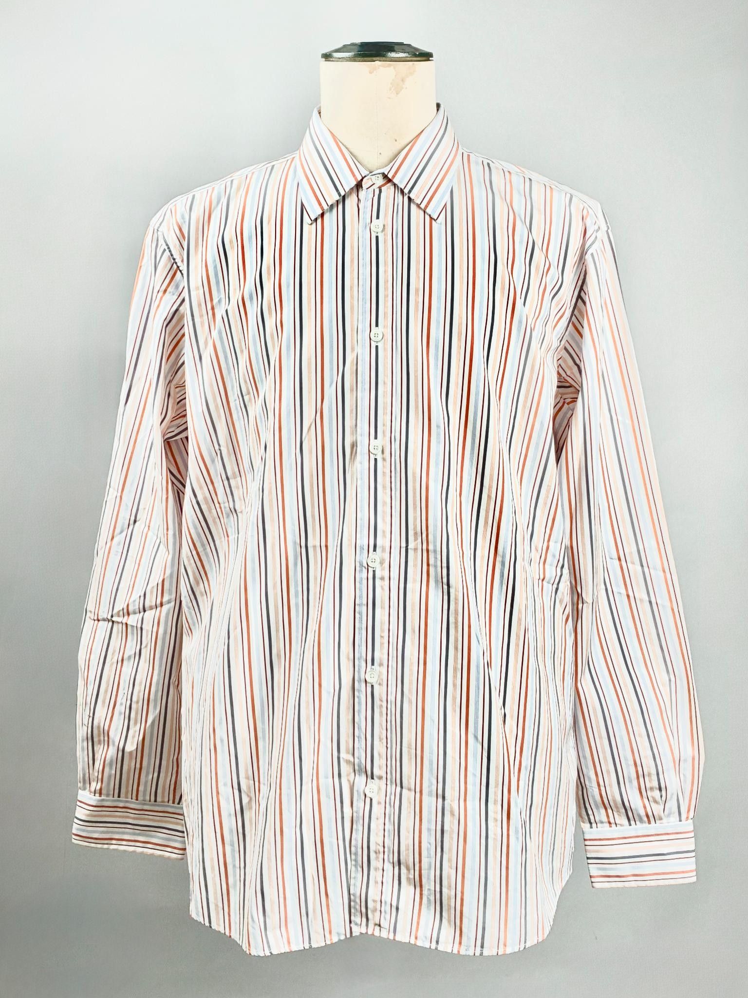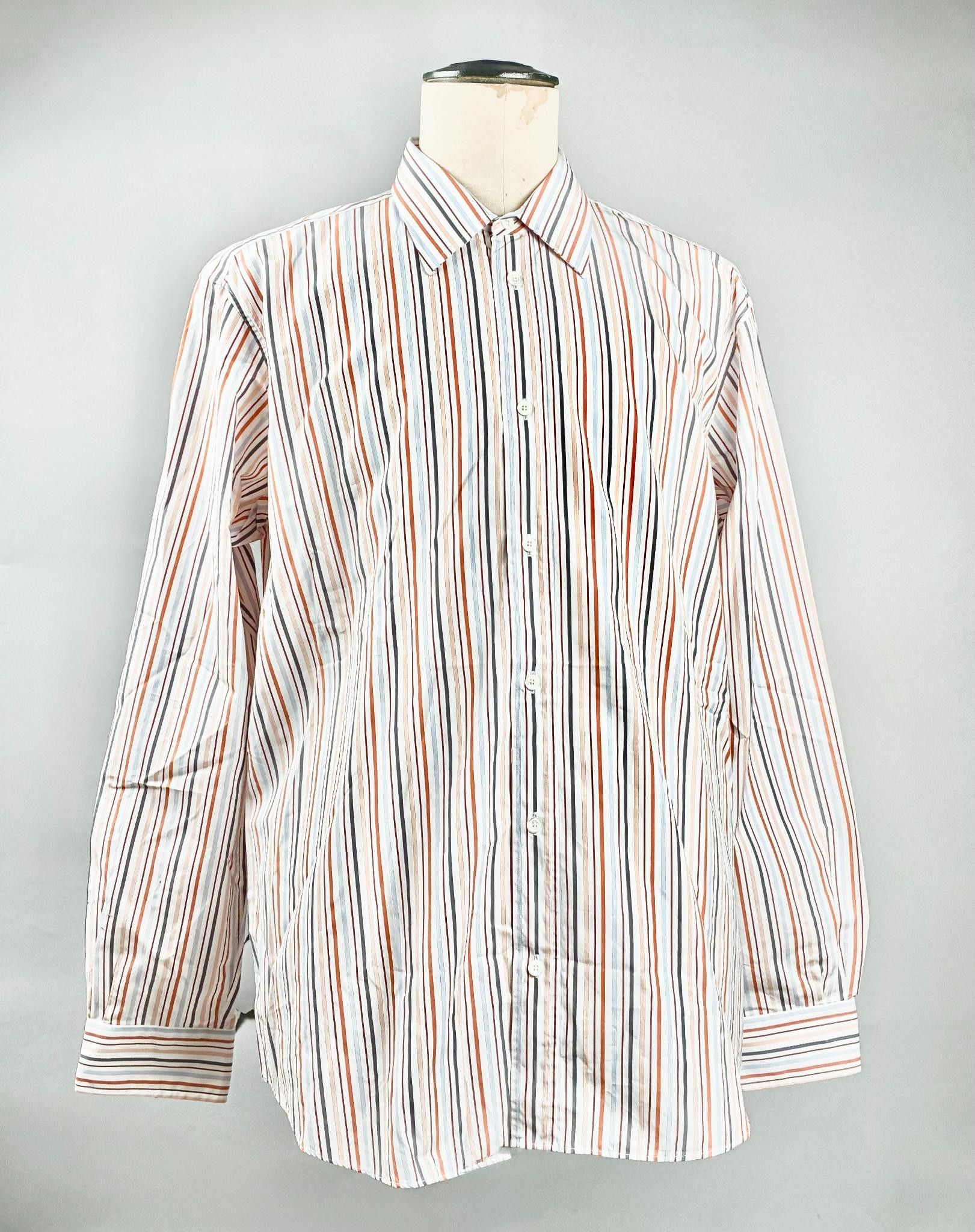 Long-sleeved cotton shirt with light blue, burgundy, grey and orange house stripes, buttons signed