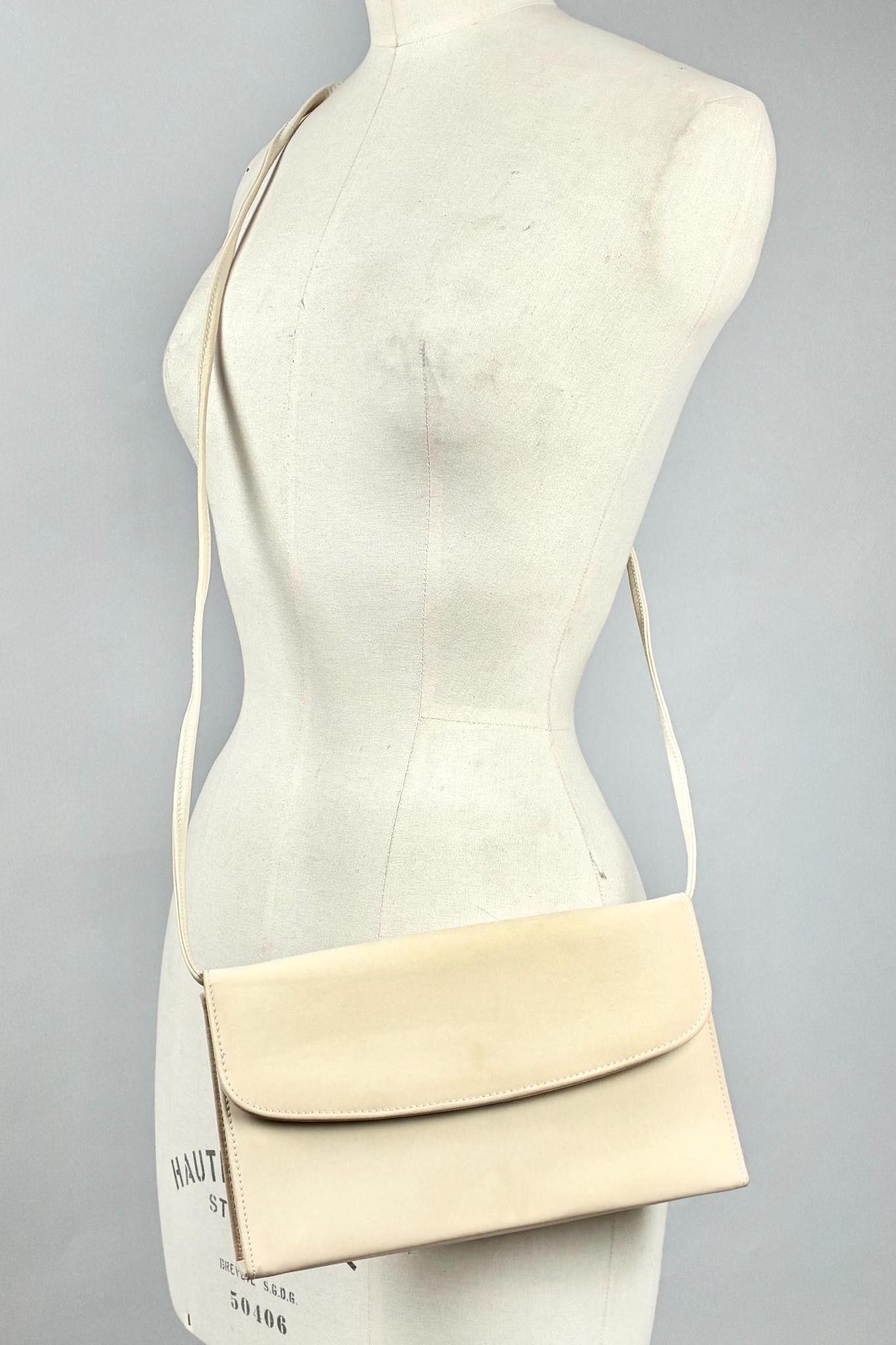 Rectangular shoulder bag in beige fabric with black leather lining and zipped pocket