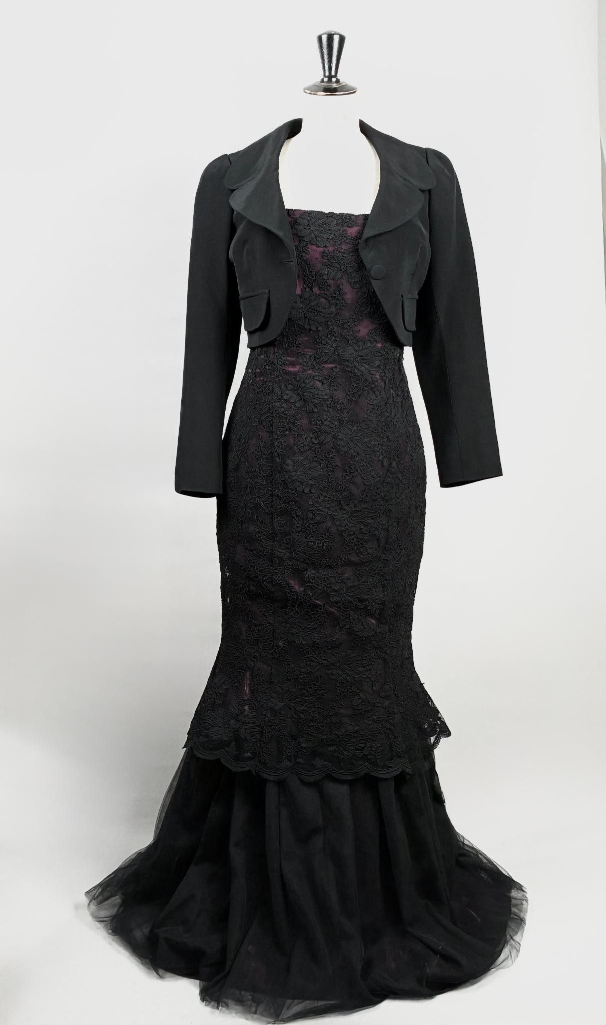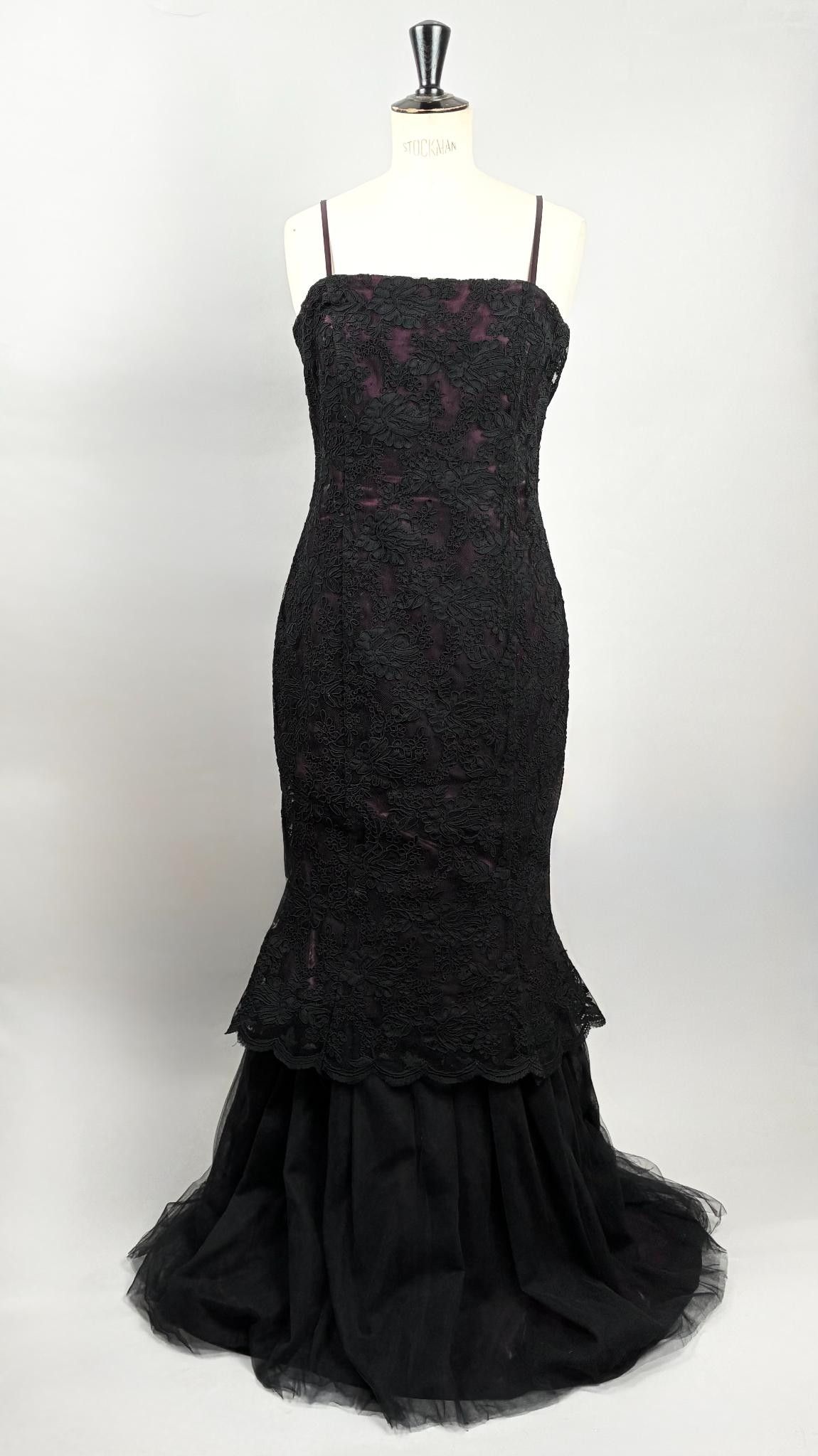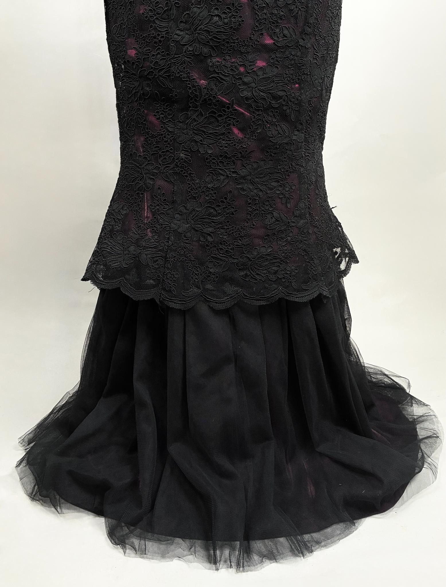 Strapless or bustier evening dress in plum, black lace and tulle Size 38 - 40