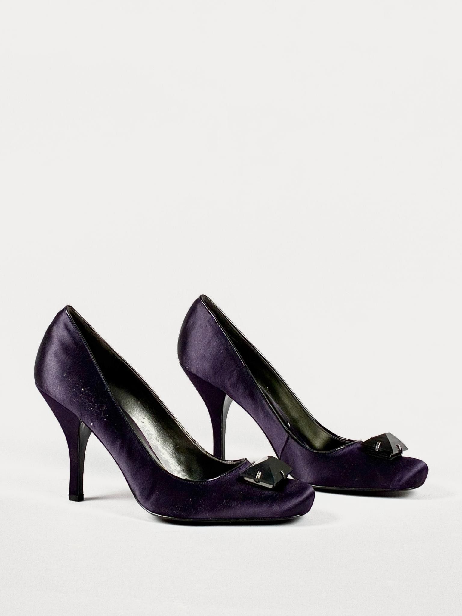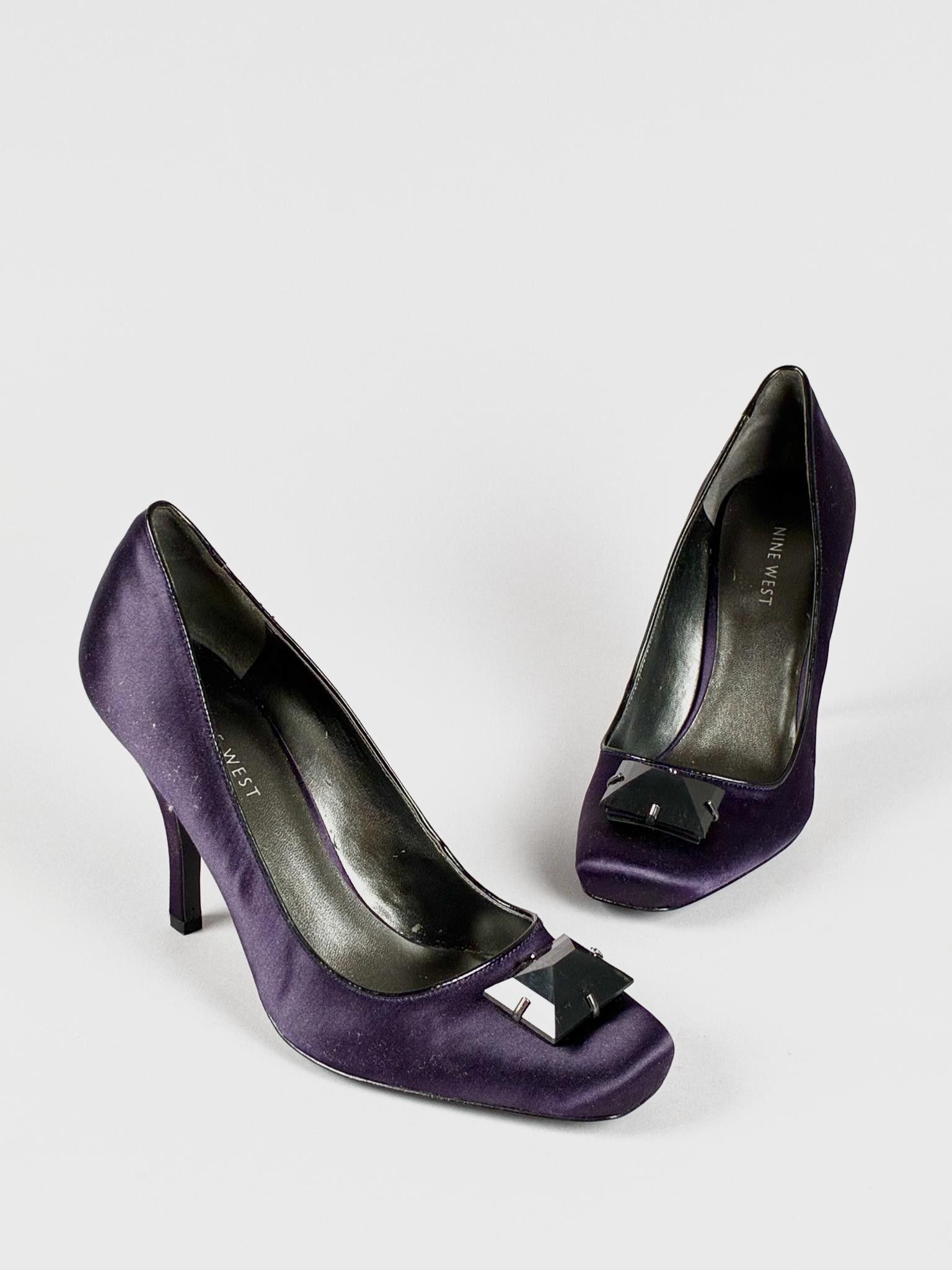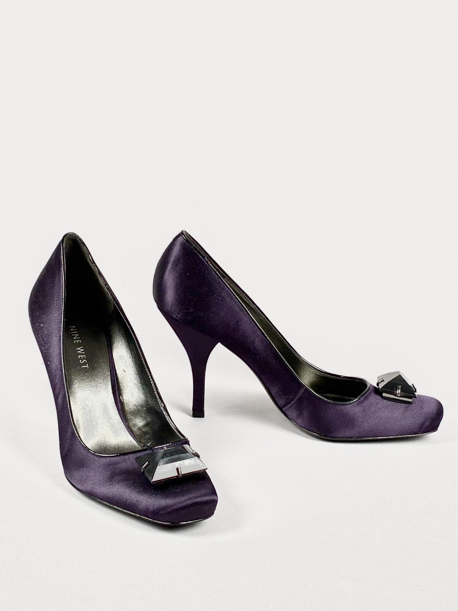 NINE WEST Pair of purple satin pumps with black stone appliq…