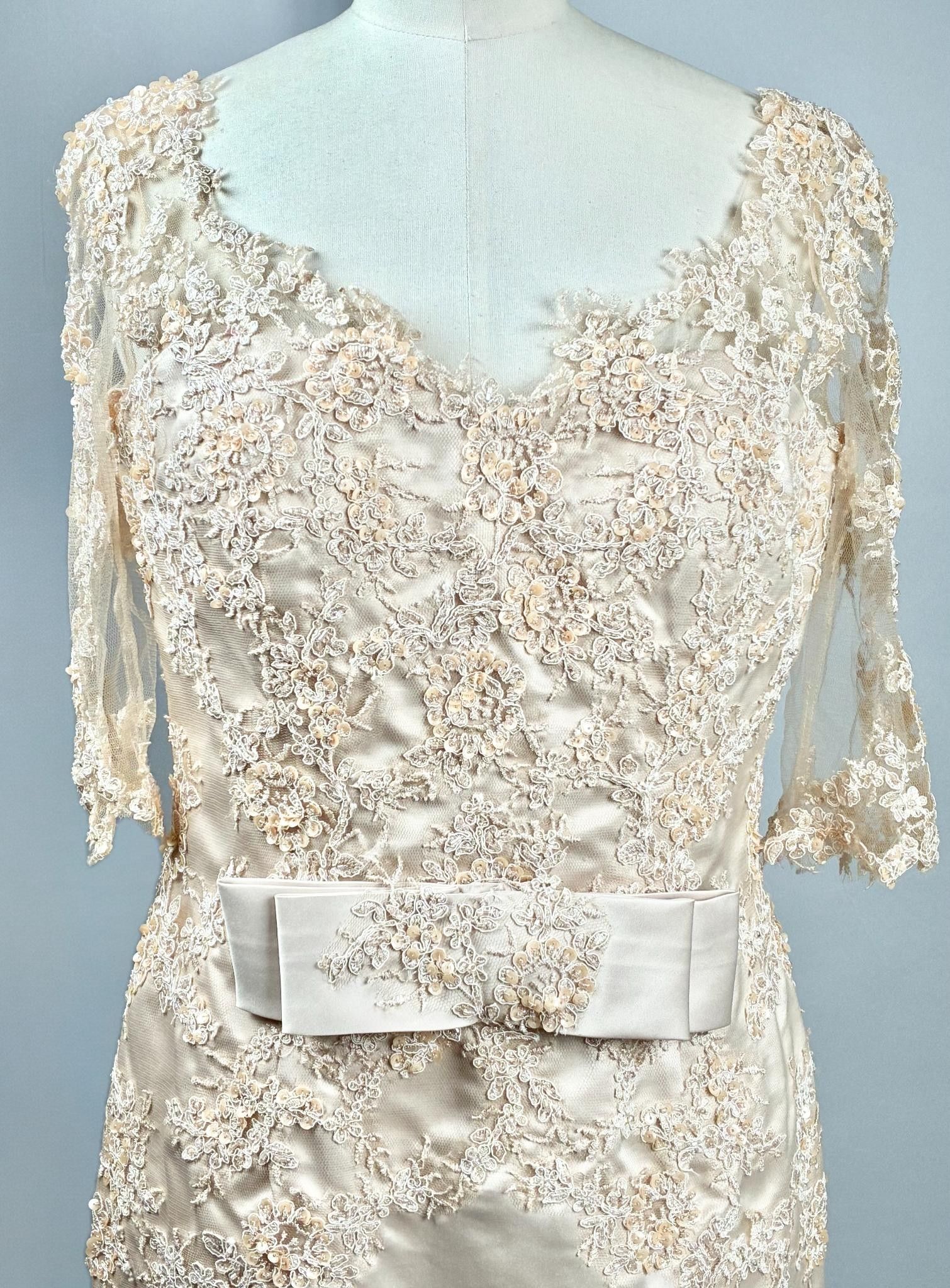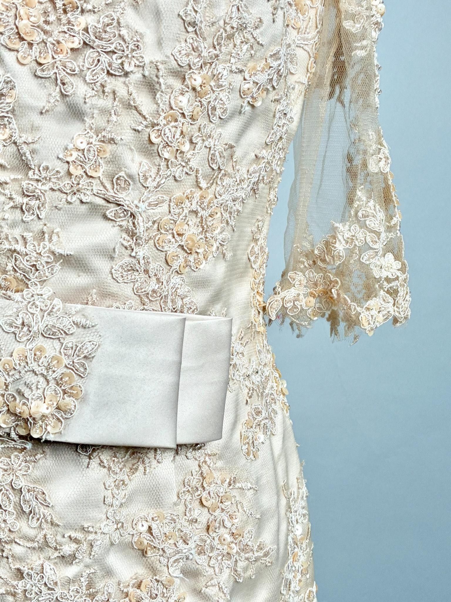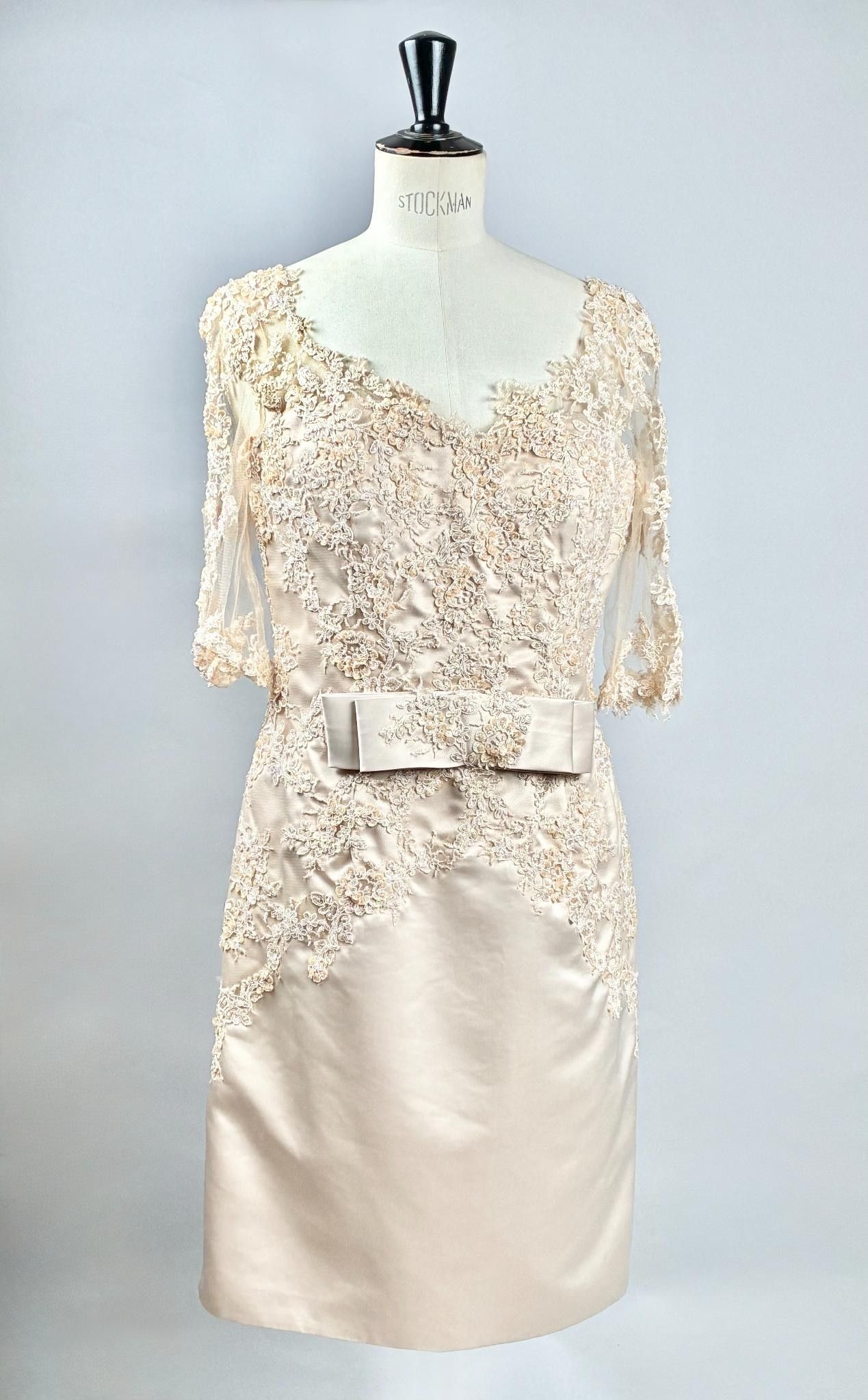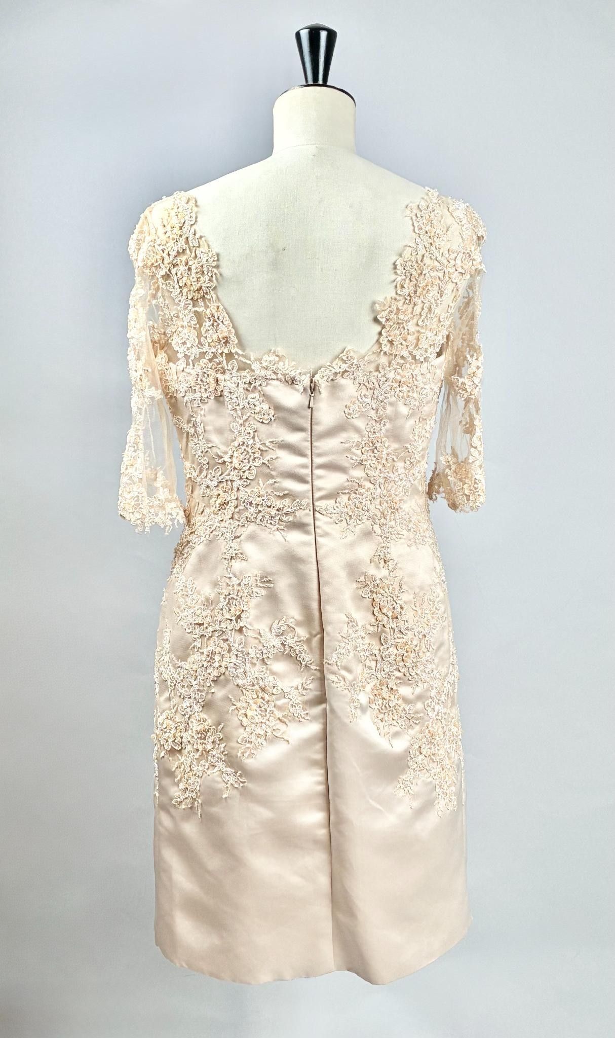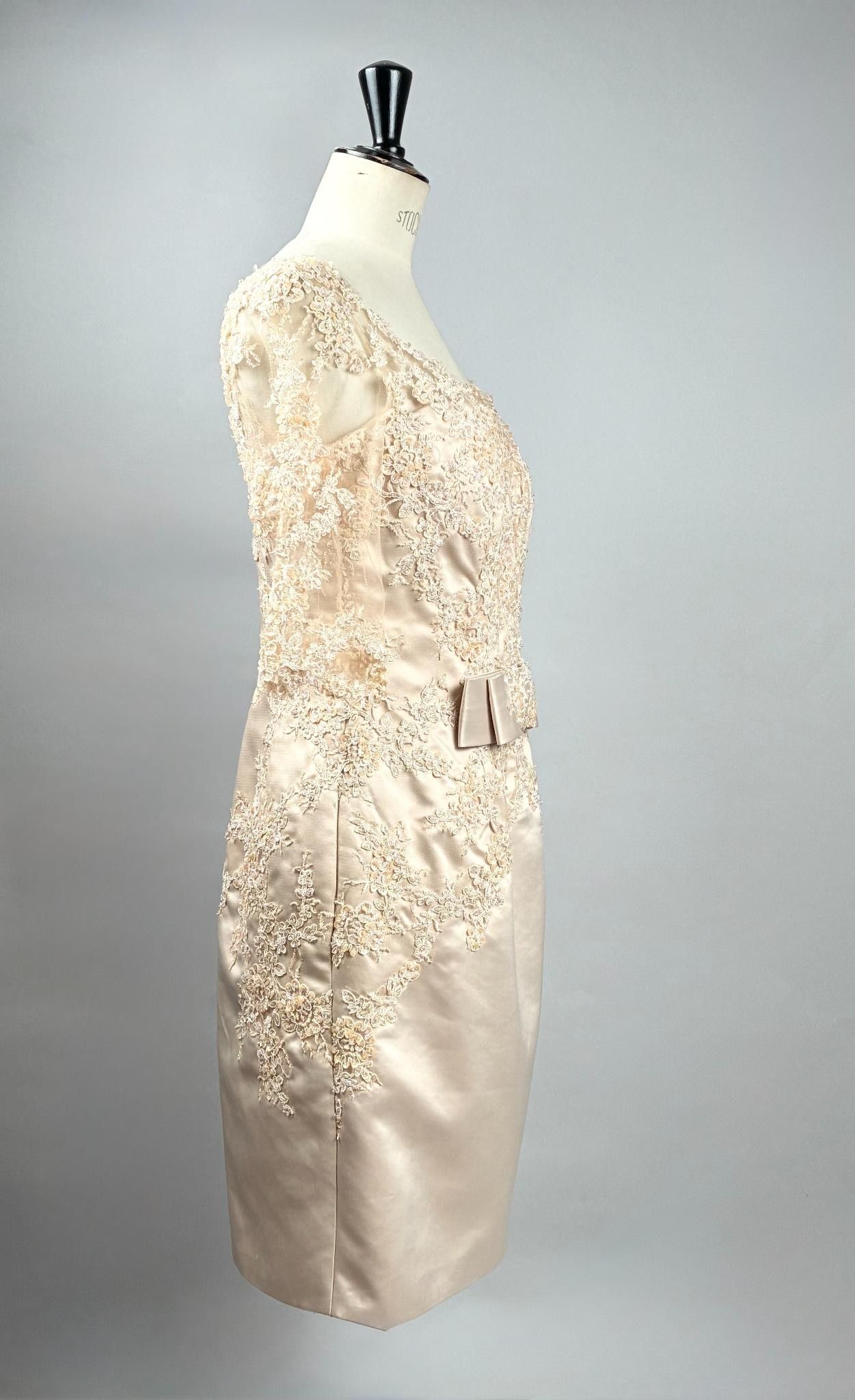 Short cocktail dress in beige fabric appliquéd with sequin and lace featuring flowers mid-length sleeves appliquéd with a bow