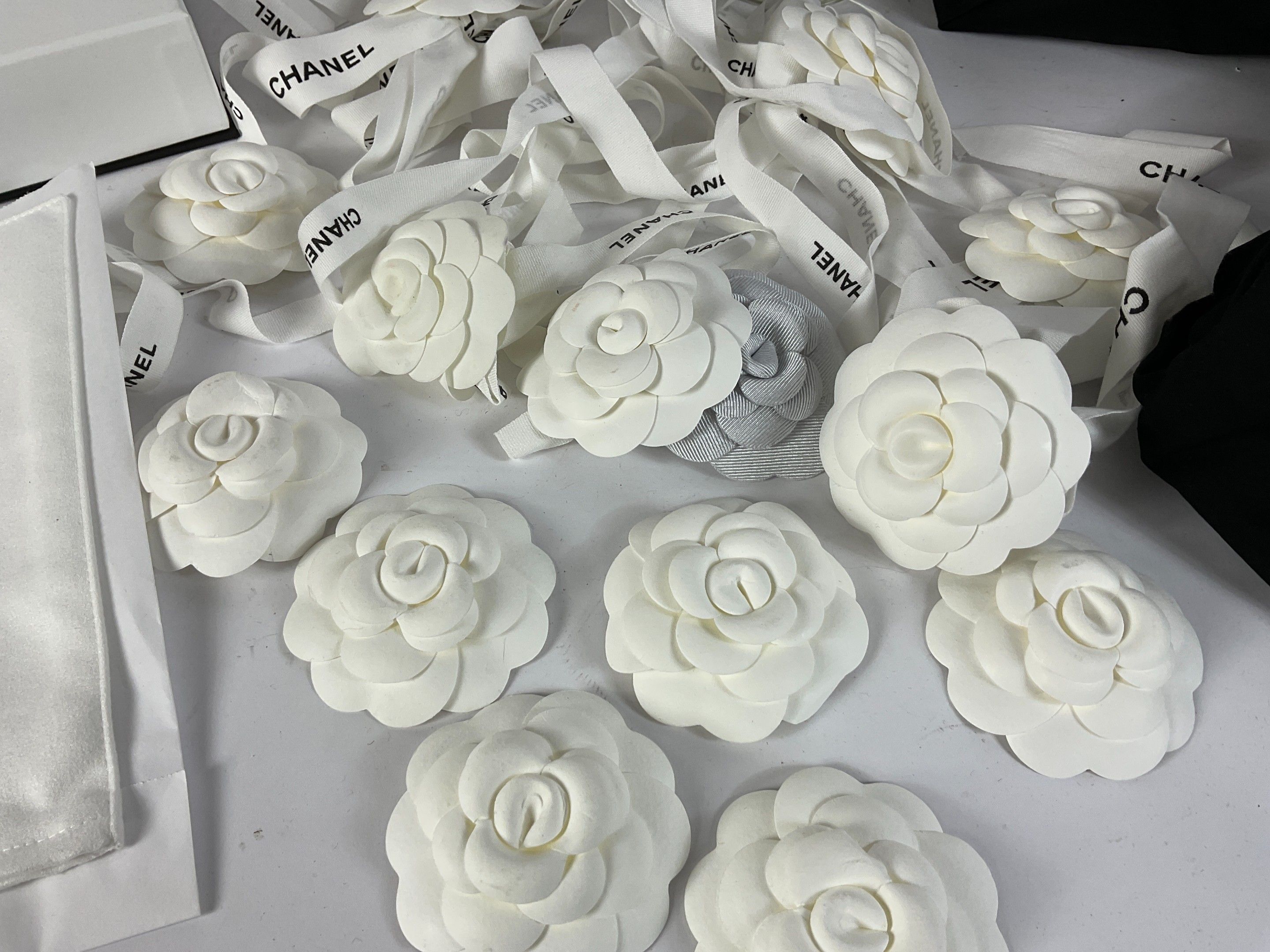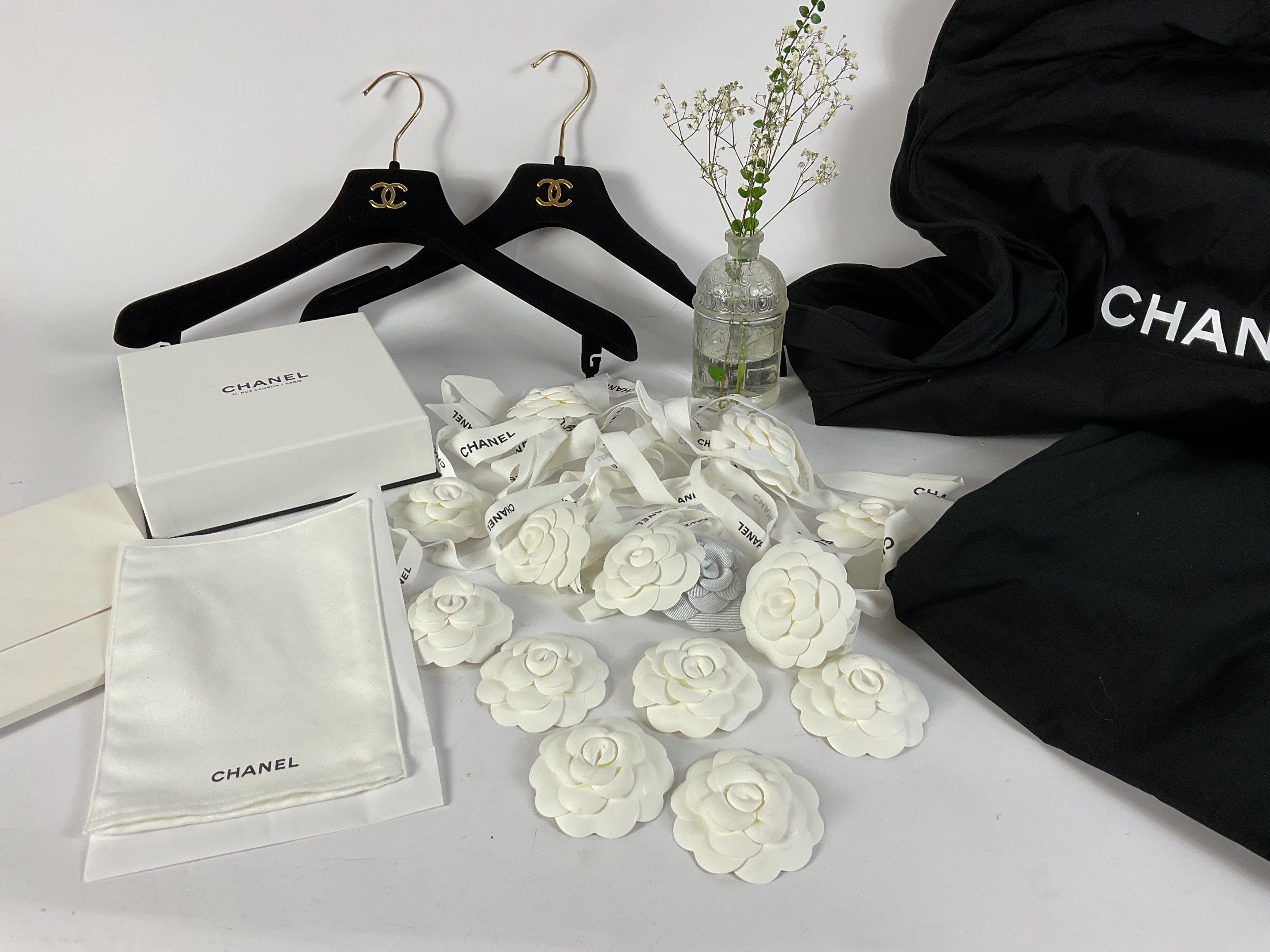 Chanel - Packaging Lot of packaging, including : Two garment bags; Two hangers; One box; One Chanel & moi pouch; One set of approximately fourteen camelia and ribbons; 20 pieces approx.