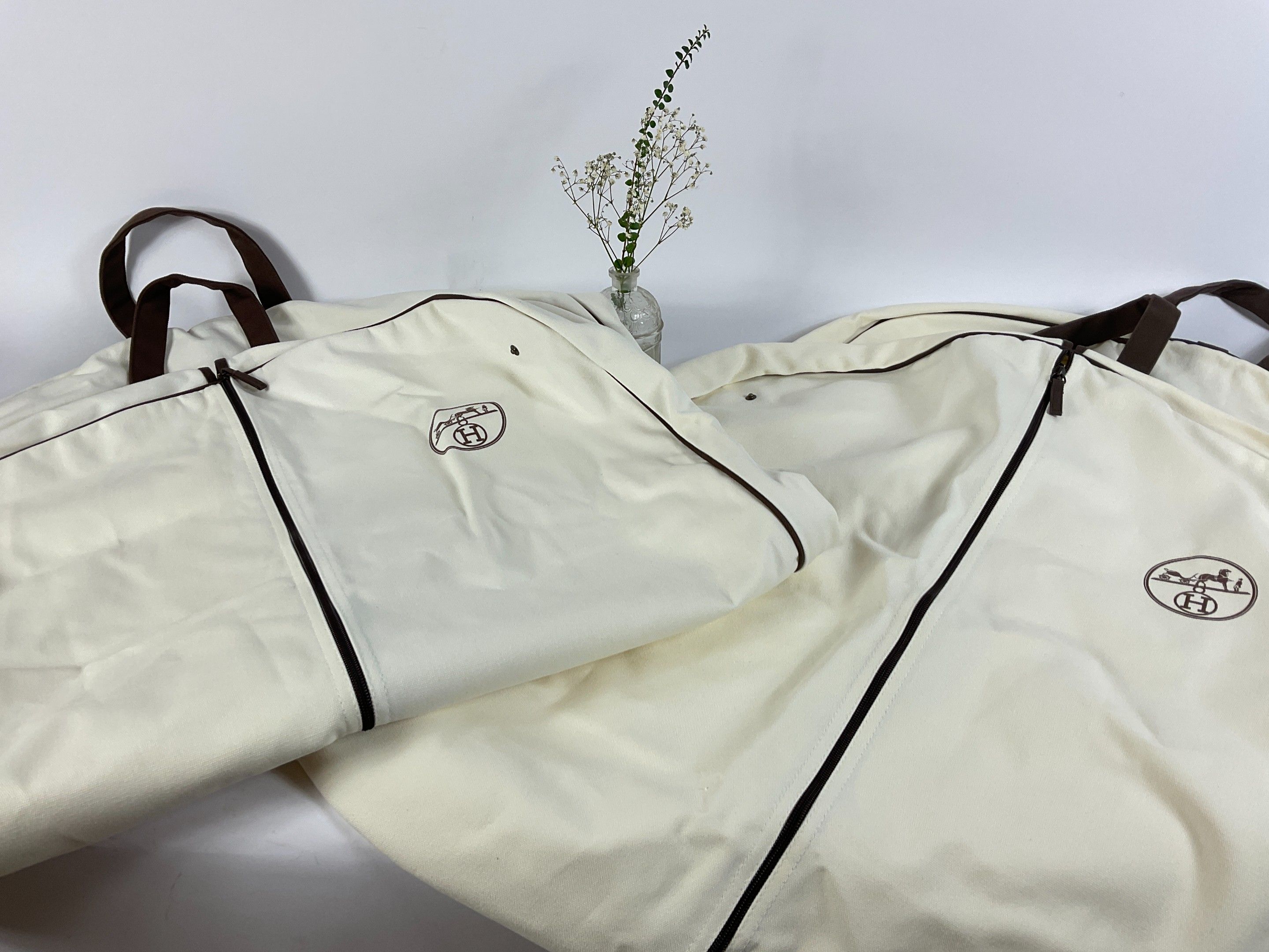 Hermès Paris - Packaging Set of packaging, including two large suit and dress covers, in unbleached canvas and brown zip, in two different sizes.