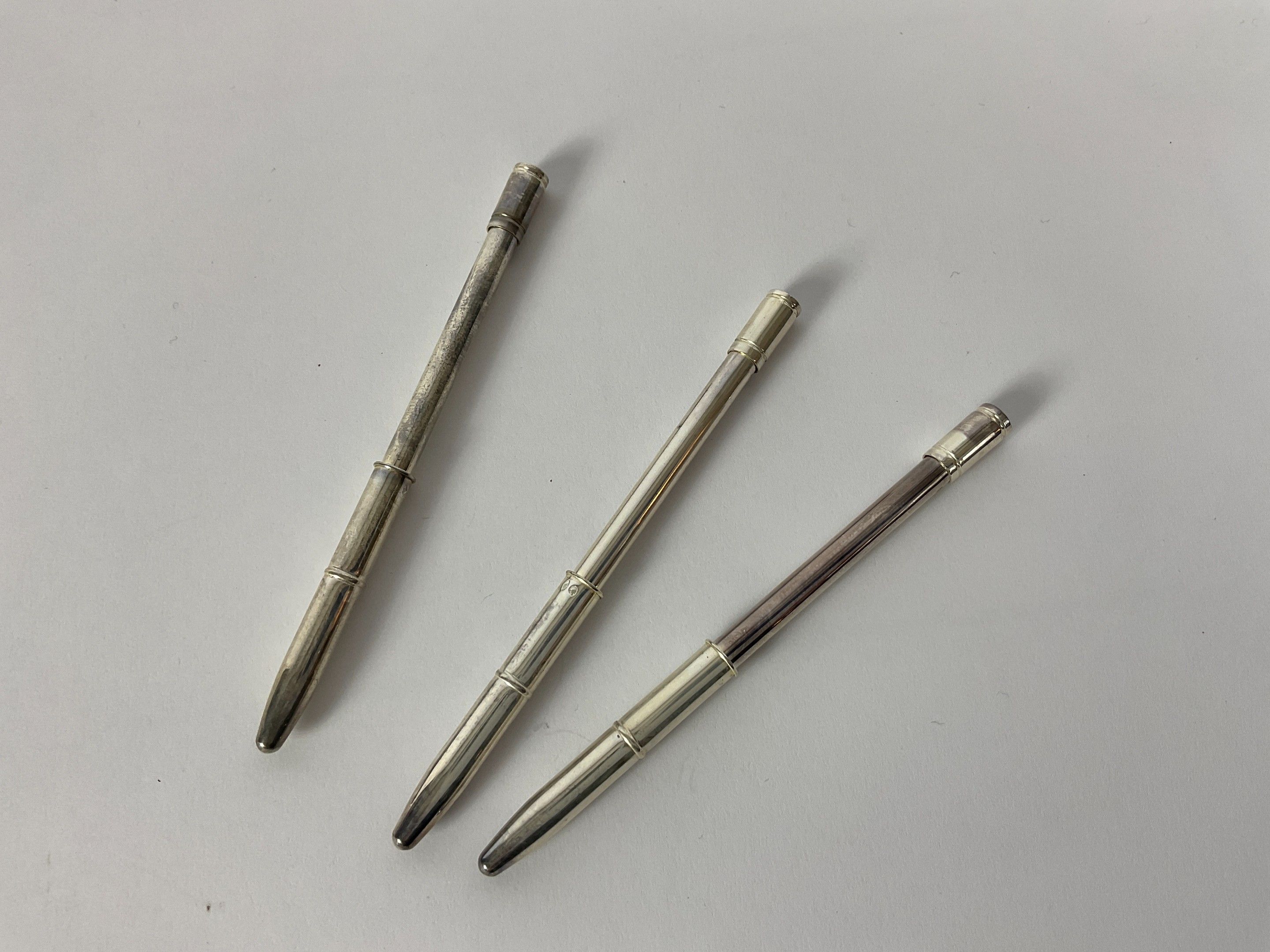10/ Hermès Paris Agenda pens Set of three 925/°°° silver mini mechanical pencils, CP (approx.): 17.65 g (with cap and without lead), Signed and in bag, L: 10.5 cm (as new)