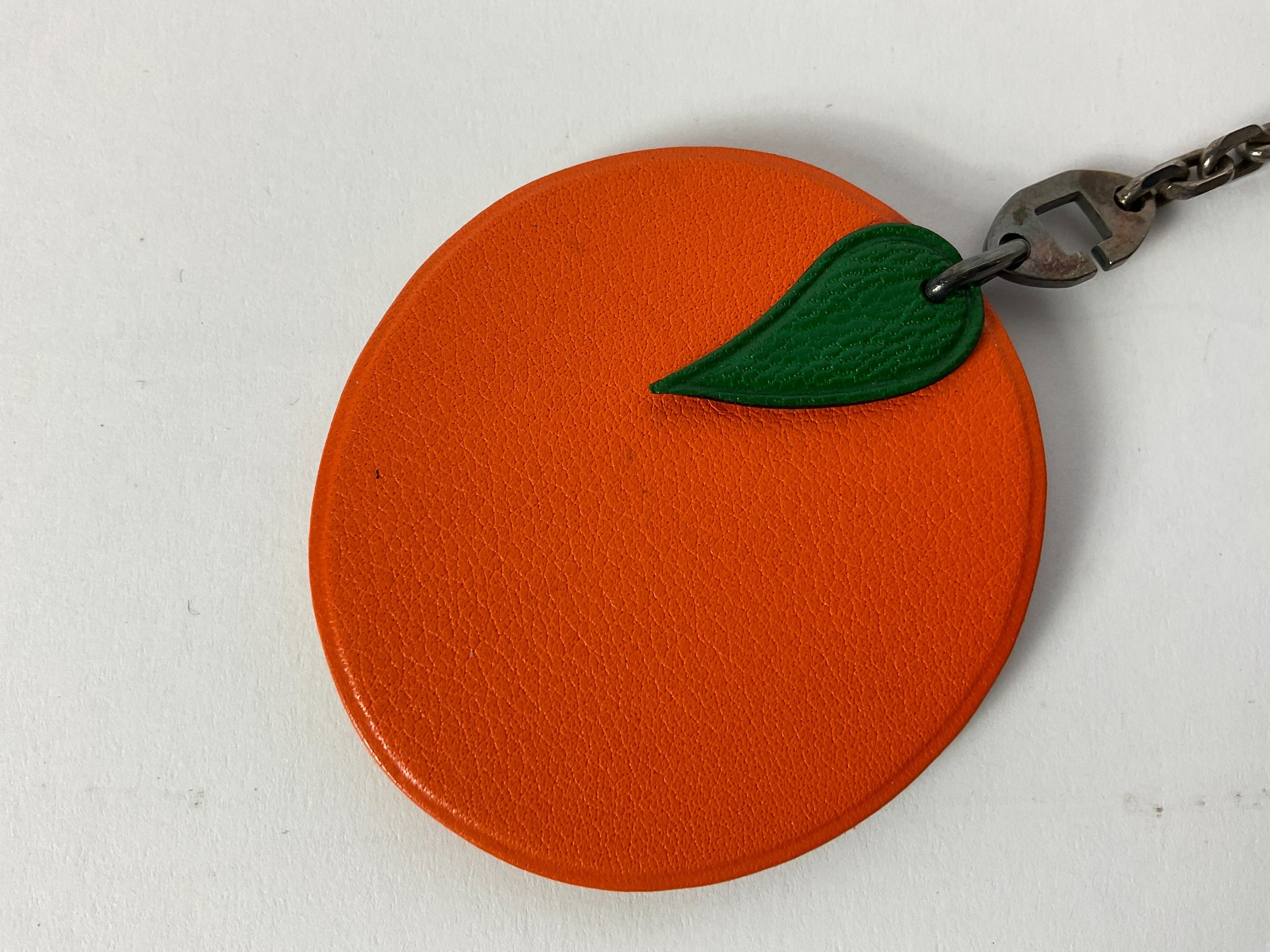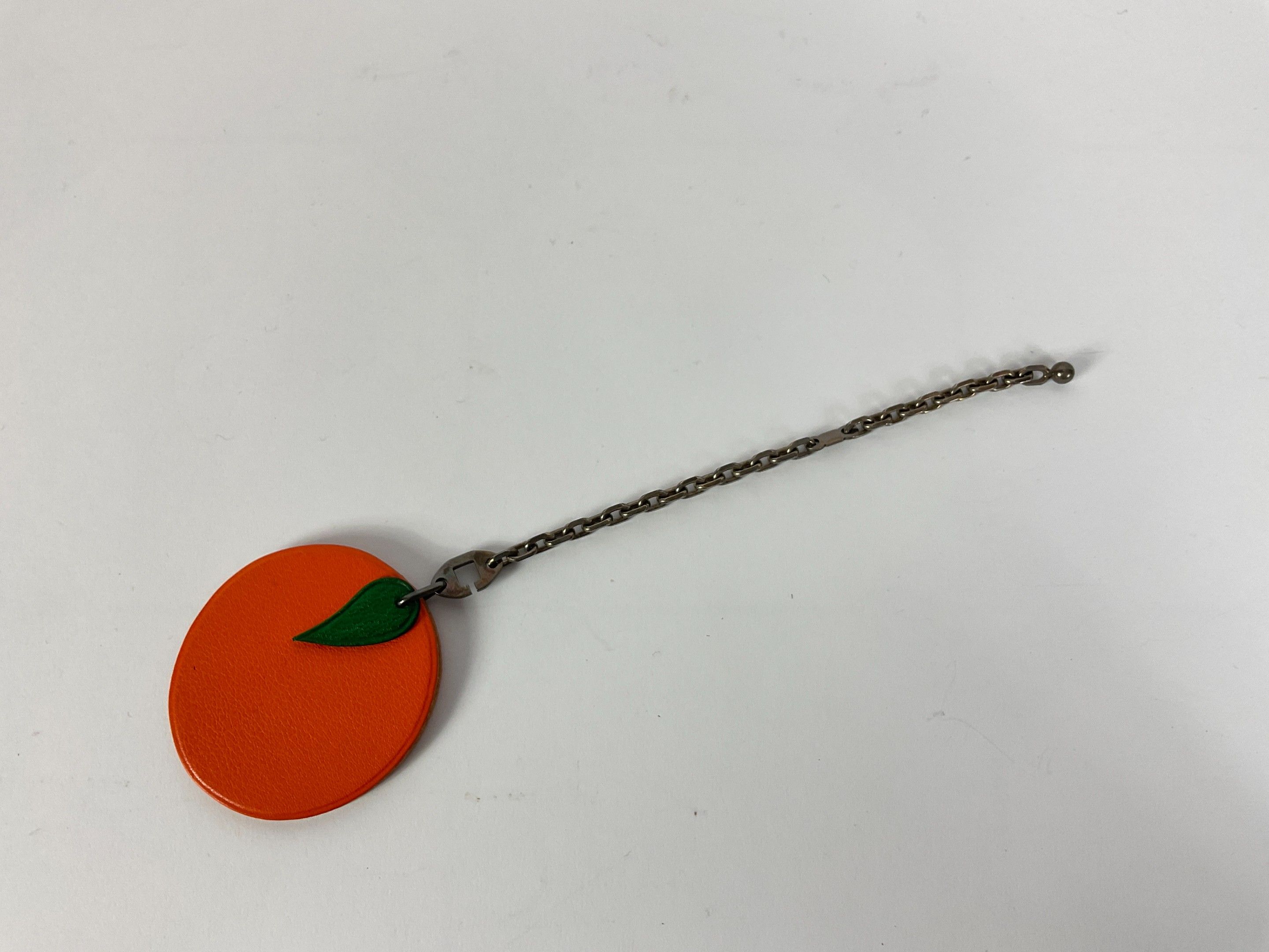 26/ Hermès Paris Orange charm keyring in orange and green leather with silver chain, Signed, Diam: 6 cm