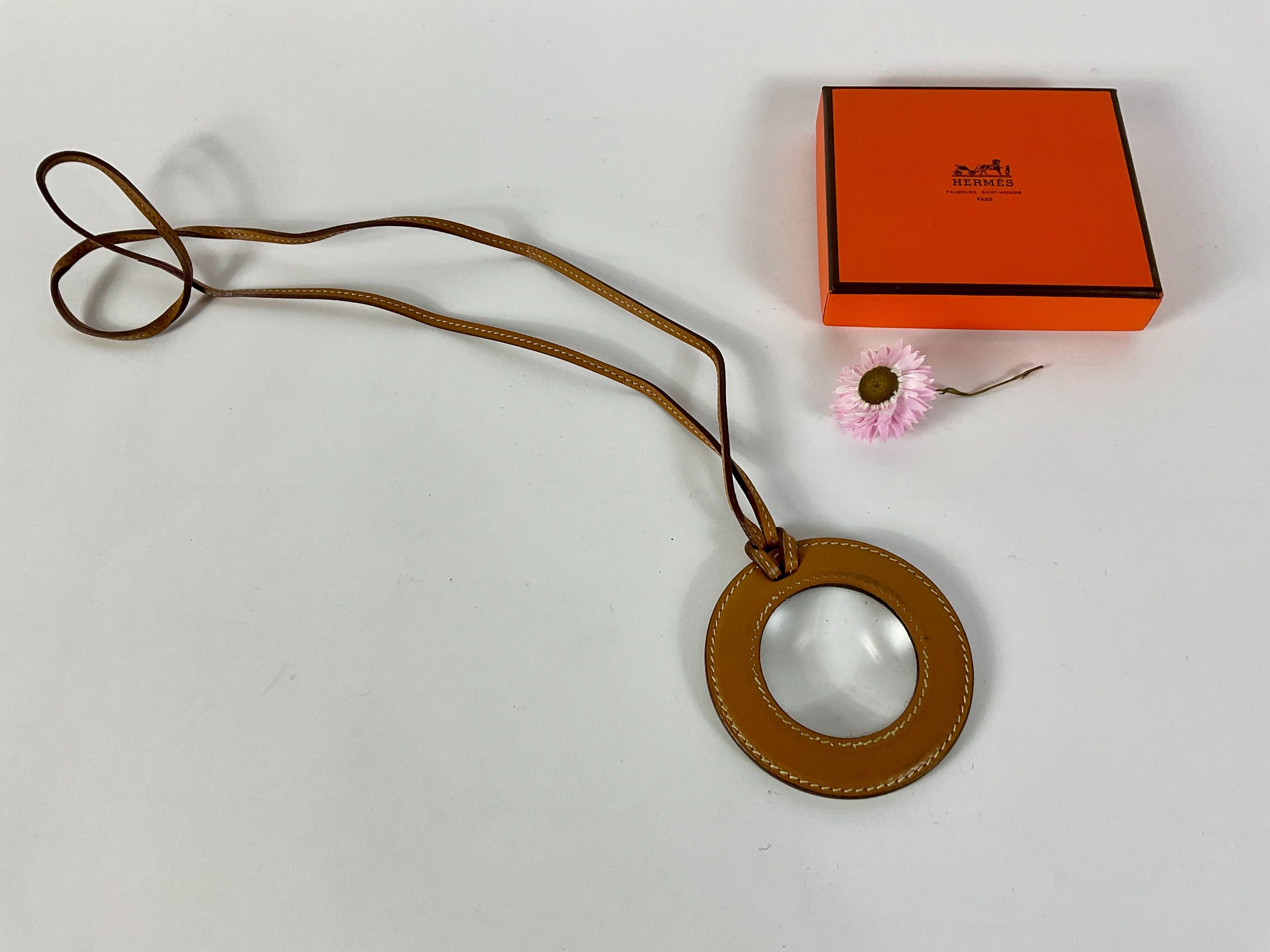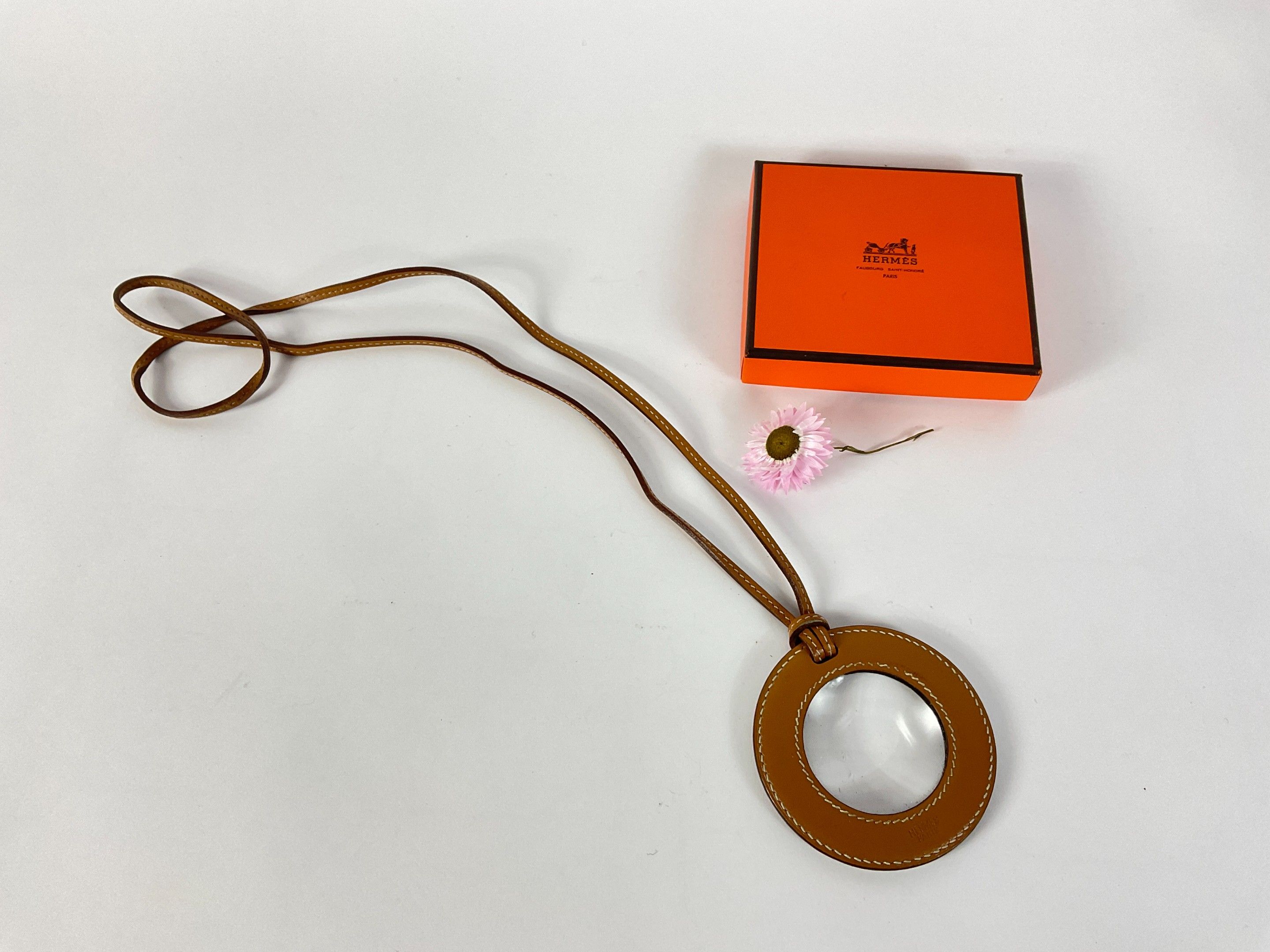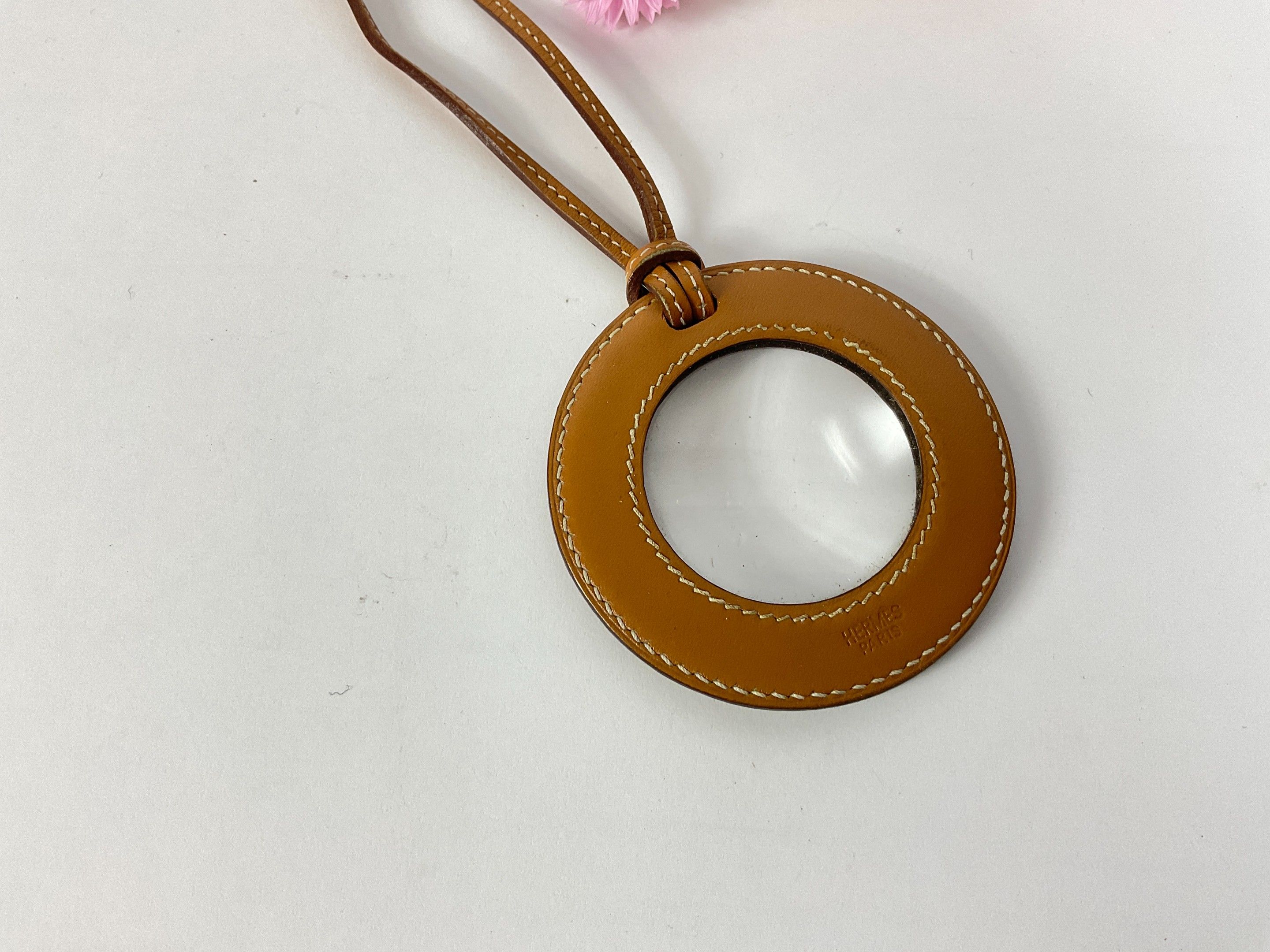 Hermès Paris " Loupe in the pocket " Stitched natural leather magnifying glass and its lace, also to be worn as a pendant, In its box, Signed, Diam : 7,5 cm