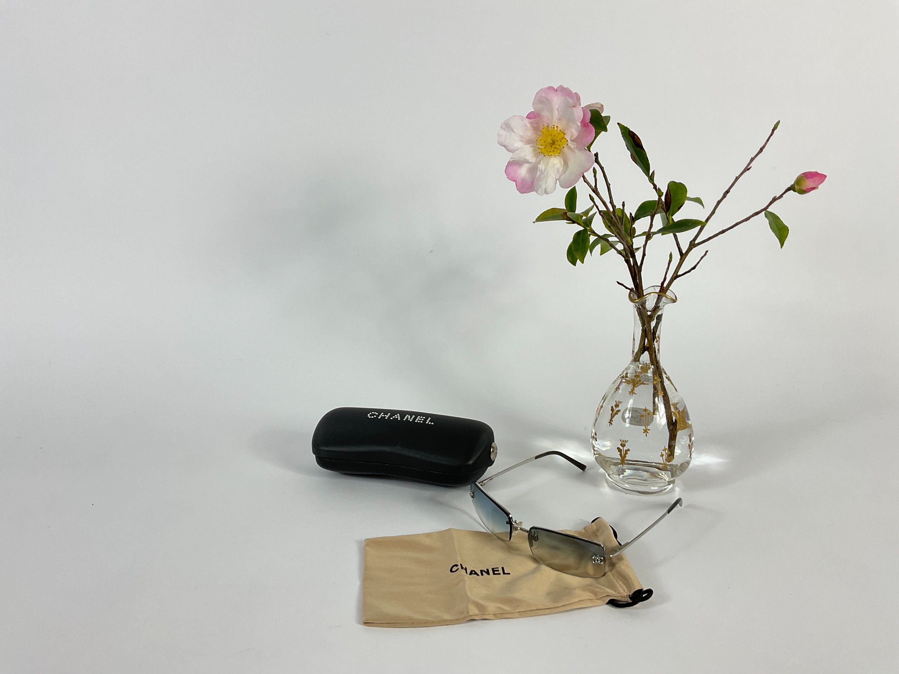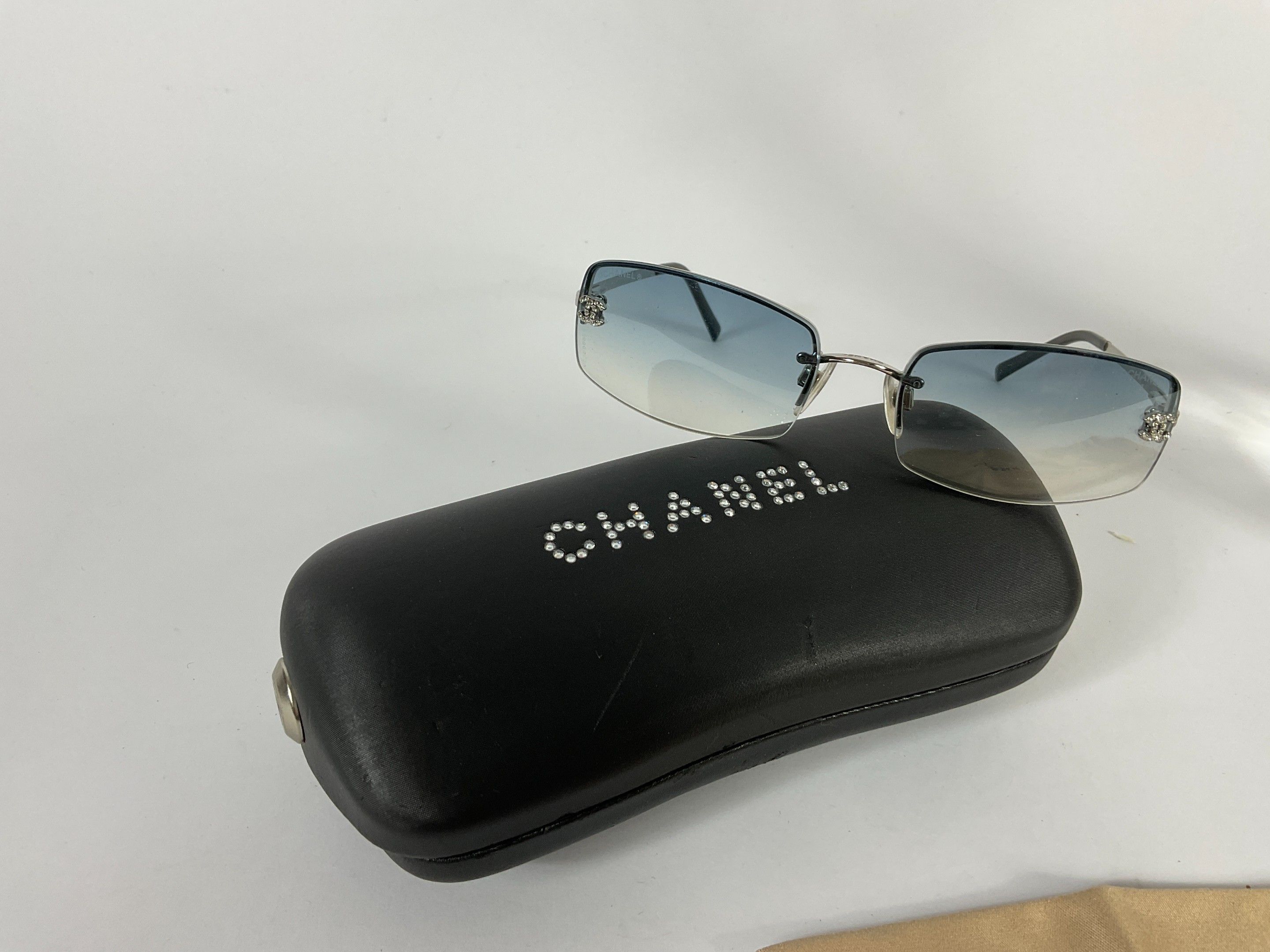 Chanel circa 1990 A pair of blue tinted sunglasses with a Chanel rhinestone case and pouch.