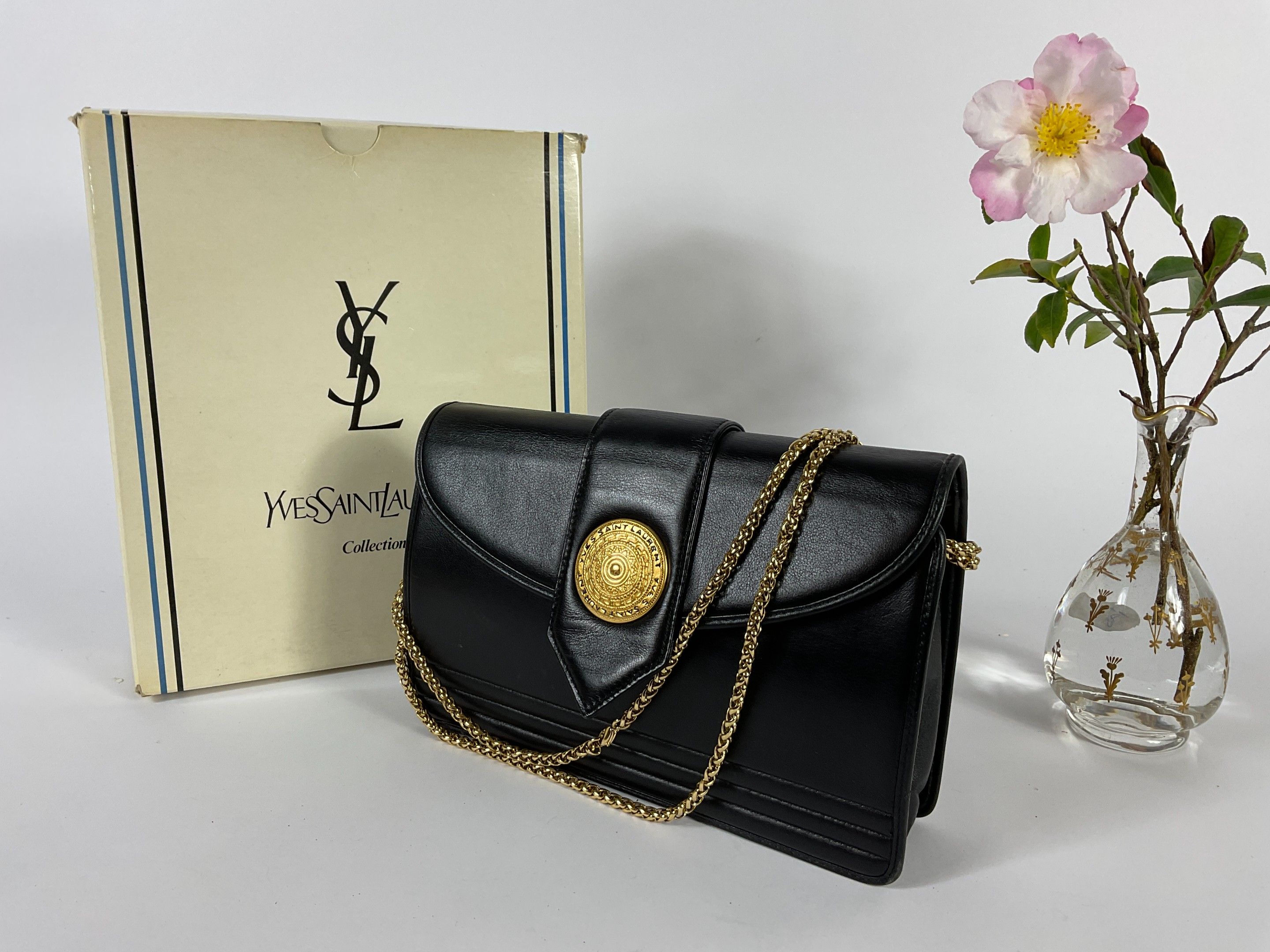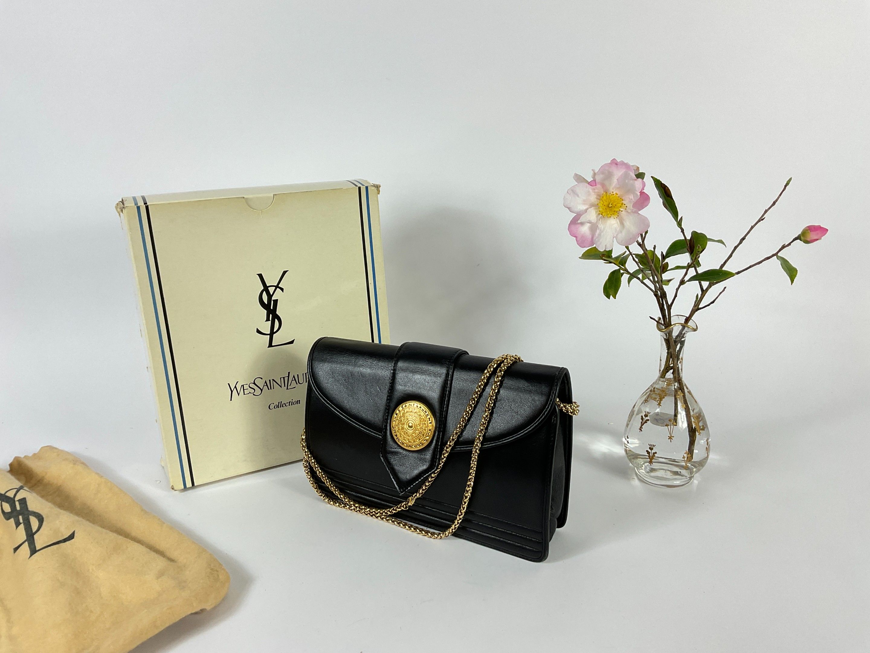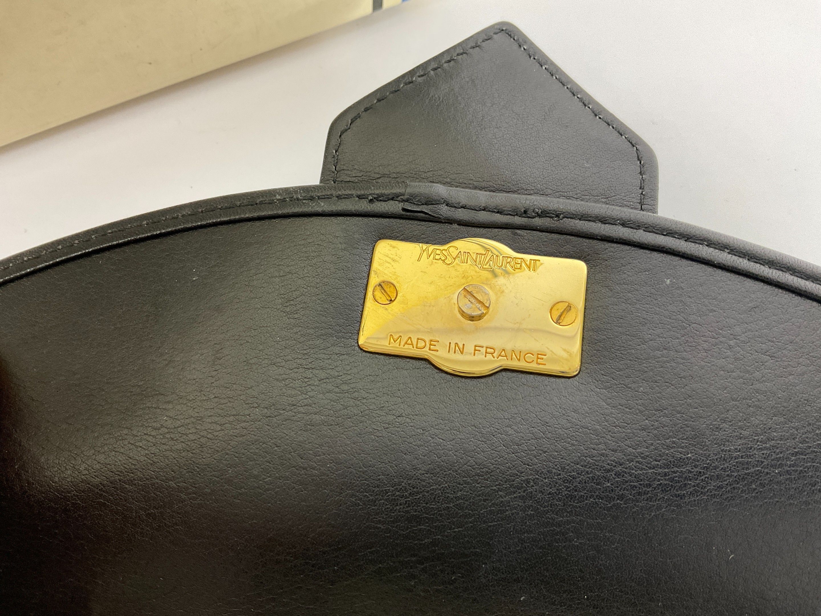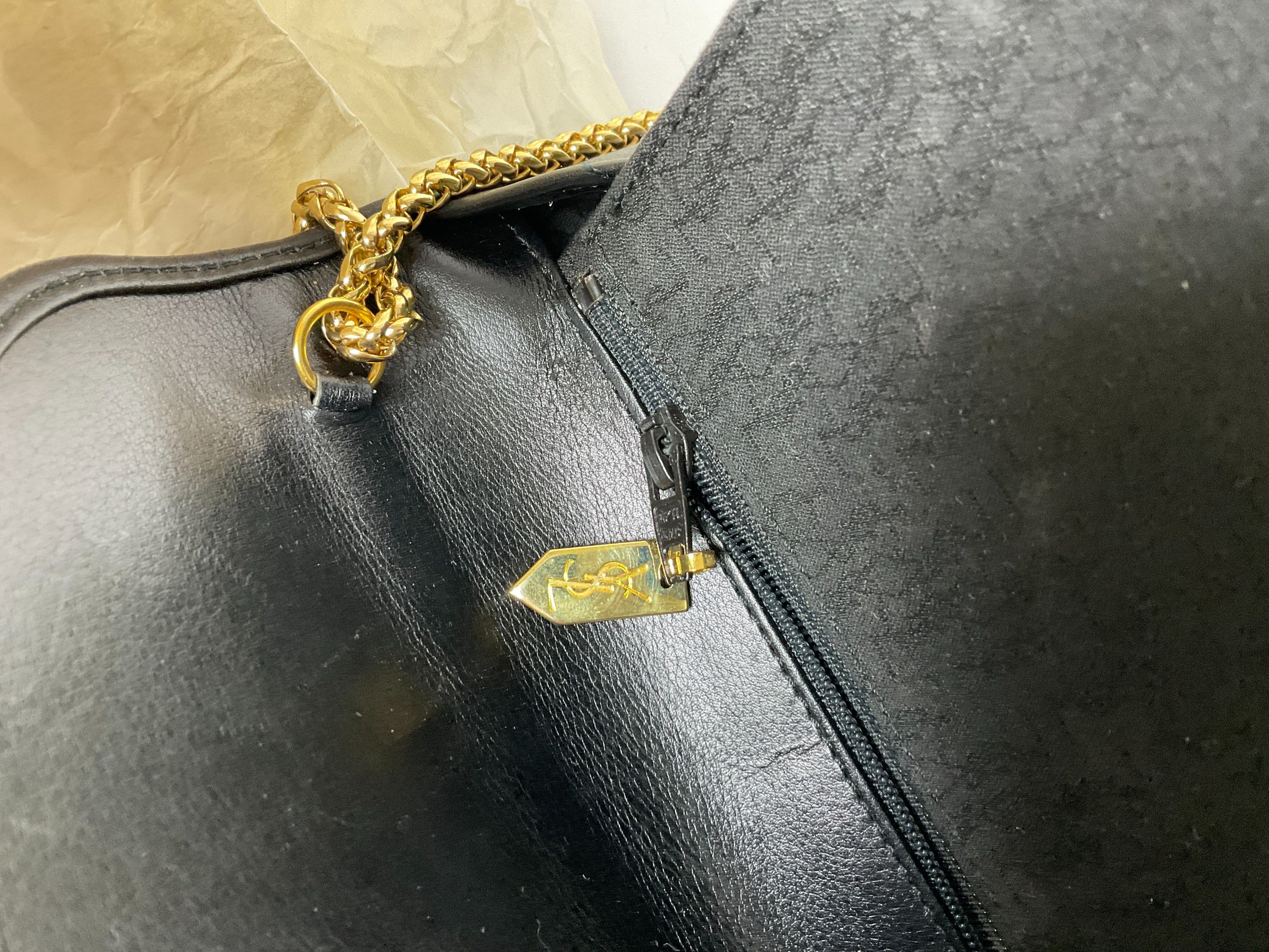 Yves Saint Laurent Collection circa 1970/1980 Black overstitched box handbag with flap flanked by an Yves Saint Laurent medallion, press stud and gold-tone metal chain. The interior is made of monogrammed canvas with a gilded metal medallion for the zip pocket. With its original pouch and box, H: 17.5 cm - W: 25 cm (Good condition)