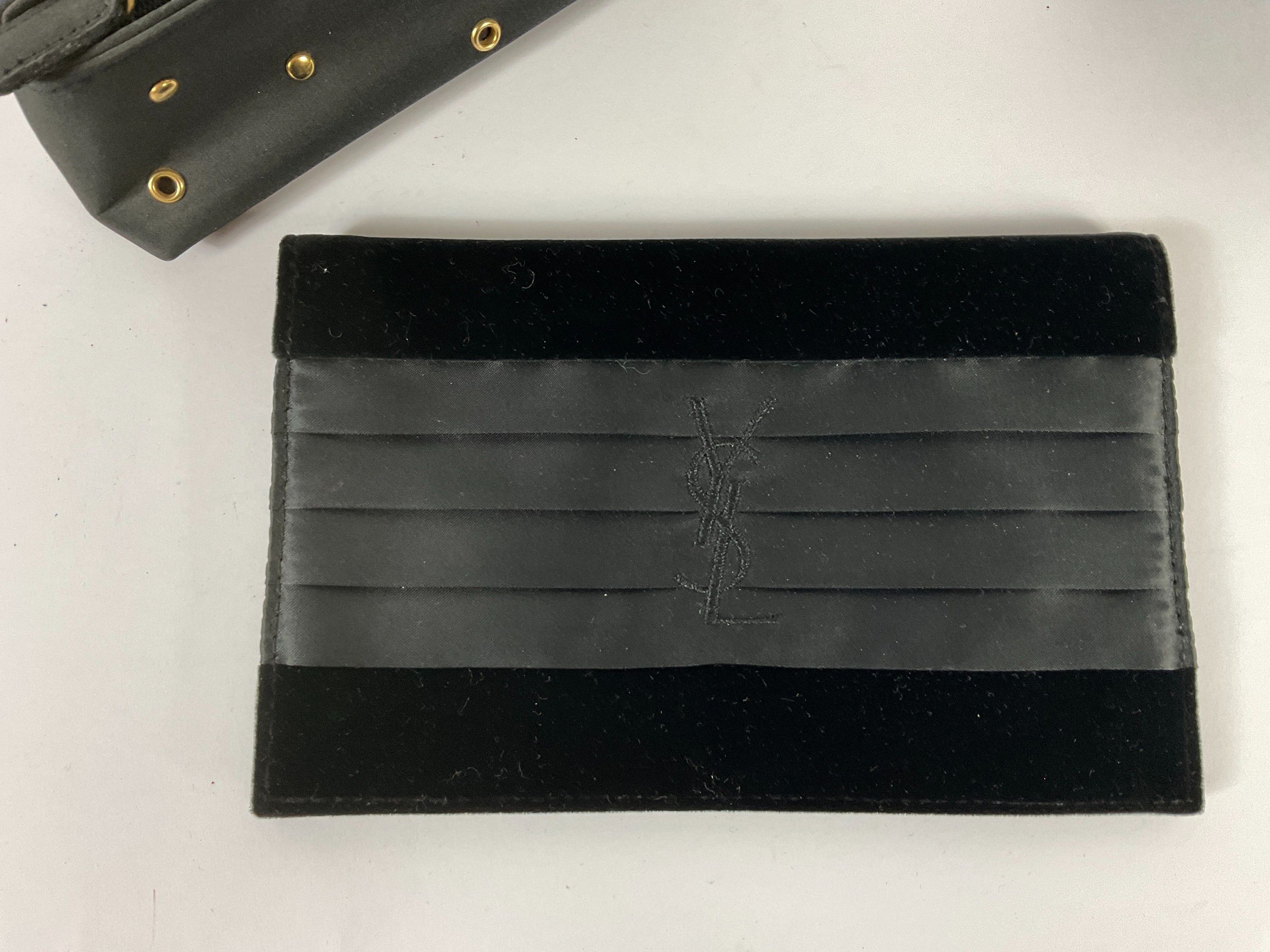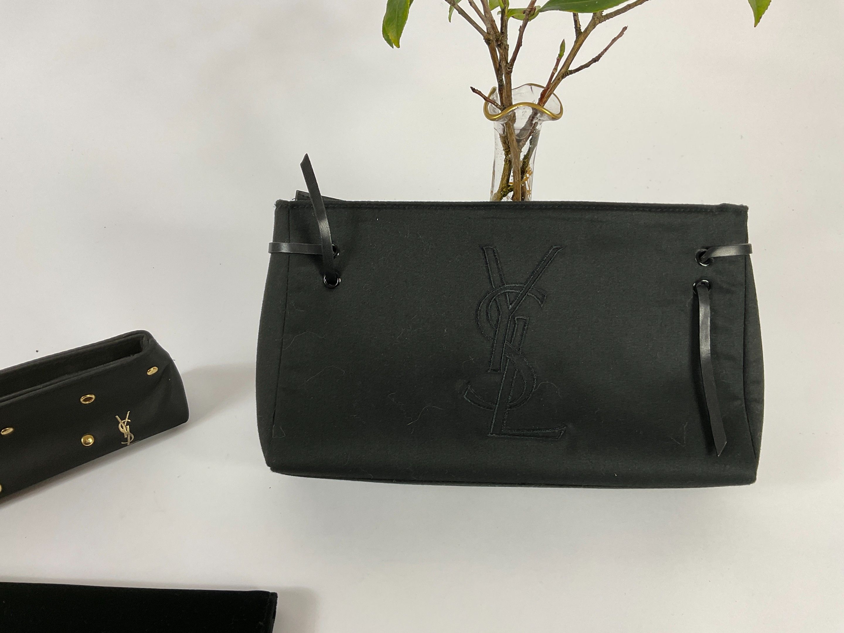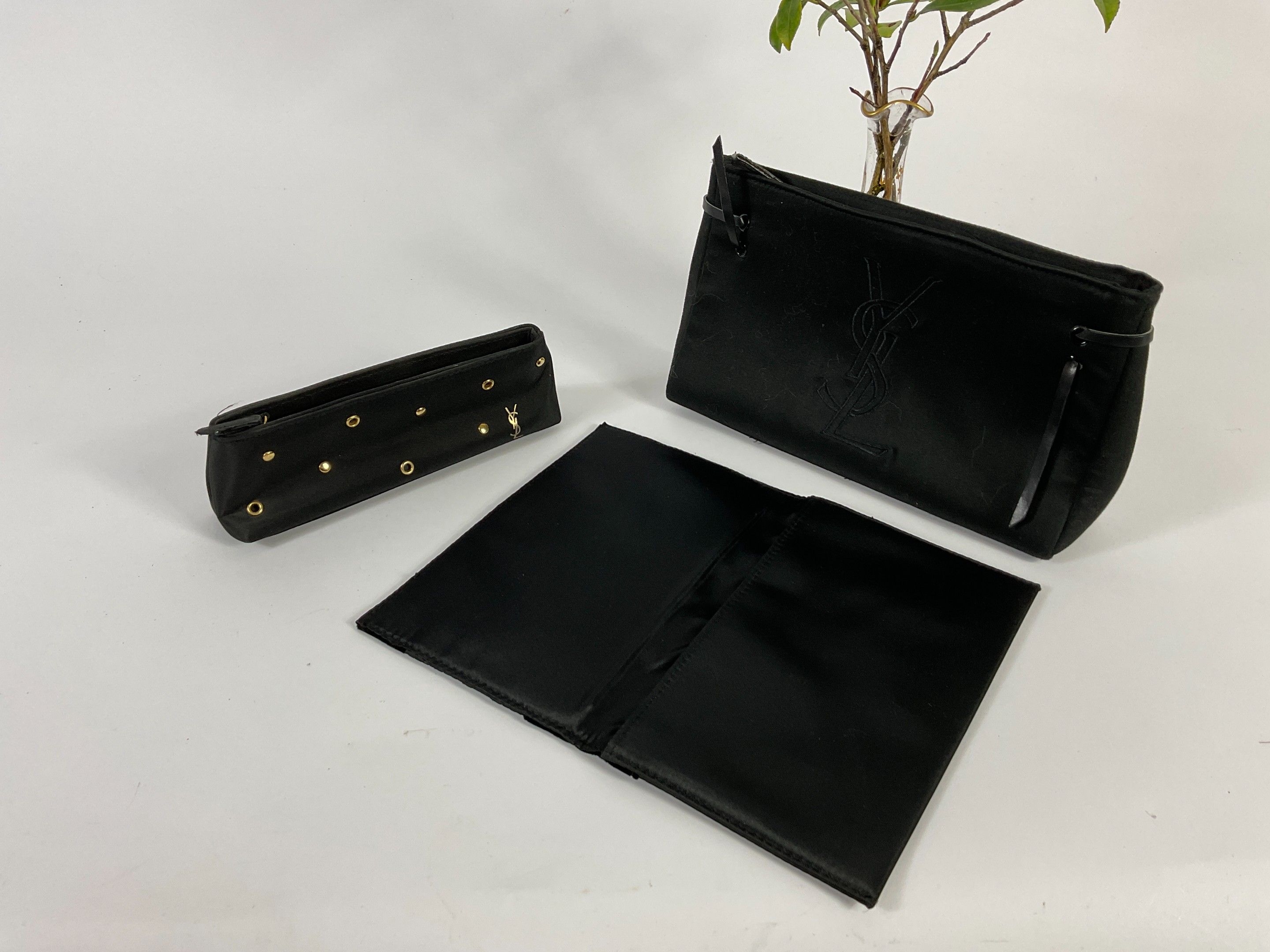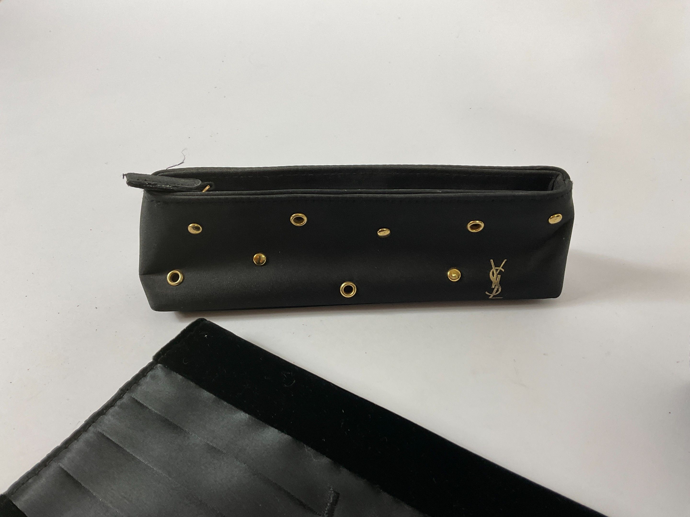 Yves Saint Laurent Parfums circa 1980 Set of three black canvas make-up pouches with gold rivets, signed, toned-in laces and velvet and satin. Numbered.