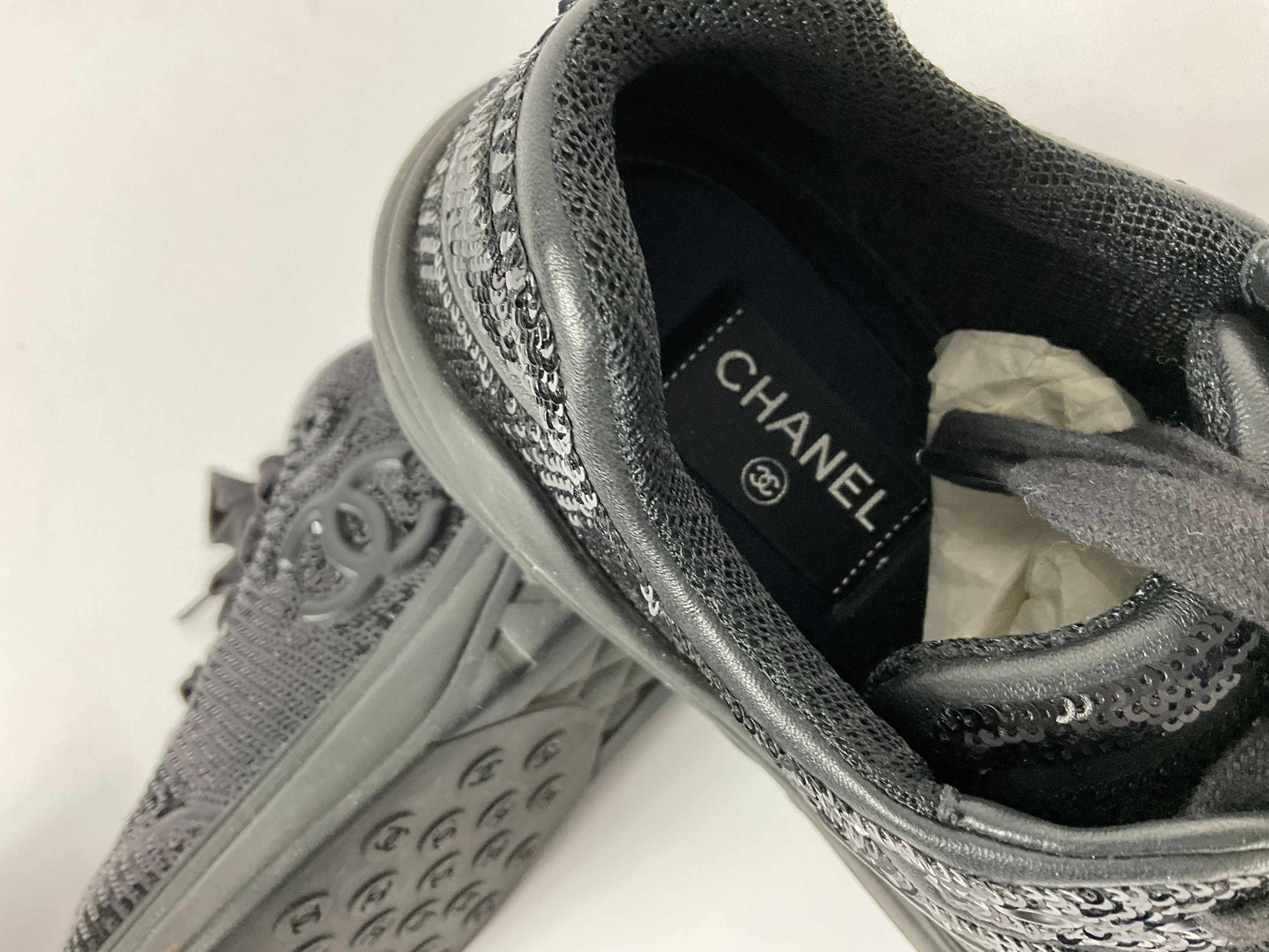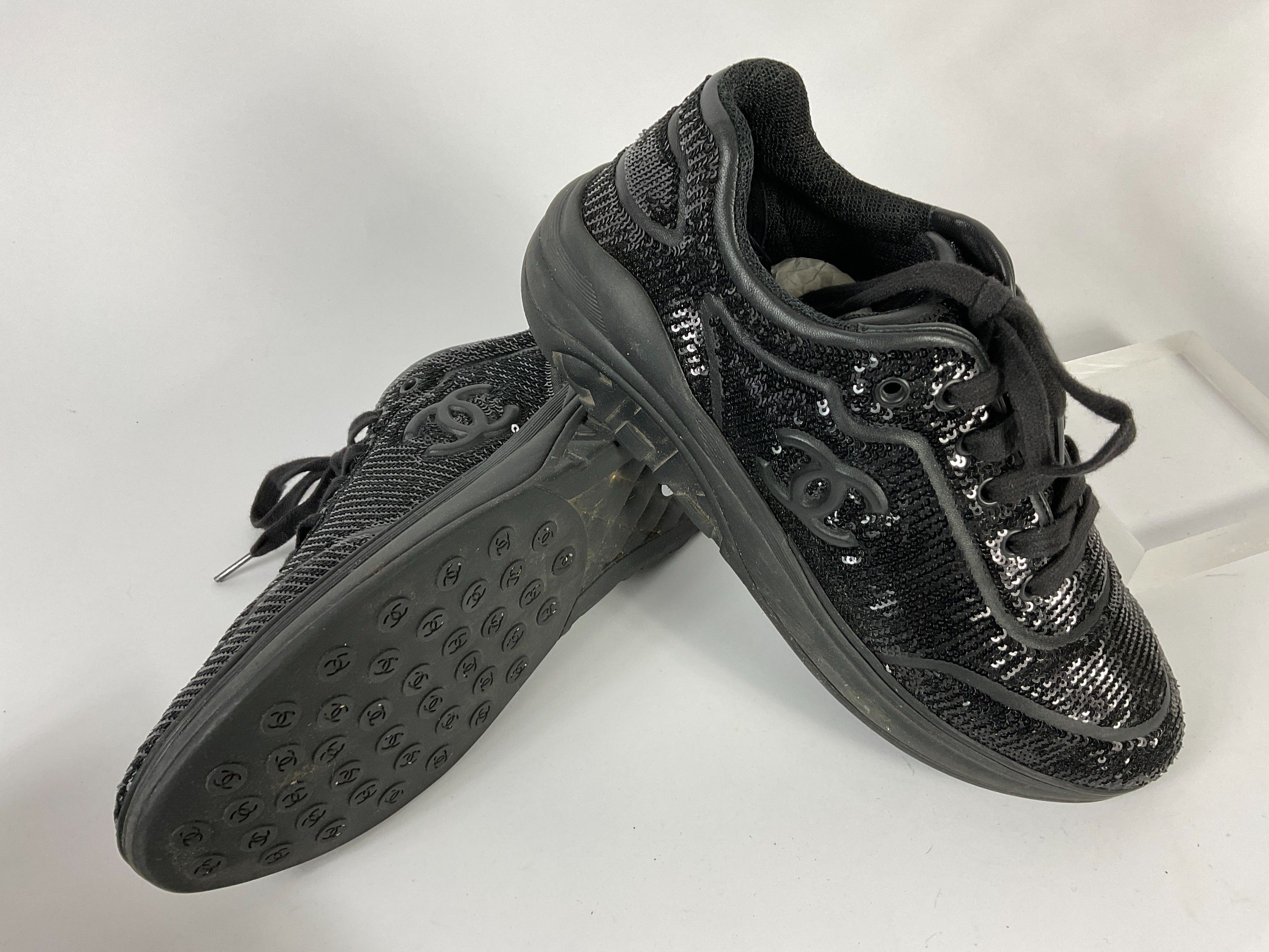Chanel Pair of black sequin sneakers with high soles forming "X" prints; In its box, Size 40; Chanel slipcase attached (as new).