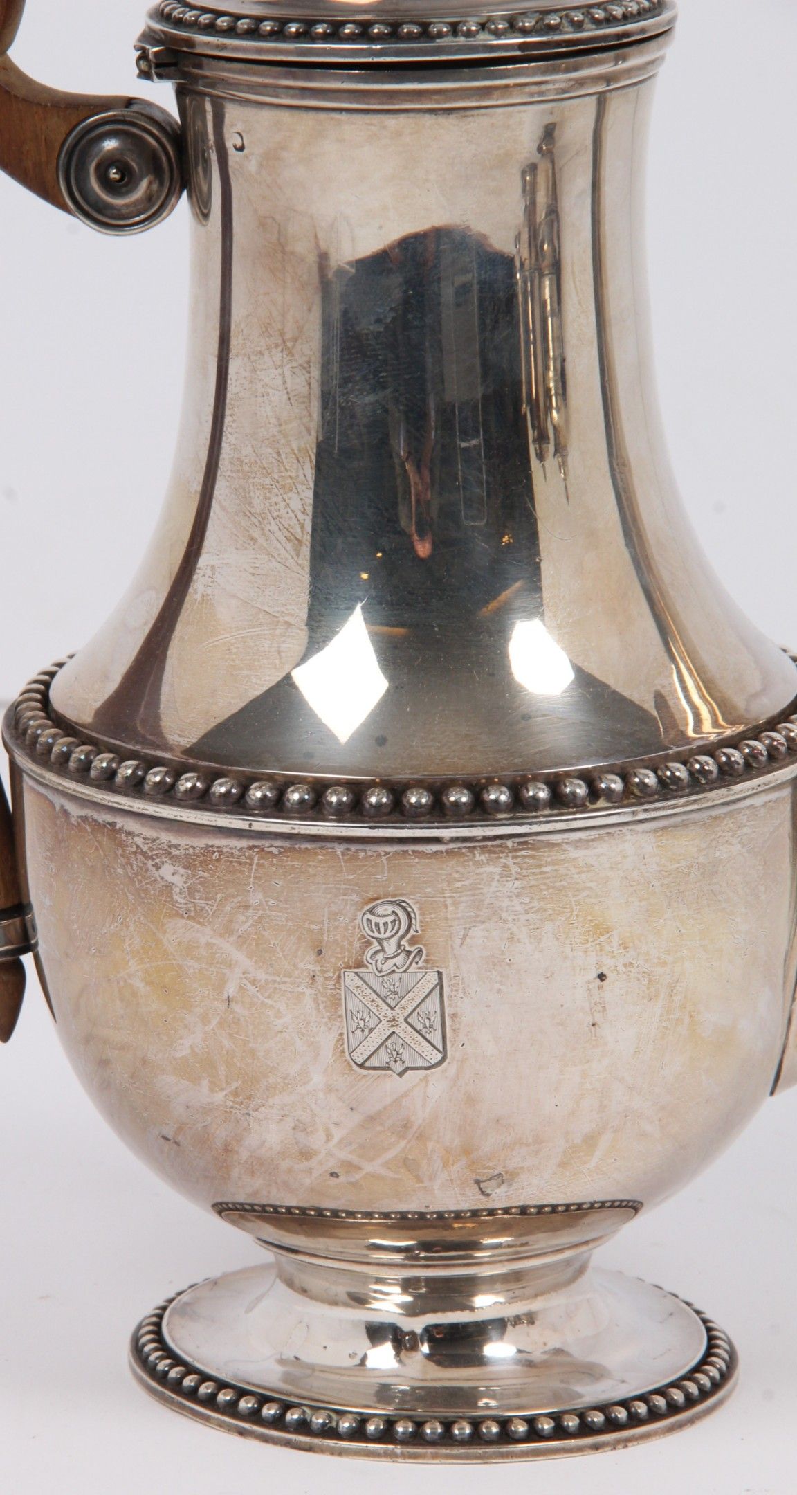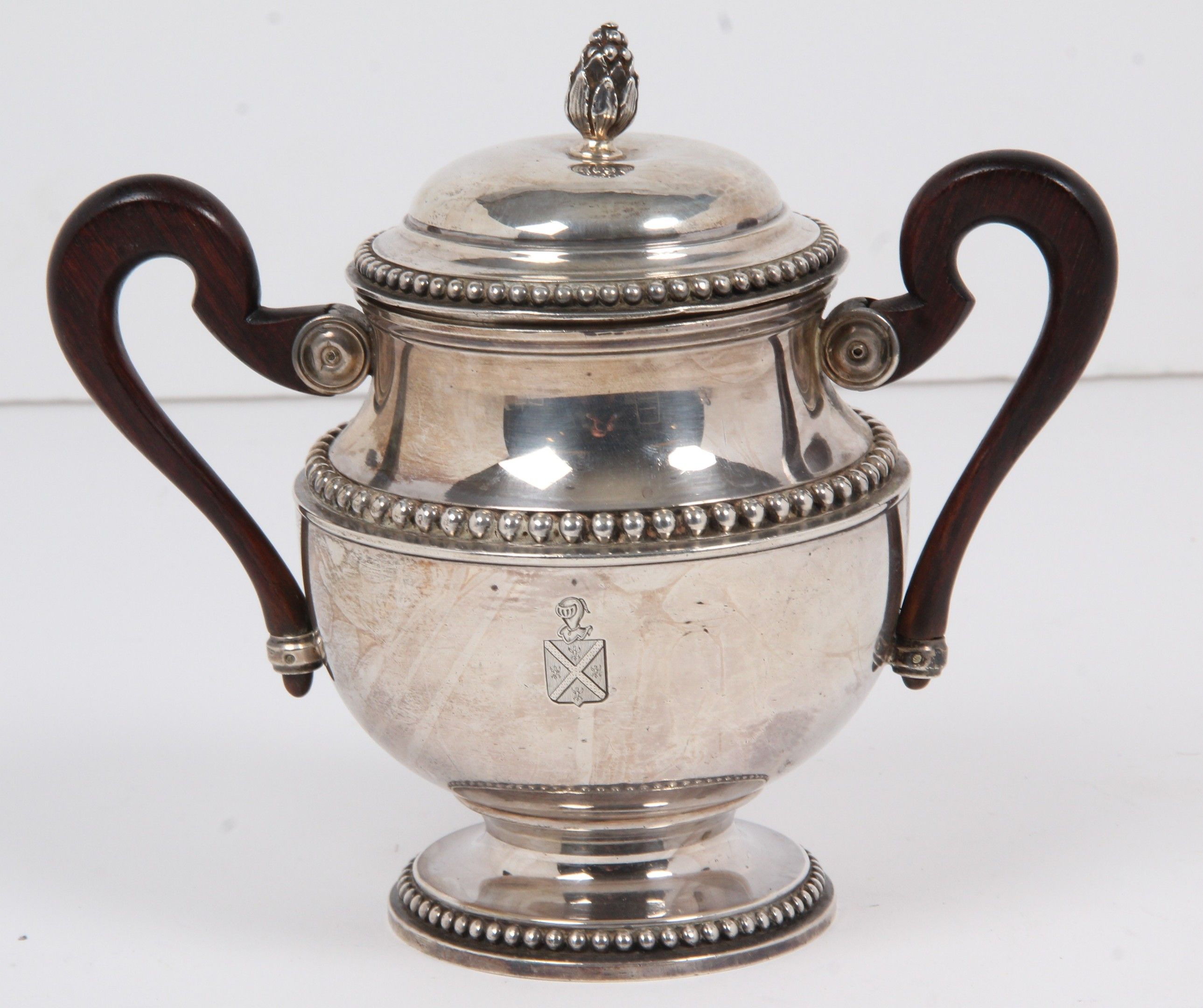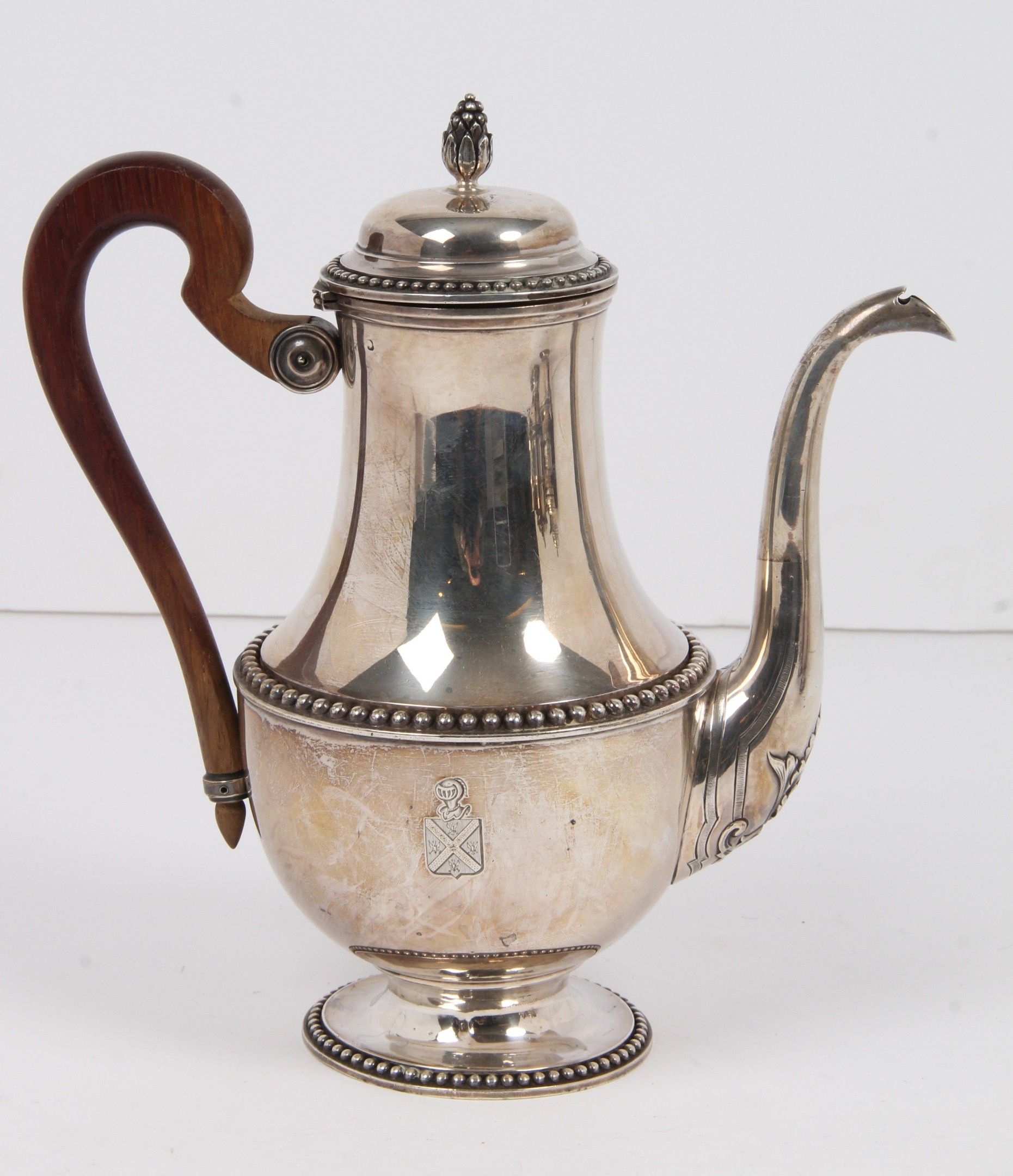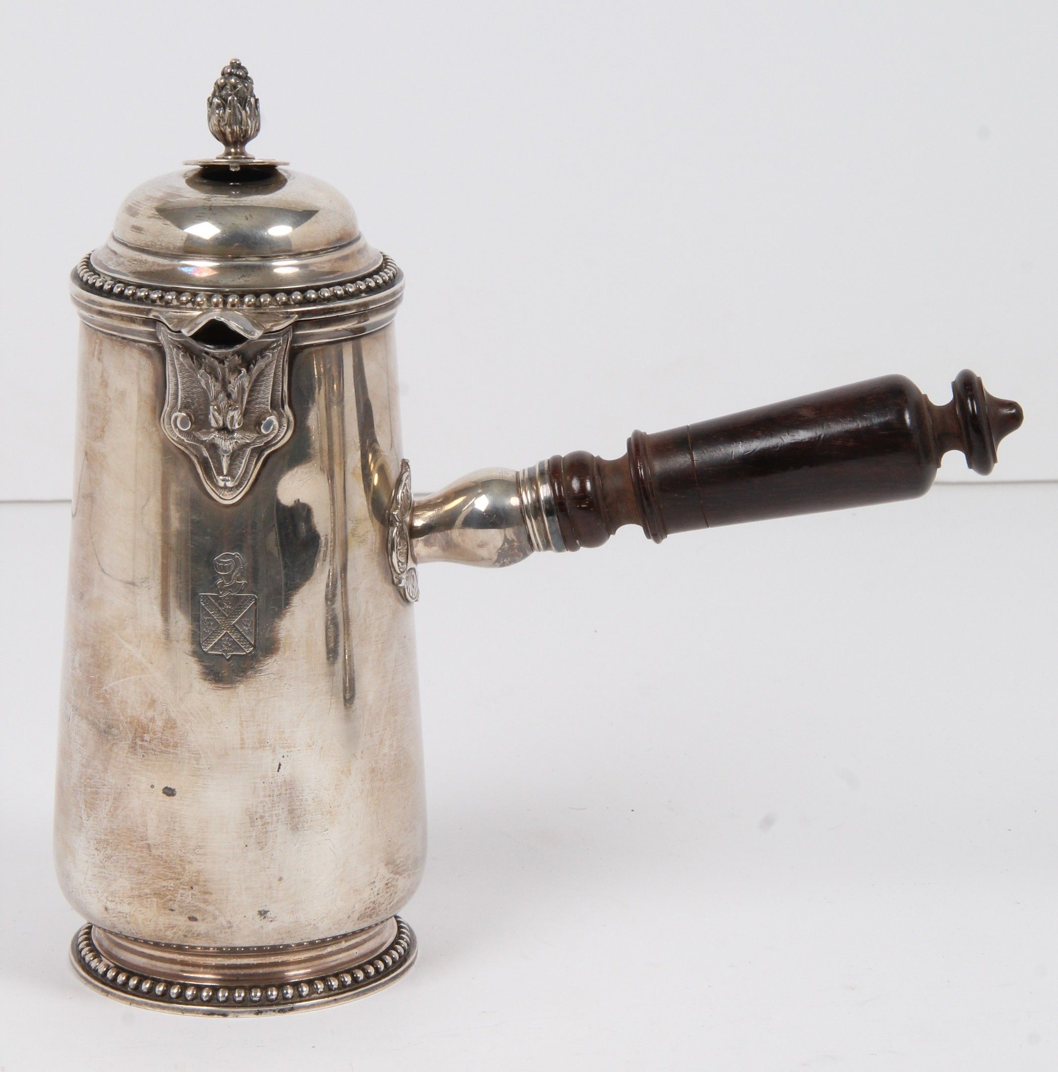 in 950 thousandths silver, decorated with friezes of pearls, the sides decorated with coats of arms, wooden handle, comprising :