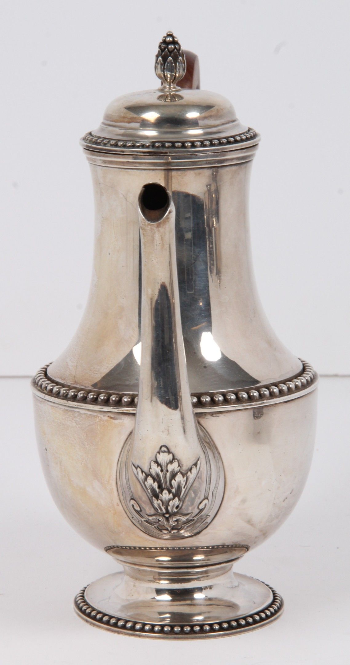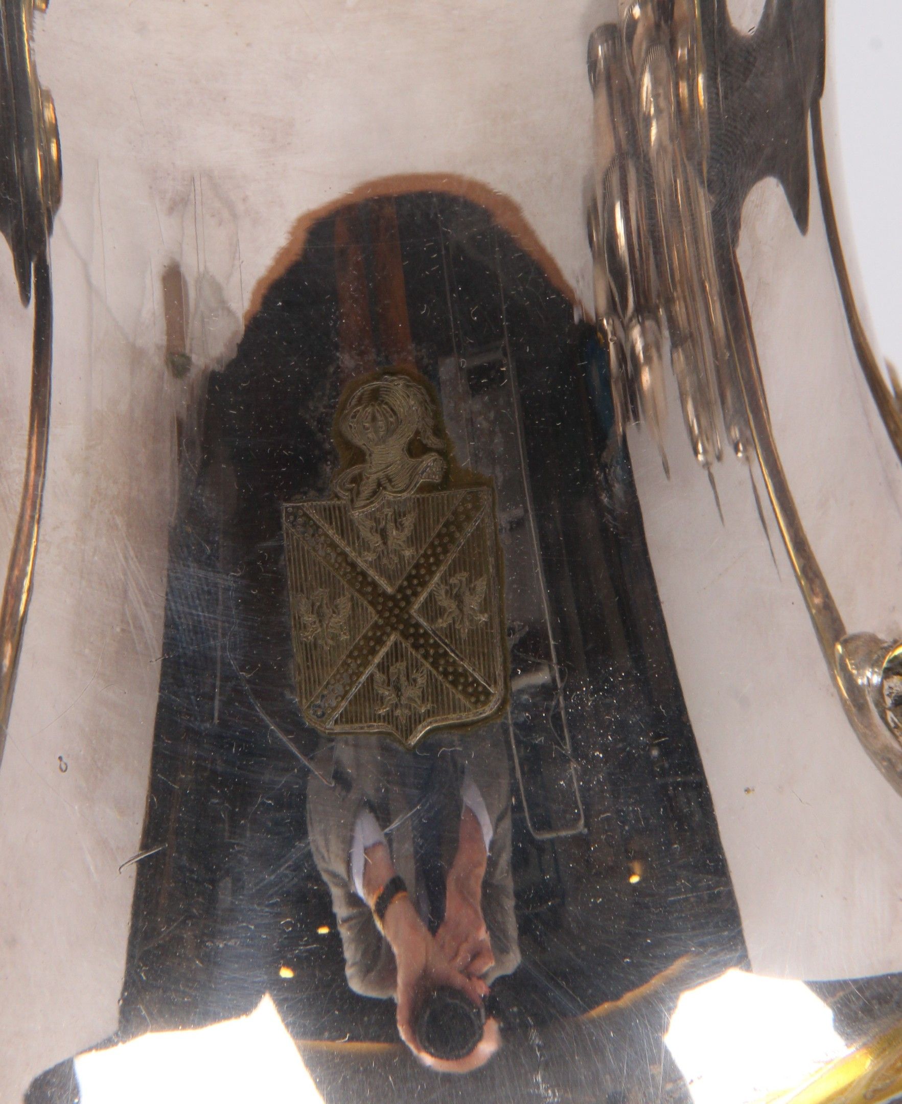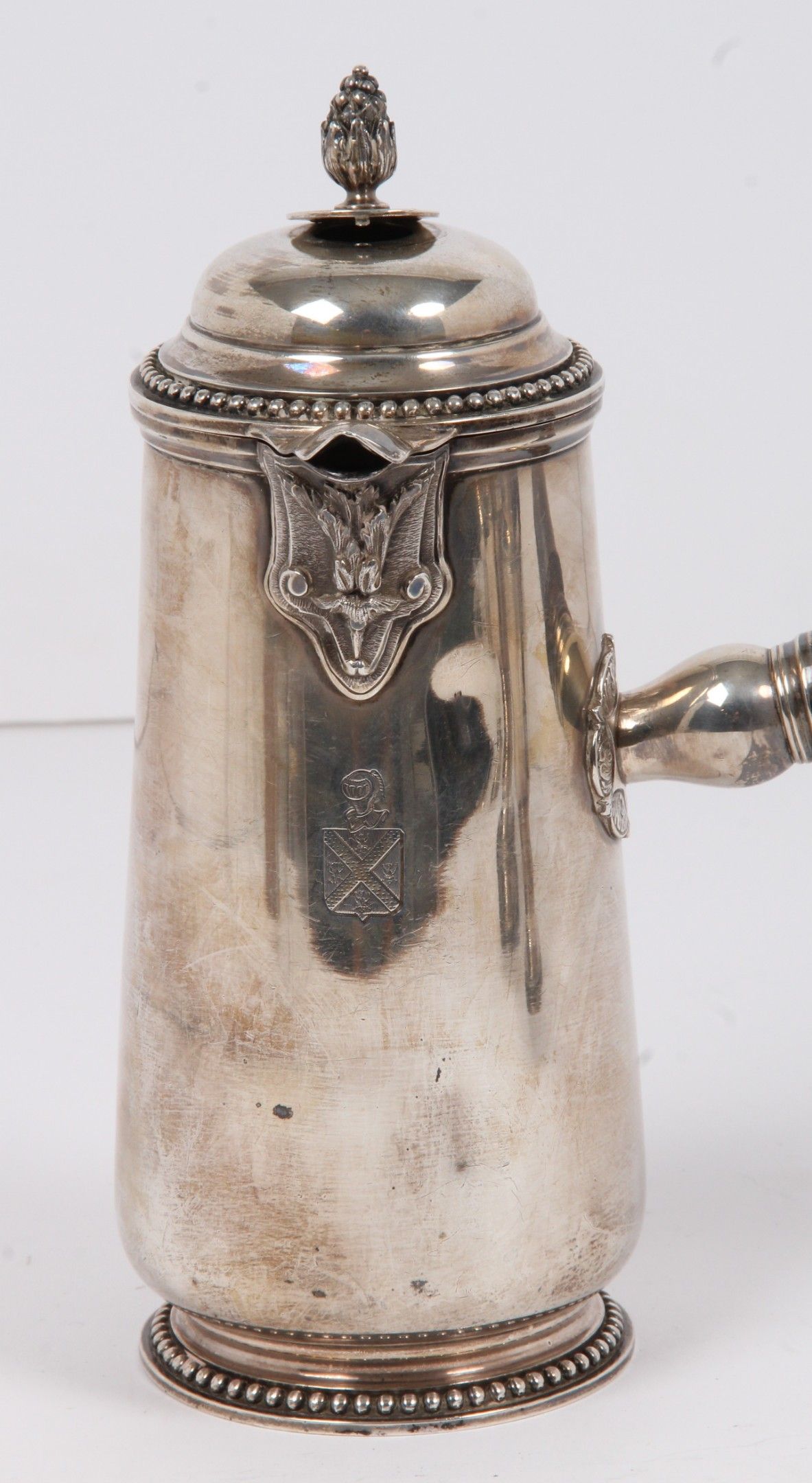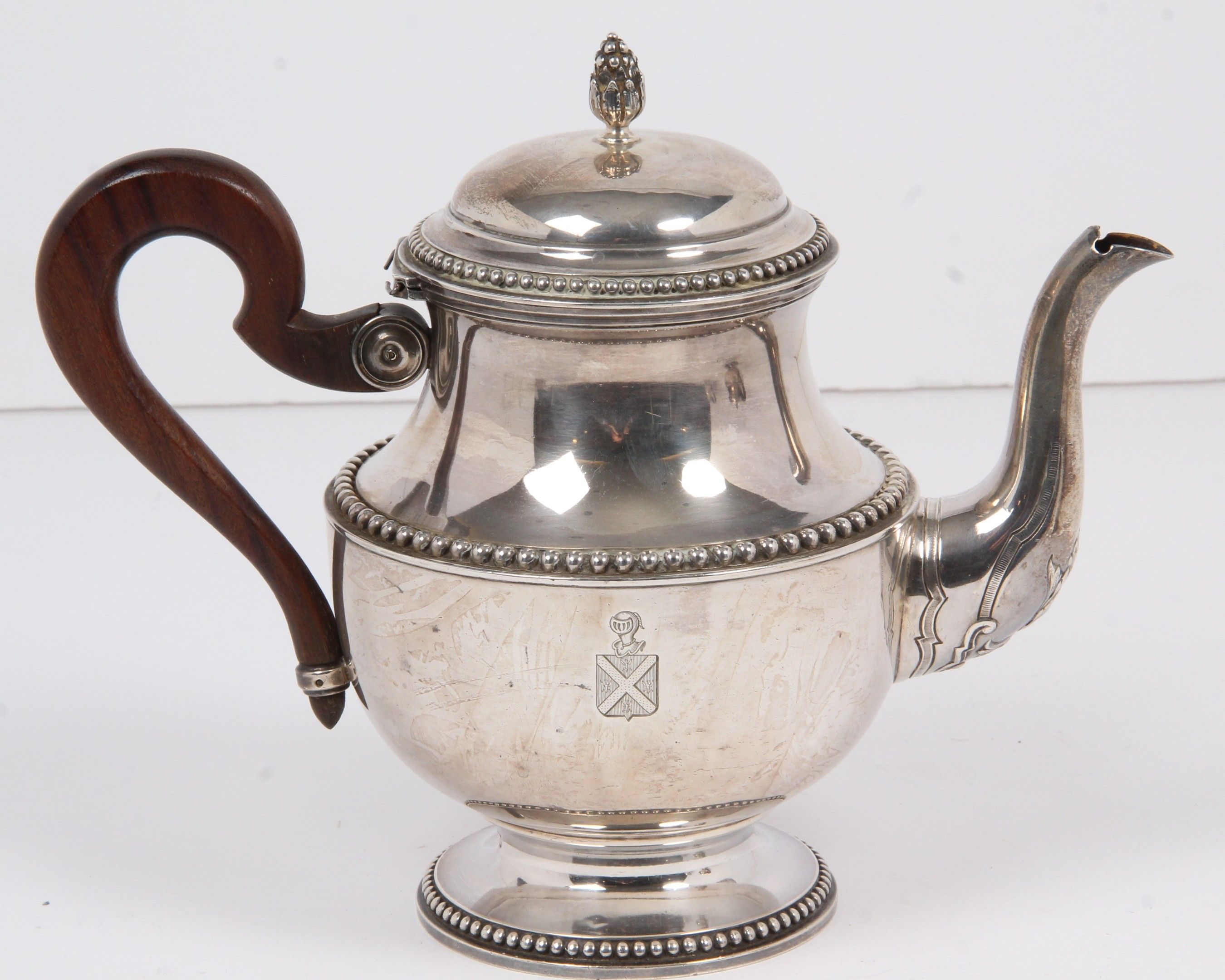 in 950 thousandths silver, decorated with friezes of pearls, the sides decorated with coats of arms, wooden handle, comprising :