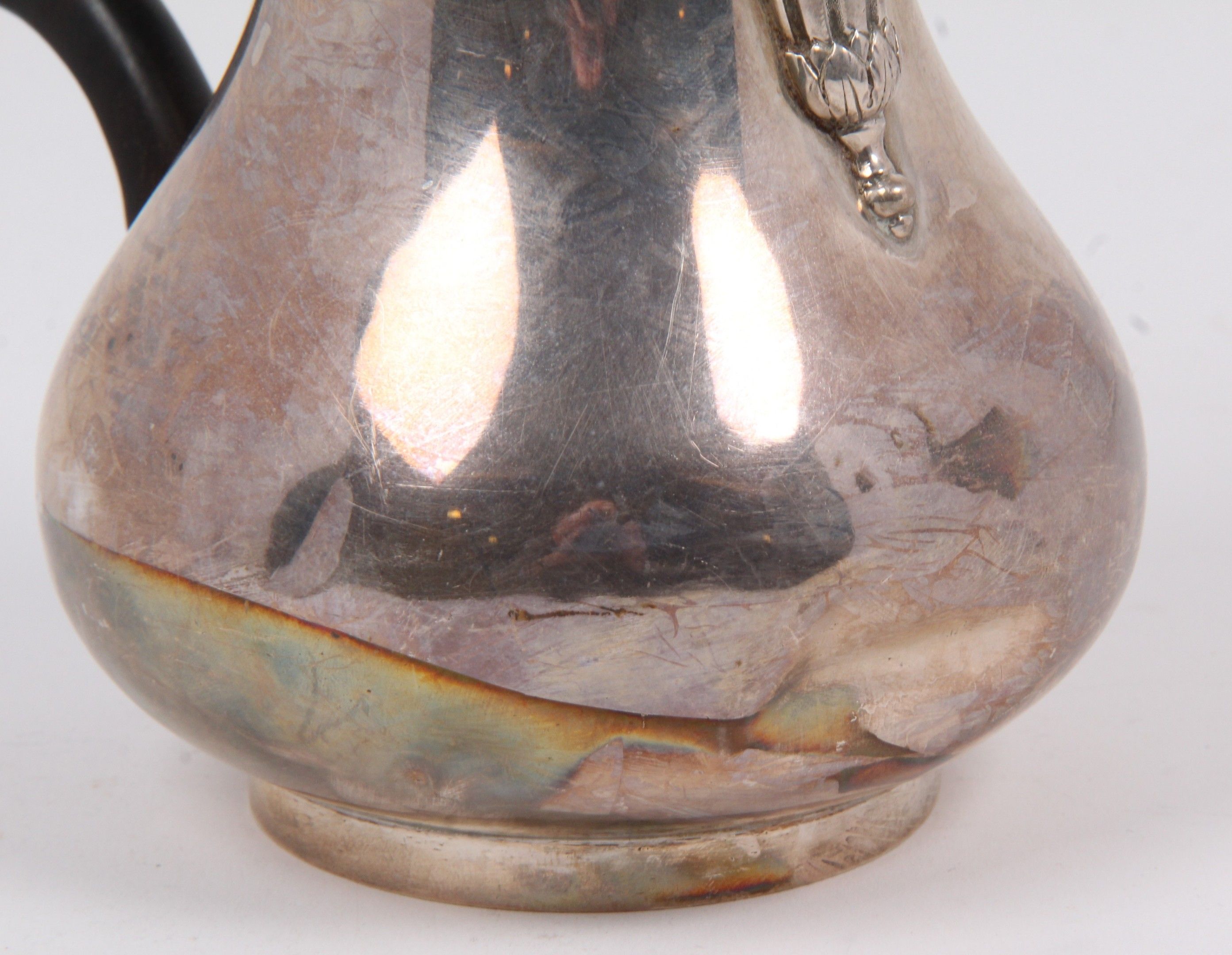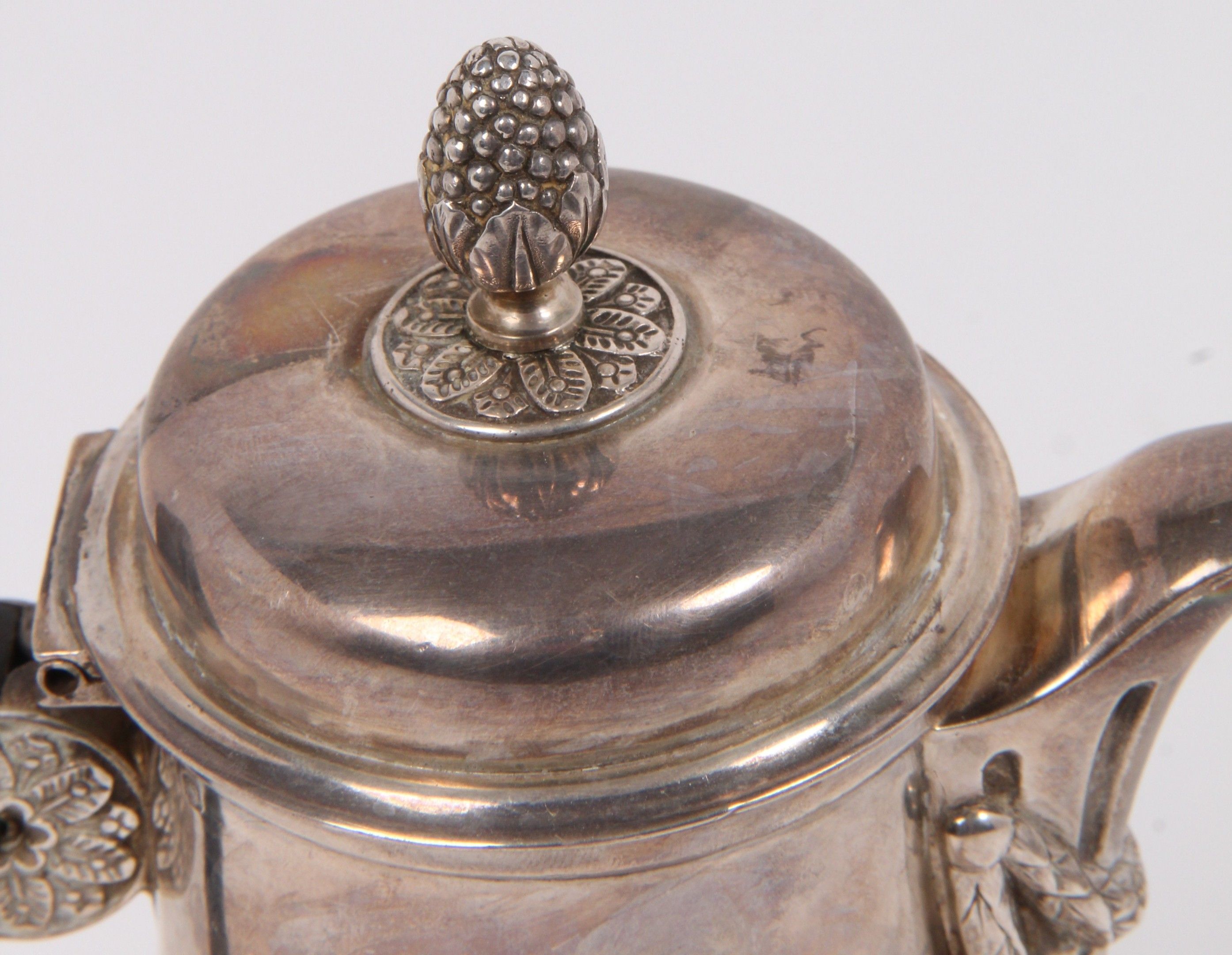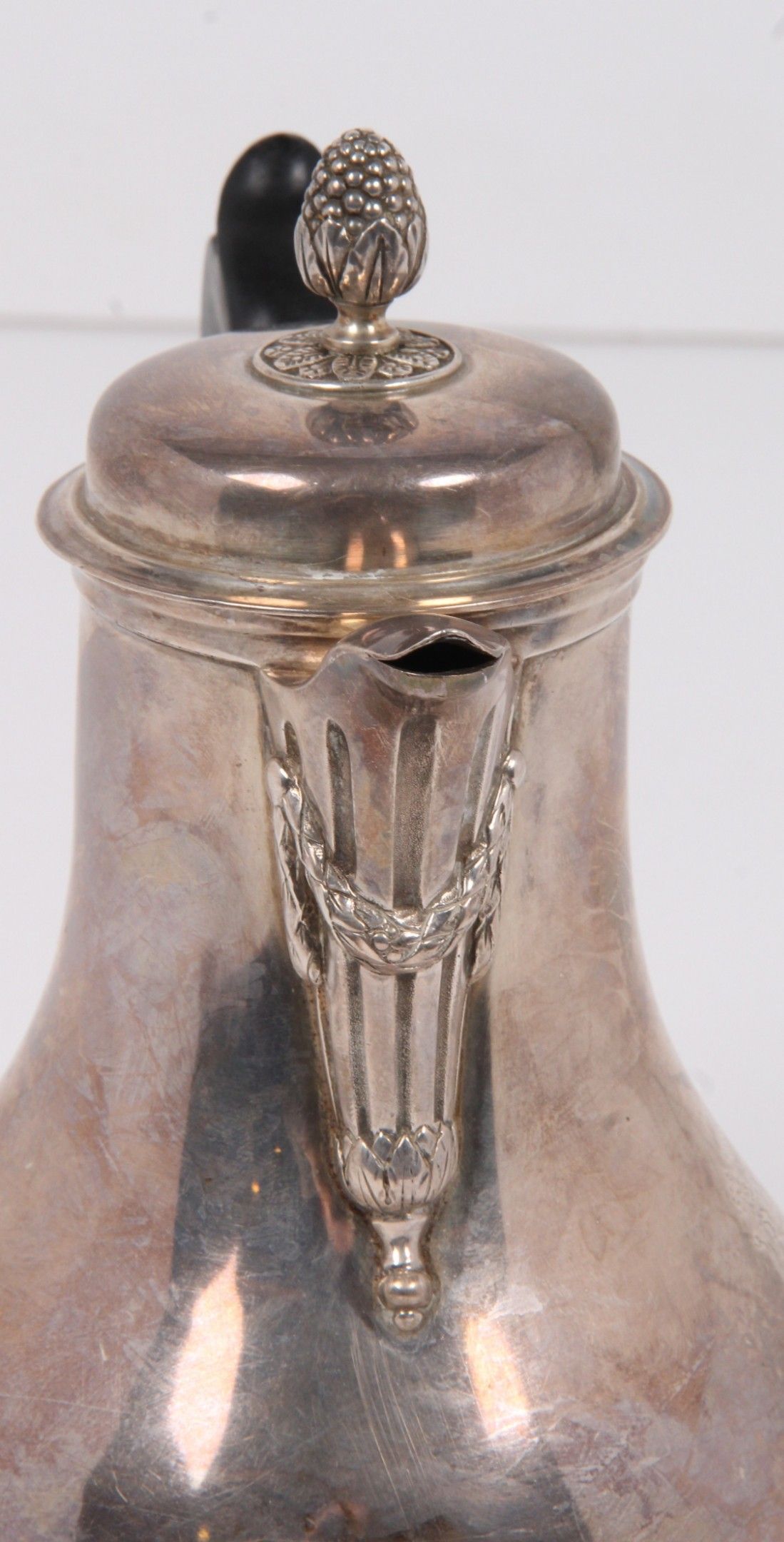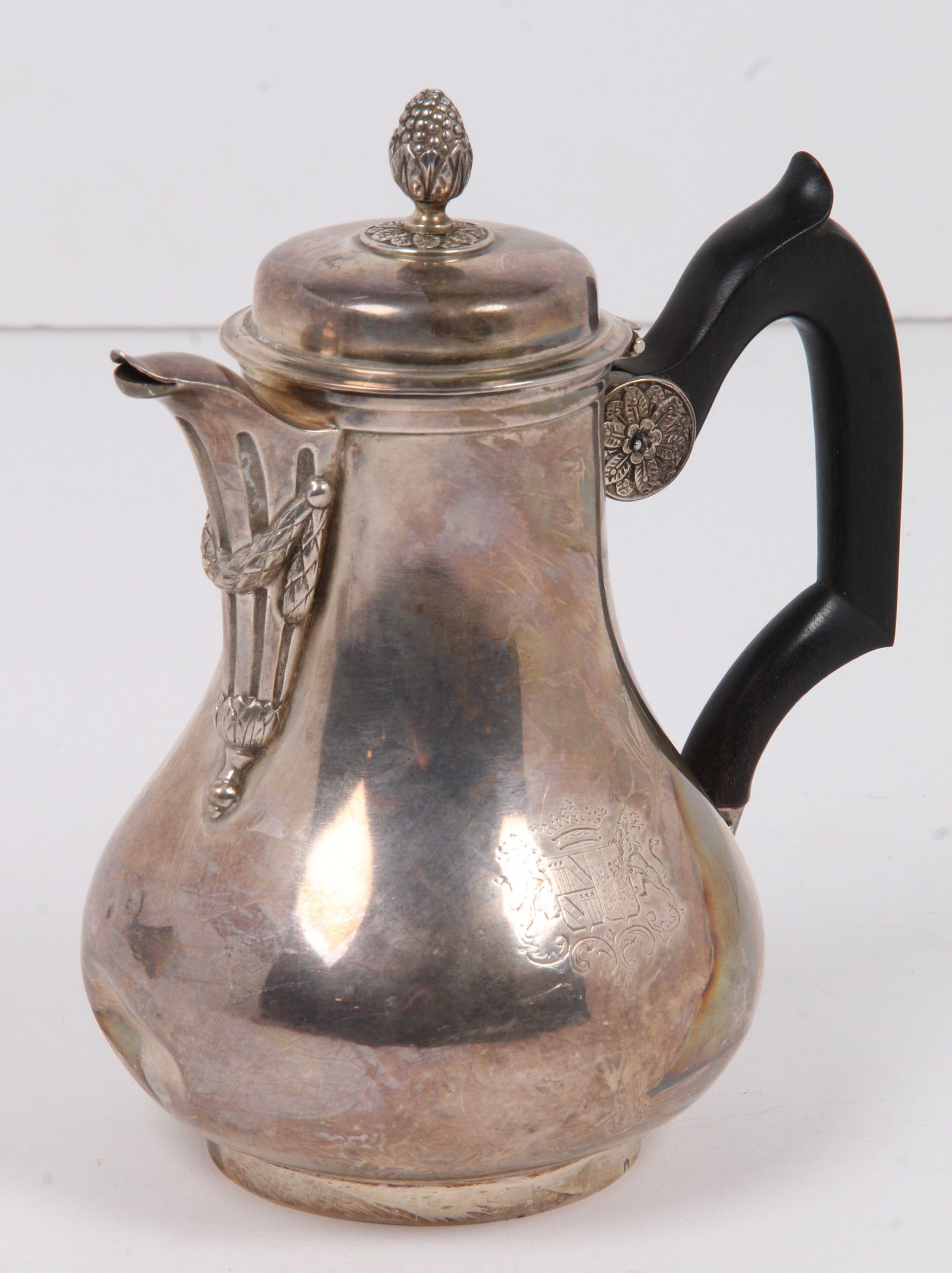 in silver 950 thousandths, smooth body armorial, fretel in the shape of fruit, spout fluted and garland of laurel, handle in blackened wood.
