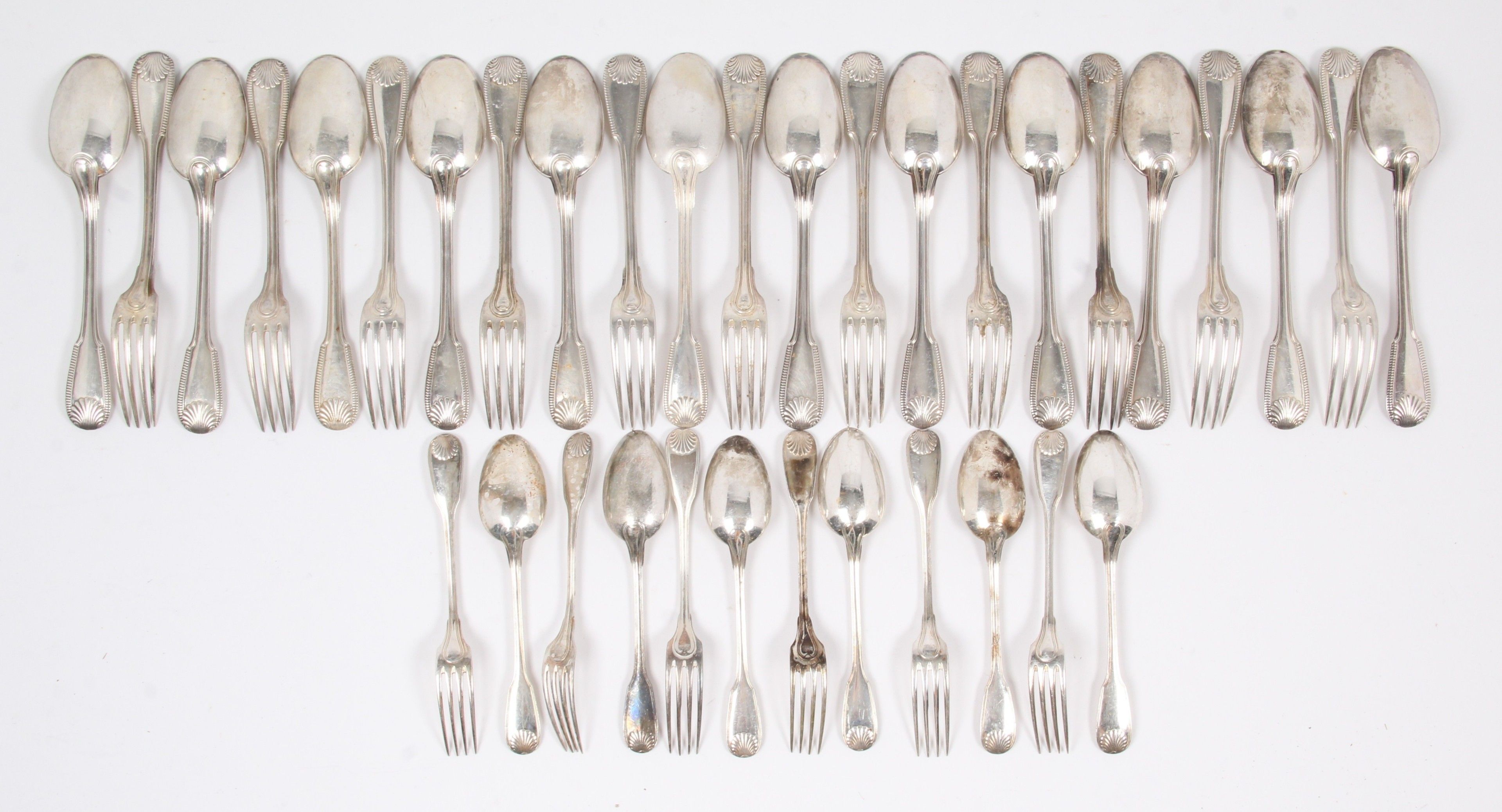 ELEVEN TABLE FORKS, TWELVE TABLE SPOONS AND SIX DESSERT FORKS AND SPOONS
