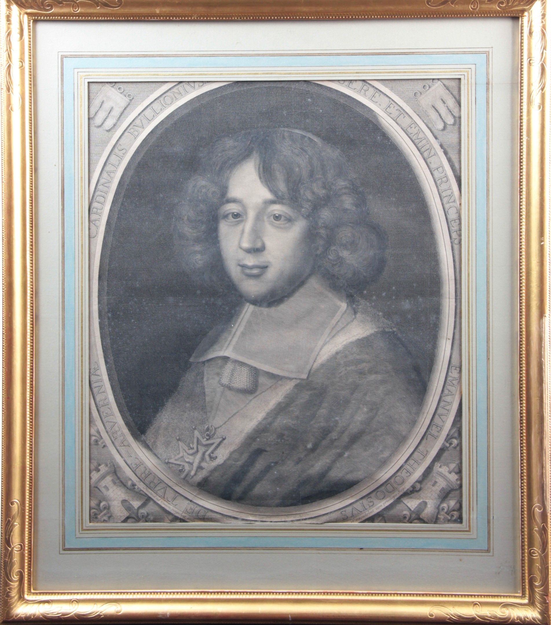 Inscriptions in Latin: SERE. ET EMIN. PRINCEPS EM[M]ANVEL THEODOSIVS DE TVRRE-ARVERNIAE CARDINALIS BVLLONIVS , R. Nanteuil ad viuum pingebat Sculp, et excudebat cum privilegio Regis.