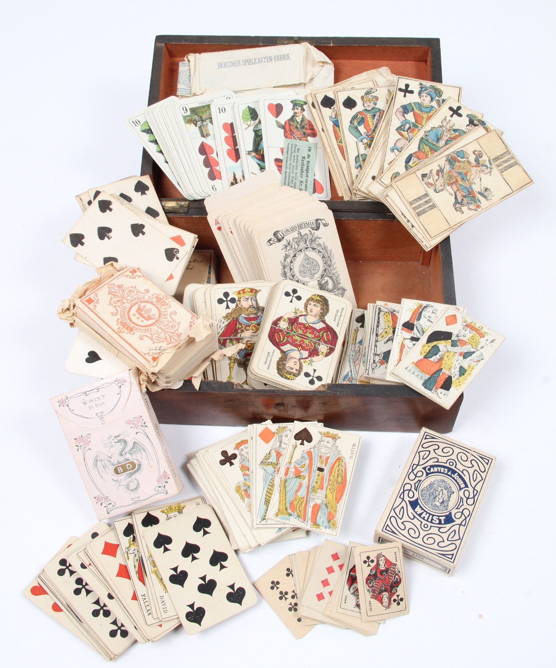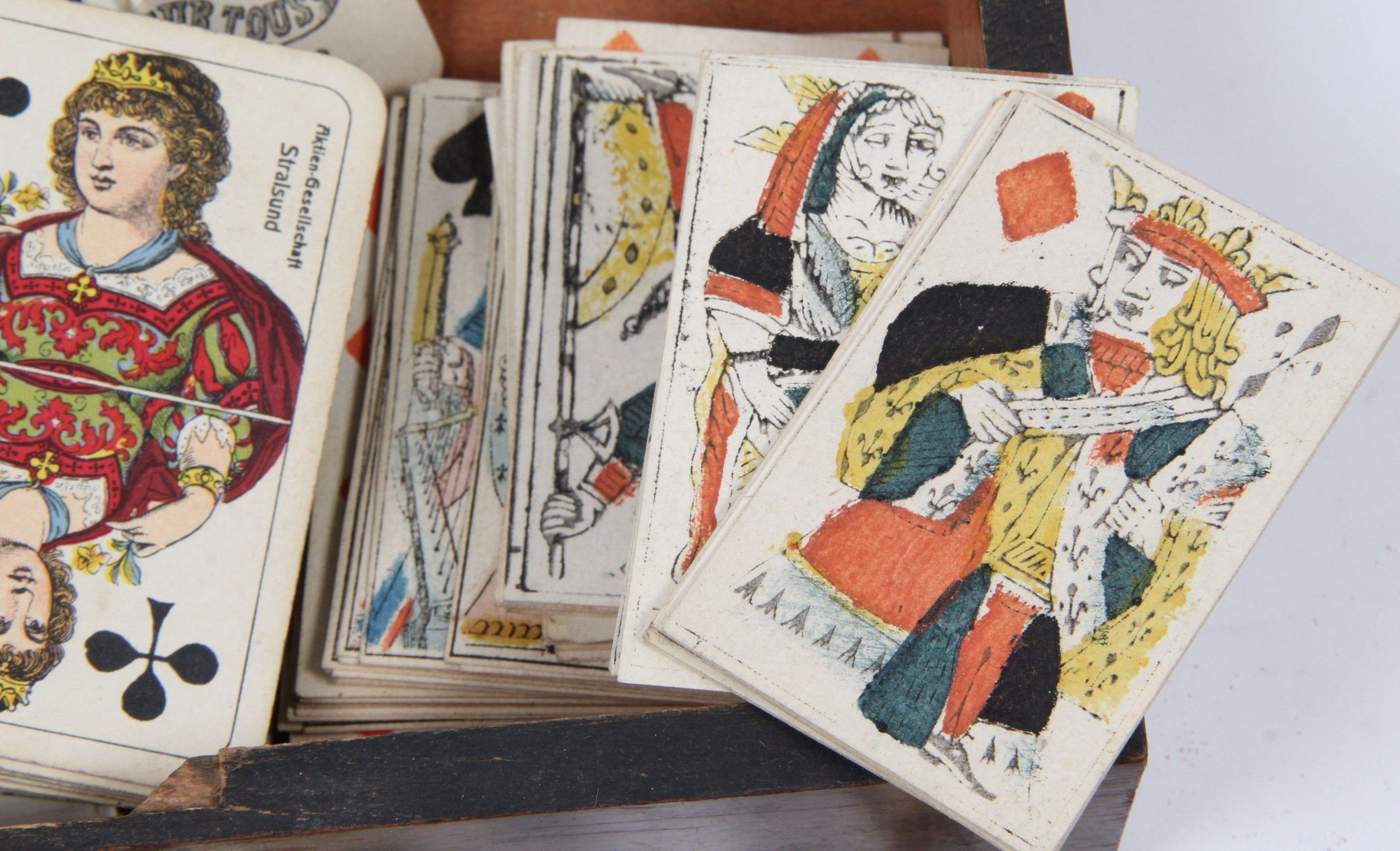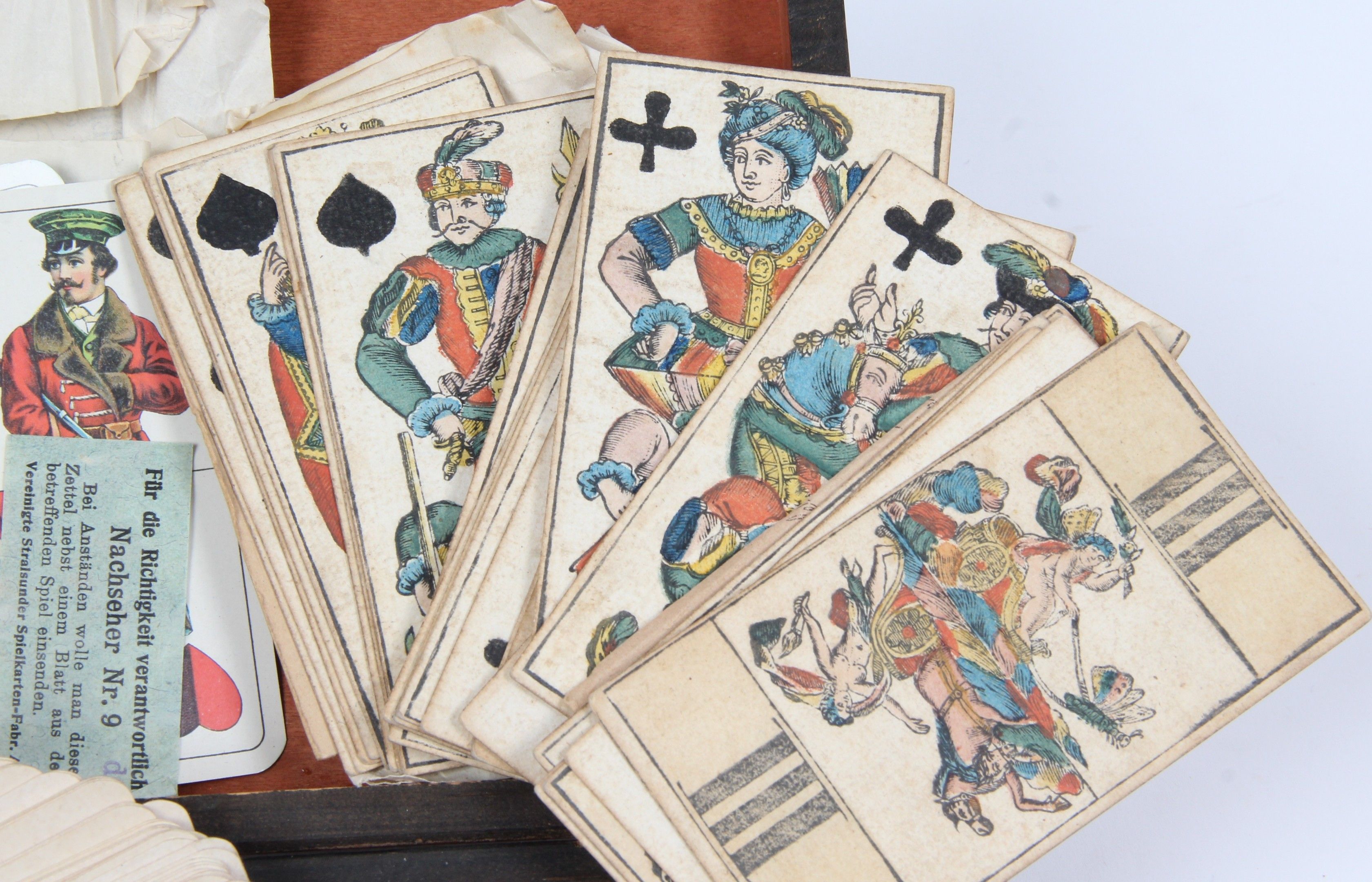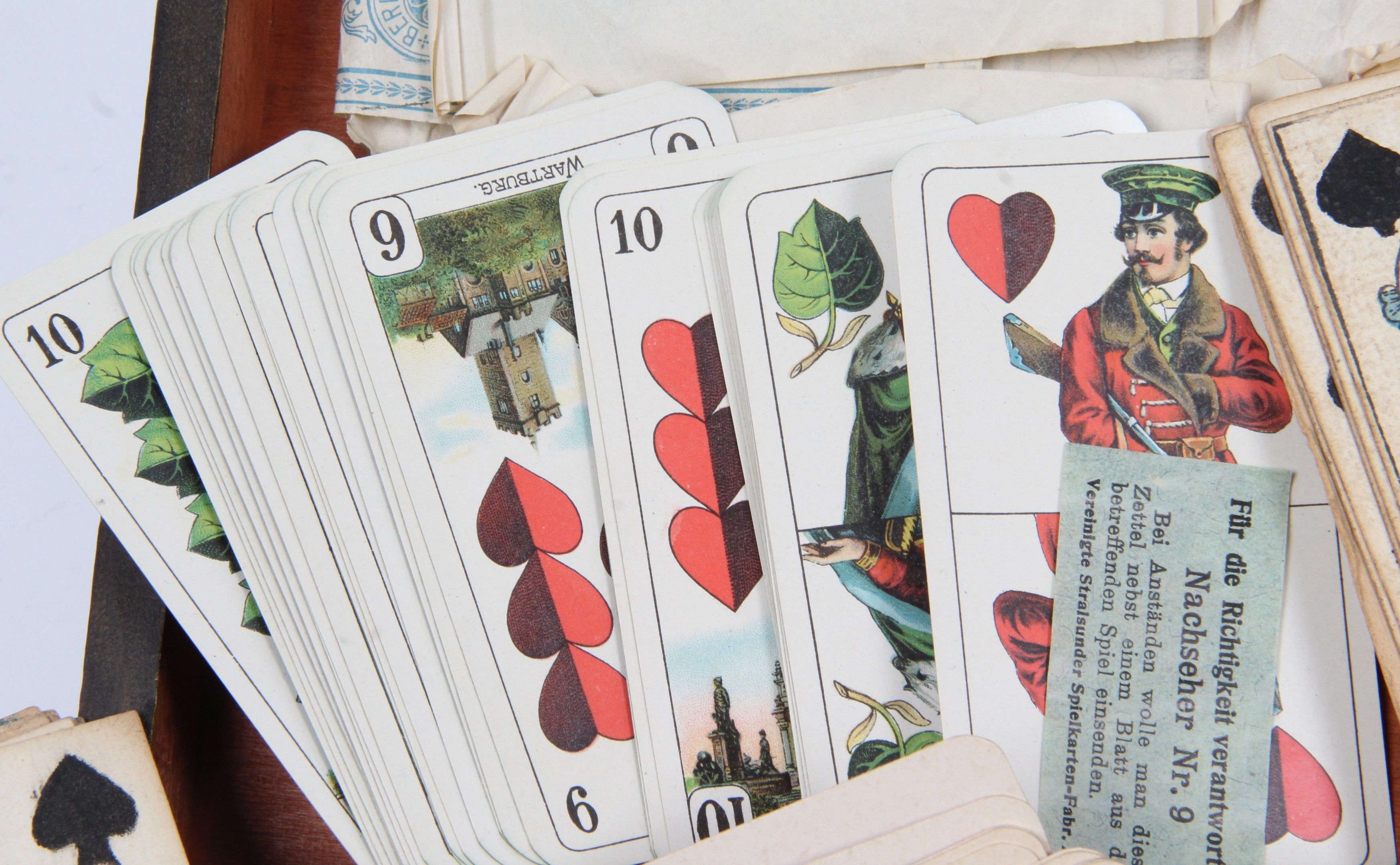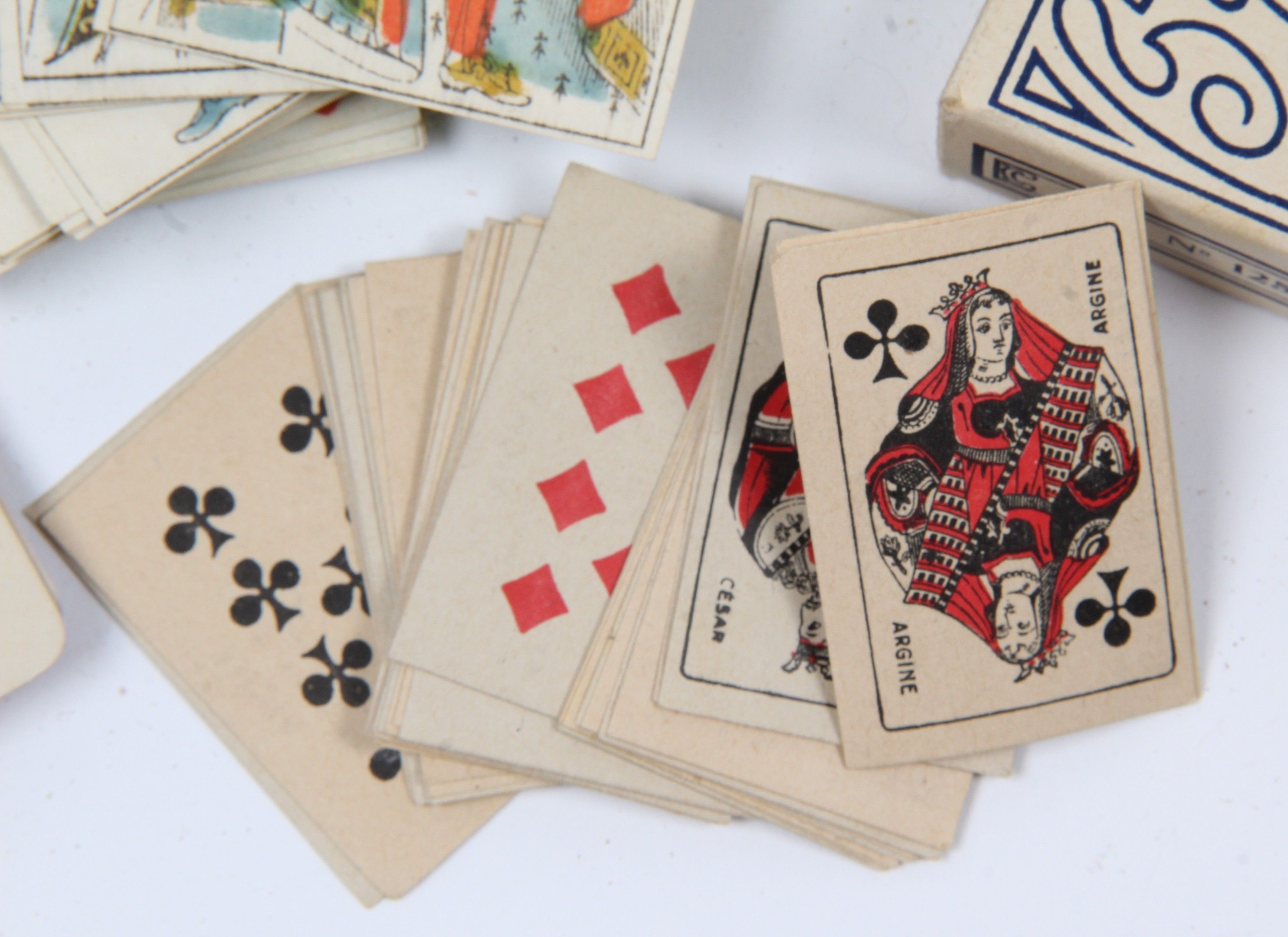 PLAY CARD Set of games including : - Set of 26 cards (incomplete) engraved in colour by Mansion (11 x 6 cm) red marbled back. - Deck of 52 cards printed by Léonard Biermans - purple back with portrait of the Queen Dieu pour Tous - Made in belgium (9,5 x 6,5 cm). - Tarot deck Spain - Jonas Fouquet 40 cards (9 x 5,5 cm). - Set of 52 unglazed cards - gouache Luxembourg 1936. - Classic deck of 32 unglazed cards - stencil without number - 8.4 x 5.5 cm. - Set of 32 glazed cards with figures in original packaging - N°200 Reichskarte - Berlin 9,7 x 6 cm. - Set of 52 Stralsund cards Germany 9,2 x 6,4 cm - blue tartan back. - H.B.F. Set of 52 stencil cards without No., red squared back 8.8 x 5.5 cm in original packaging. - Set of 18 incomplete 18th century gouache cards with dates (month-year) from October 1743 to September 1779 (9 x 5,5 cm) (damp stains). - Set of two sets of incomplete gouache cards early 19th century 8.3 x 5.4 cm and 7.6 x 5 cm. - La Régalière - Vichy sweets, set of 32 miniature G.M.B.H. cards and others - 2 sets of WIST in boxes. N°160 and 1255. - Two miniature paper Domino games, never unwrapped. All these games are presented in a 19th century box. (They are in beautiful original condition and sold as is).