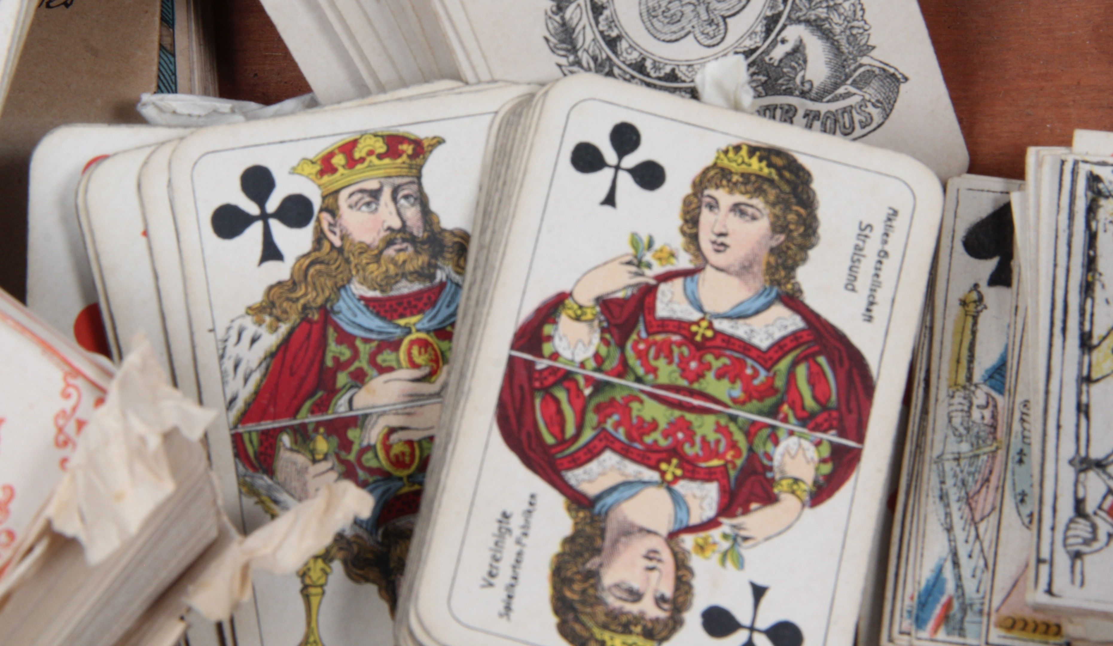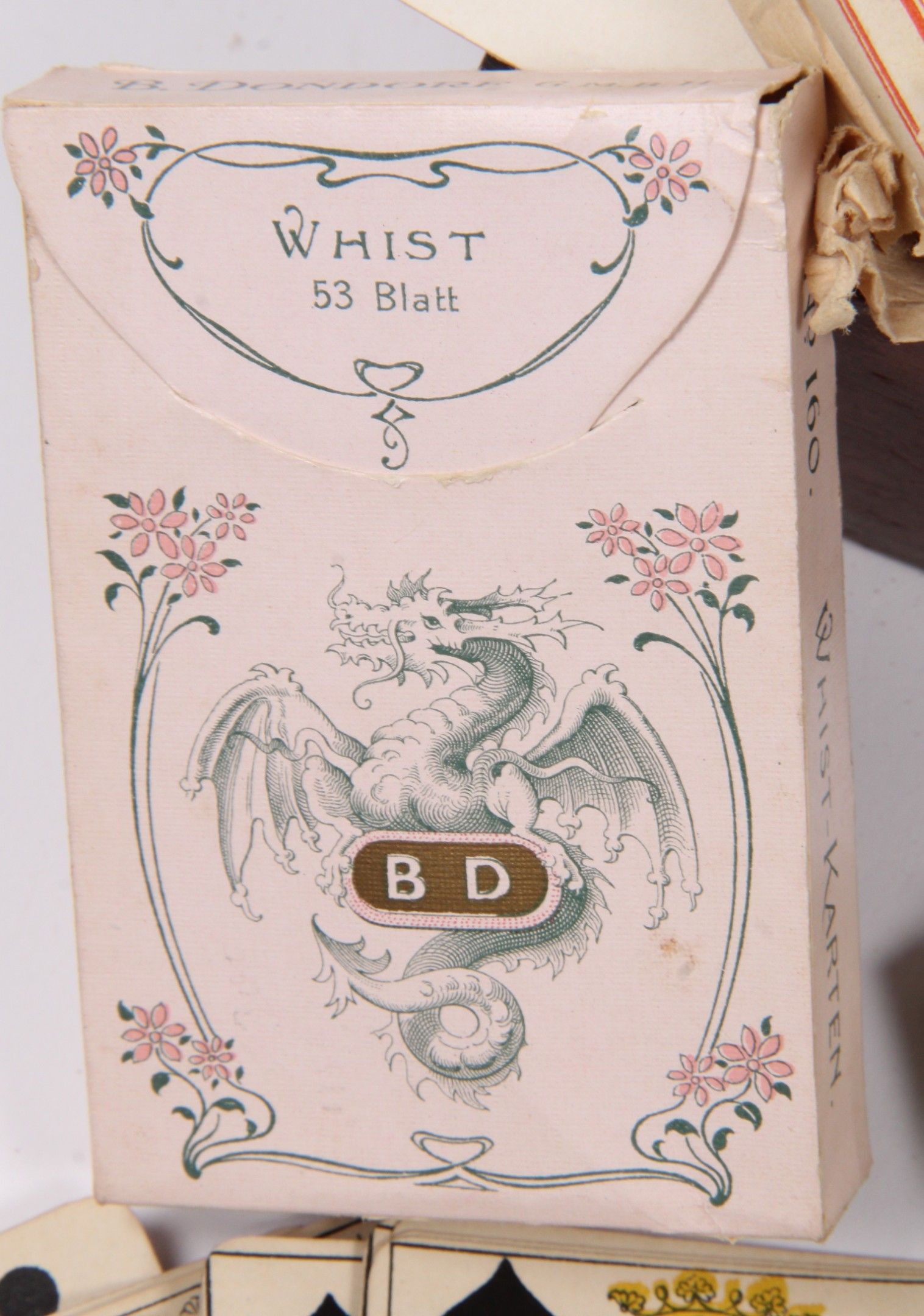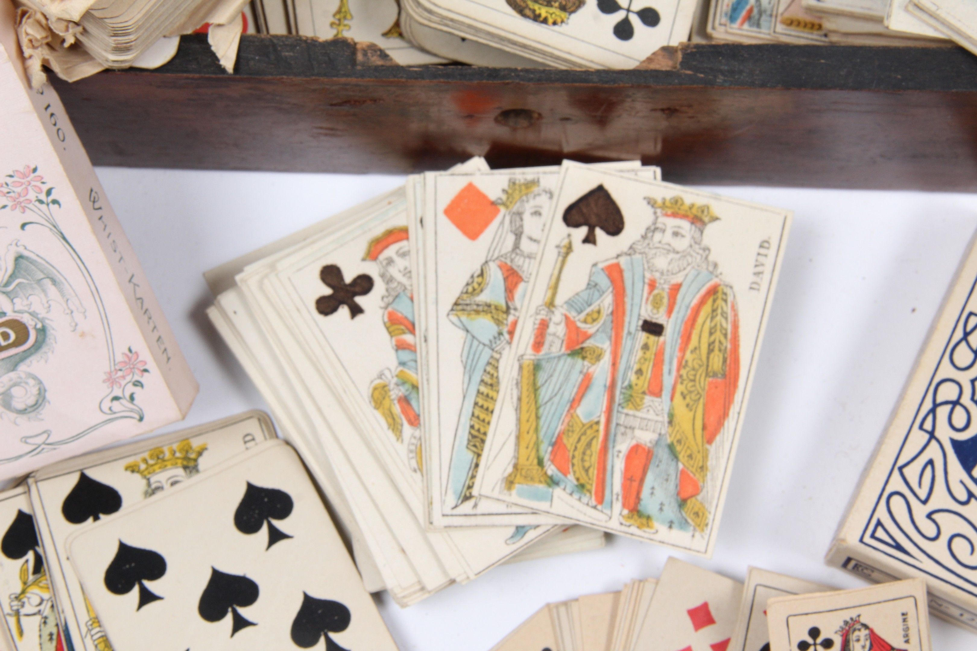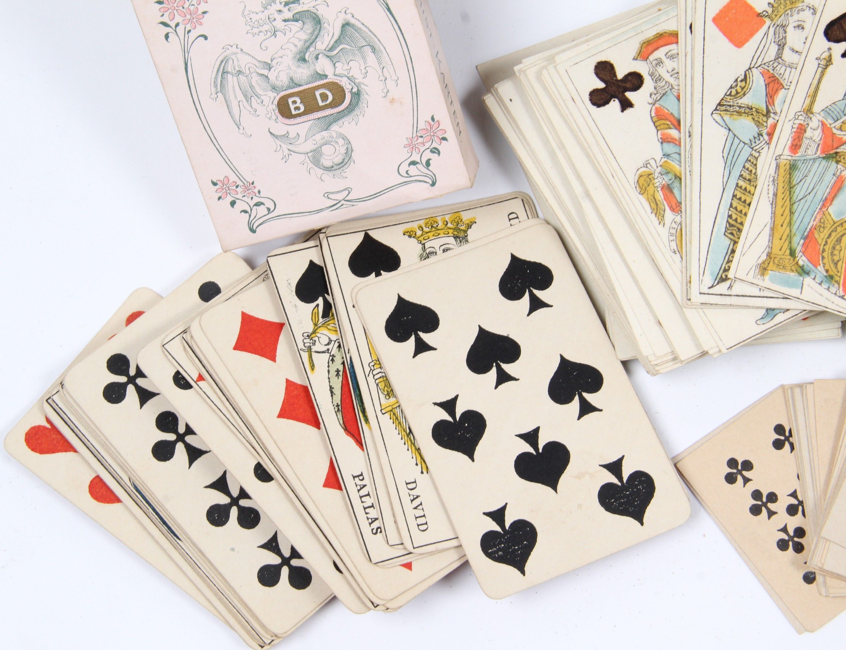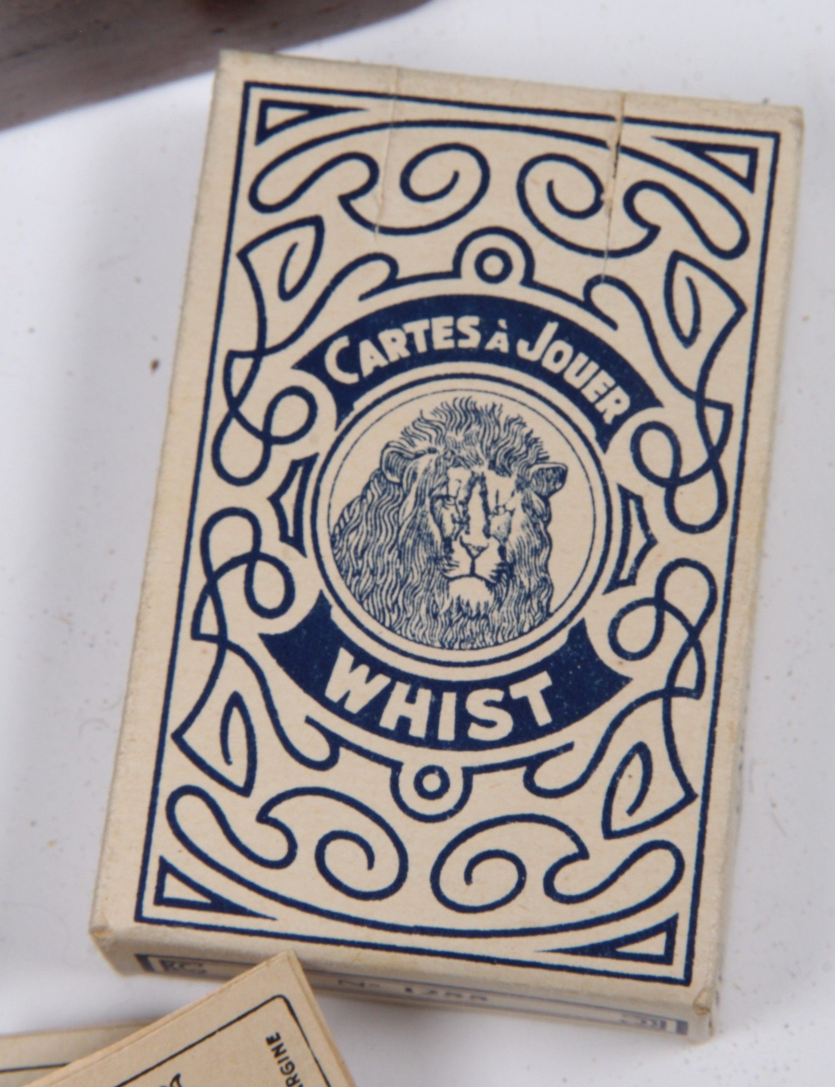 PLAY CARD Set of games including : - Set of 26 cards (incomplete) engraved in colour by Mansion (11 x 6 cm) red marbled back. - Deck of 52 cards printed by Léonard Biermans - purple back with portrait of the Queen Dieu pour Tous - Made in belgium (9,5 x 6,5 cm). - Tarot deck Spain - Jonas Fouquet 40 cards (9 x 5,5 cm). - Set of 52 unglazed cards - gouache Luxembourg 1936. - Classic deck of 32 unglazed cards - stencil without number - 8.4 x 5.5 cm. - Set of 32 glazed cards with figures in original packaging - N°200 Reichskarte - Berlin 9,7 x 6 cm. - Set of 52 Stralsund cards Germany 9,2 x 6,4 cm - blue tartan back. - H.B.F. Set of 52 stencil cards without No., red squared back 8.8 x 5.5 cm in original packaging. - Set of 18 incomplete 18th century gouache cards with dates (month-year) from October 1743 to September 1779 (9 x 5,5 cm) (damp stains). - Set of two sets of incomplete gouache cards early 19th century 8.3 x 5.4 cm and 7.6 x 5 cm. - La Régalière - Vichy sweets, set of 32 miniature G.M.B.H. cards and others - 2 sets of WIST in boxes. N°160 and 1255. - Two miniature paper Domino games, never unwrapped. All these games are presented in a 19th century box. (They are in beautiful original condition and sold as is).