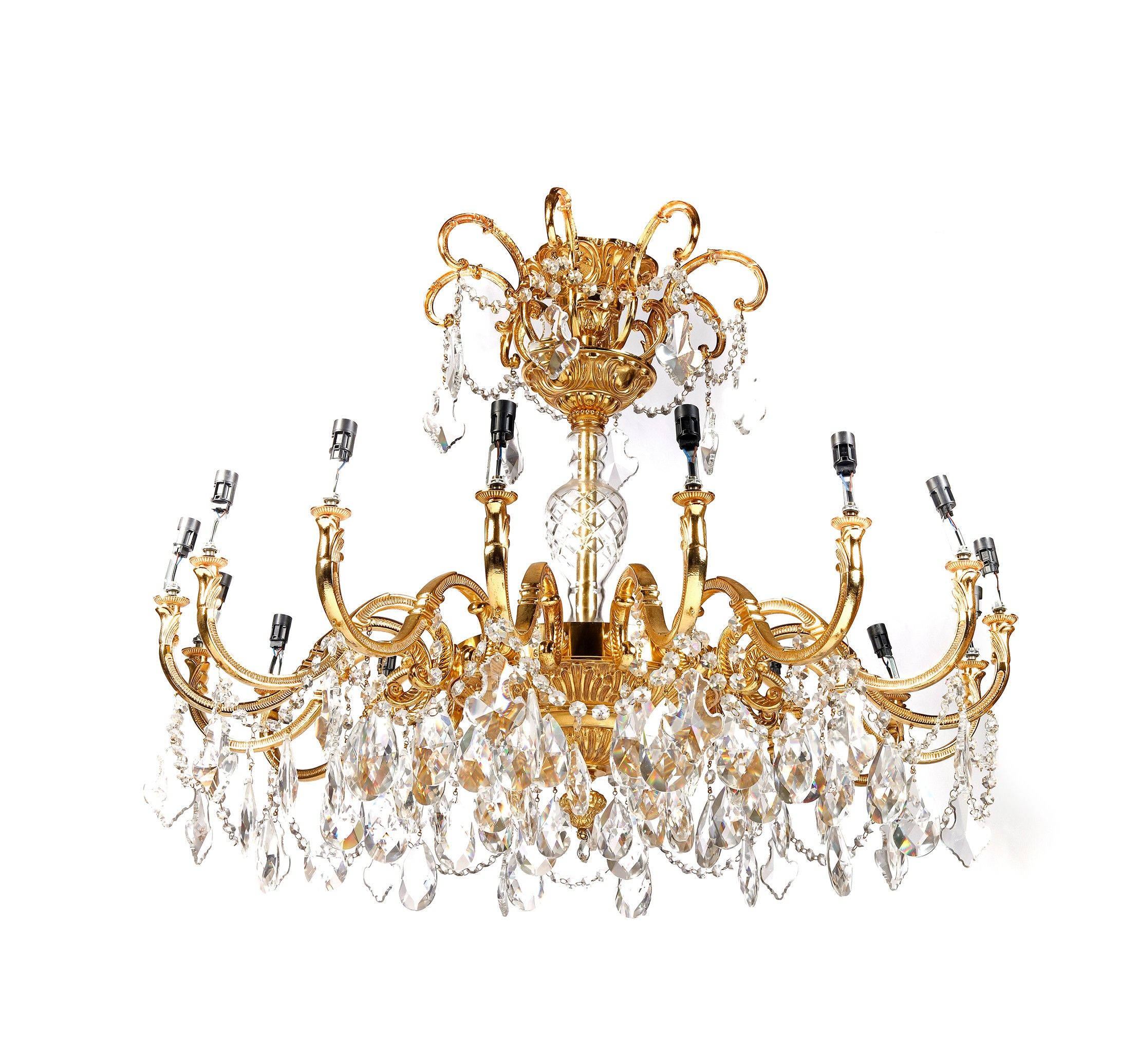 in gilded metal and pendants, with approximately twenty-five arms of light in two rows.