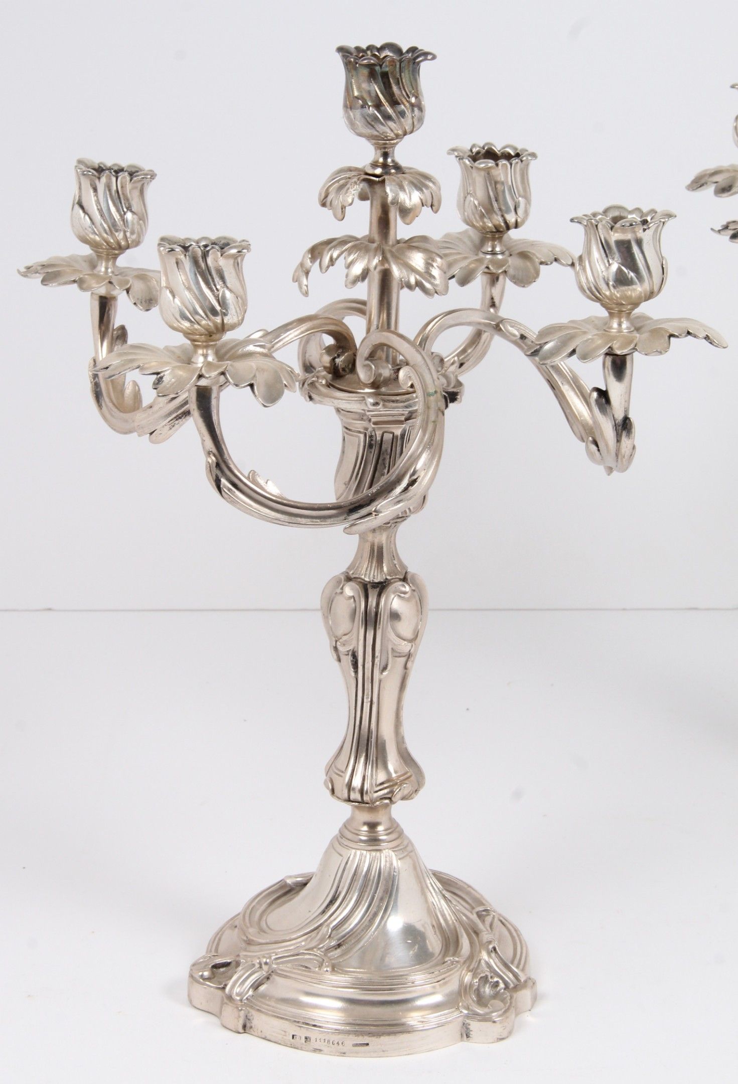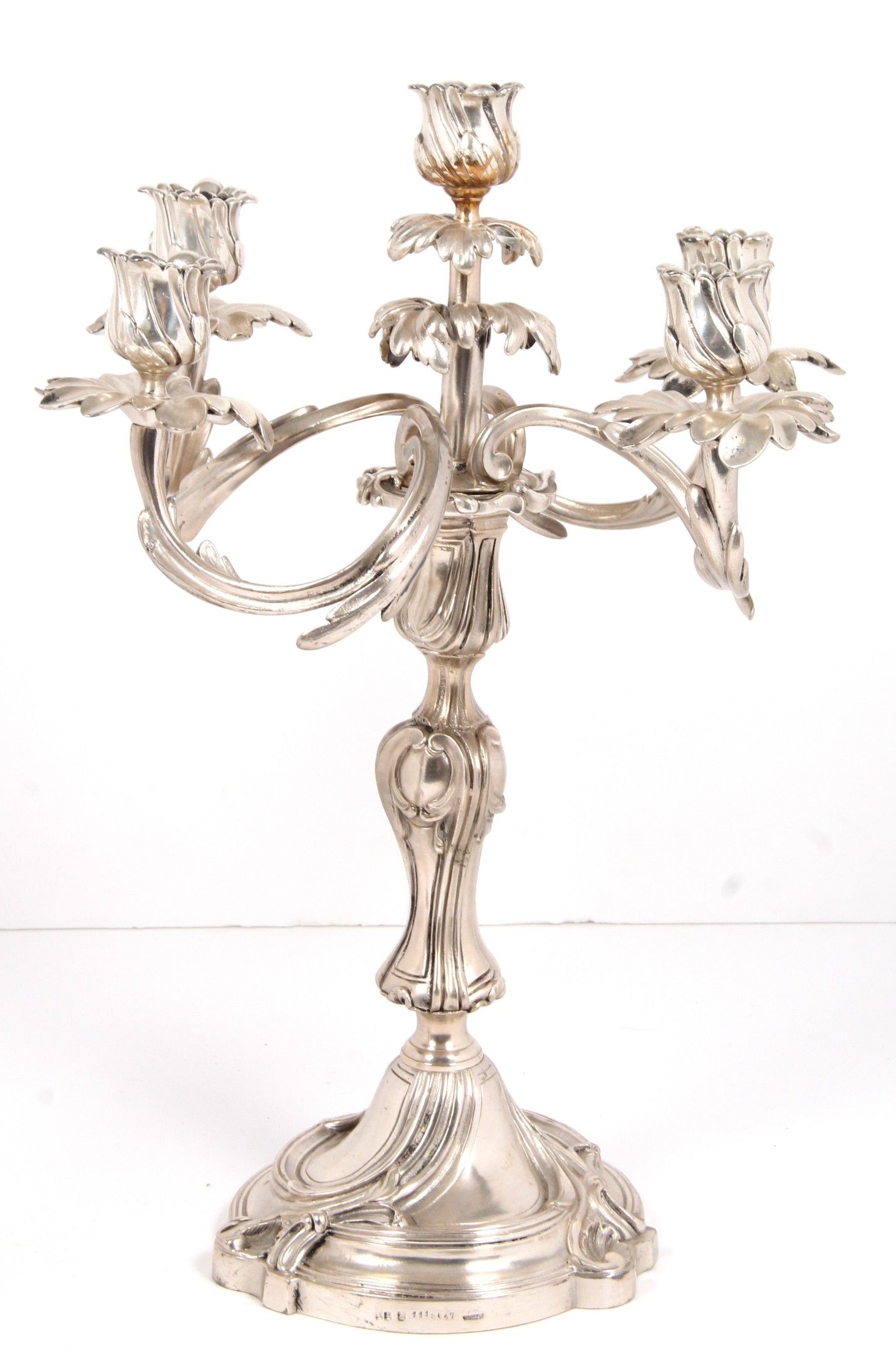 A pair of Louis XV style silver plated candelabras. Baluster shaft supporting a bouquet of five lights, decorated with foliage.