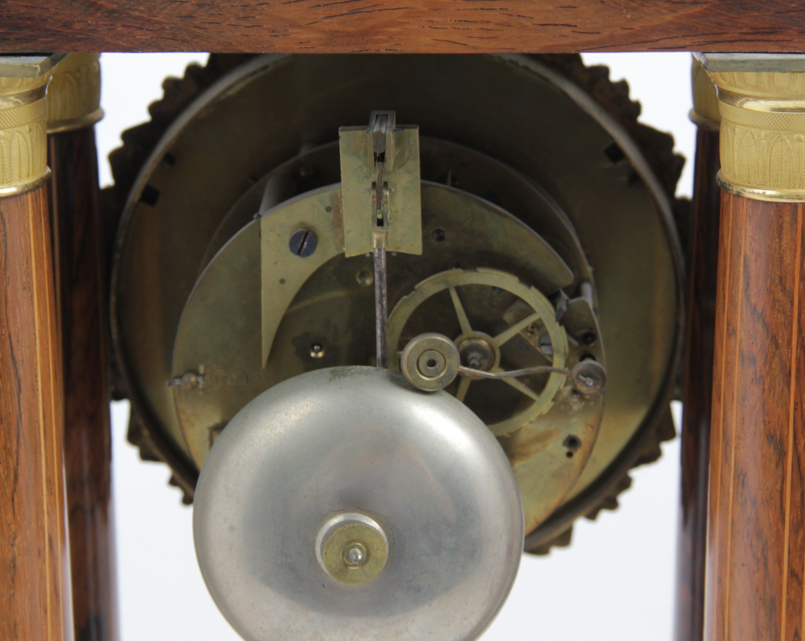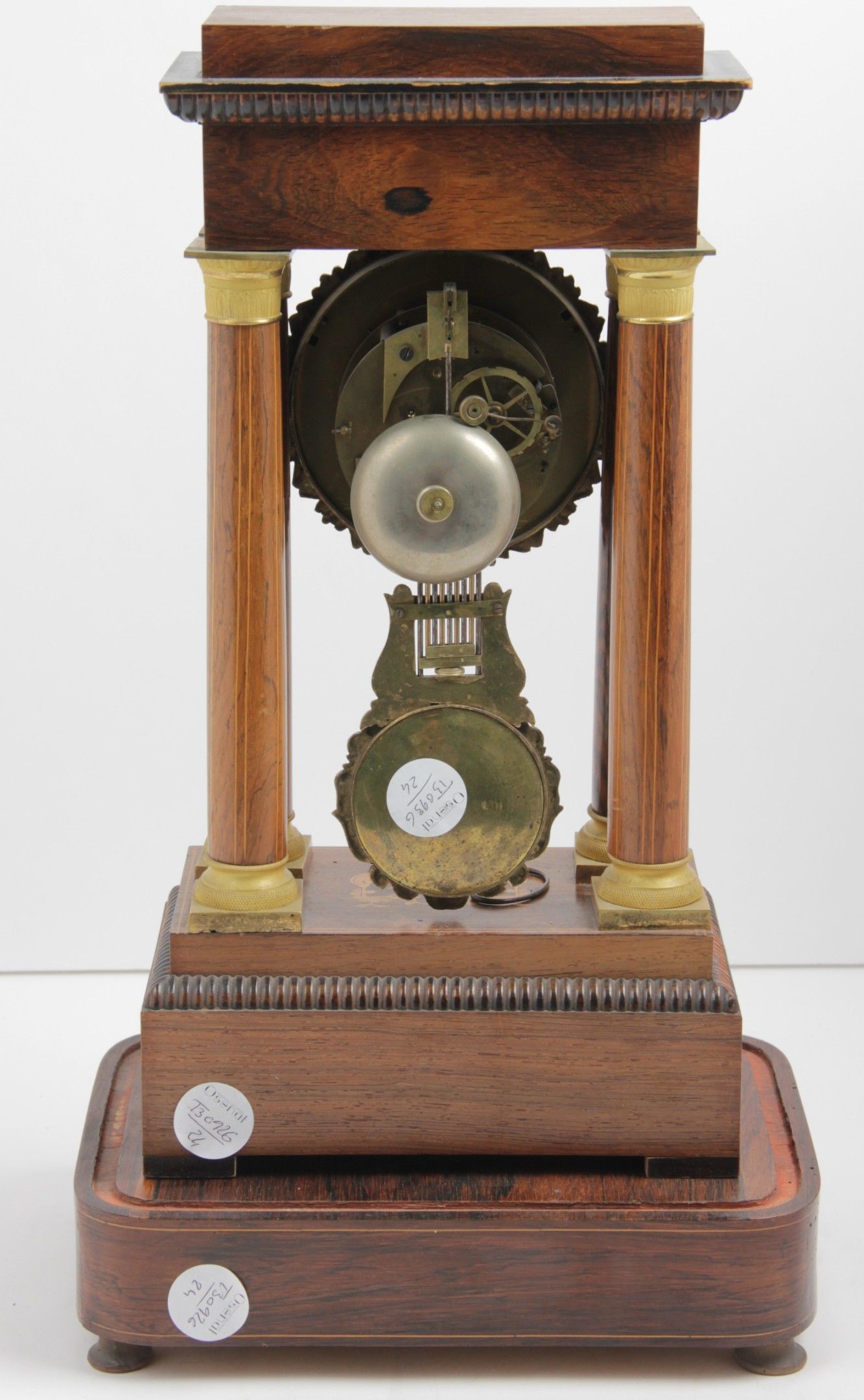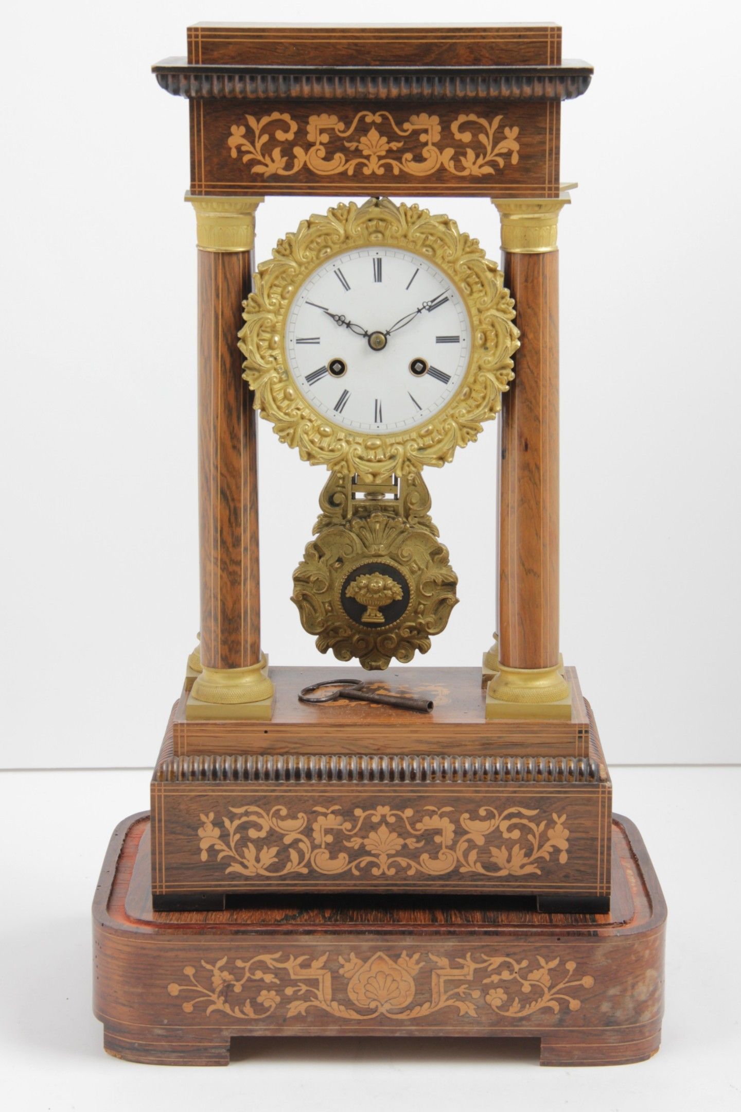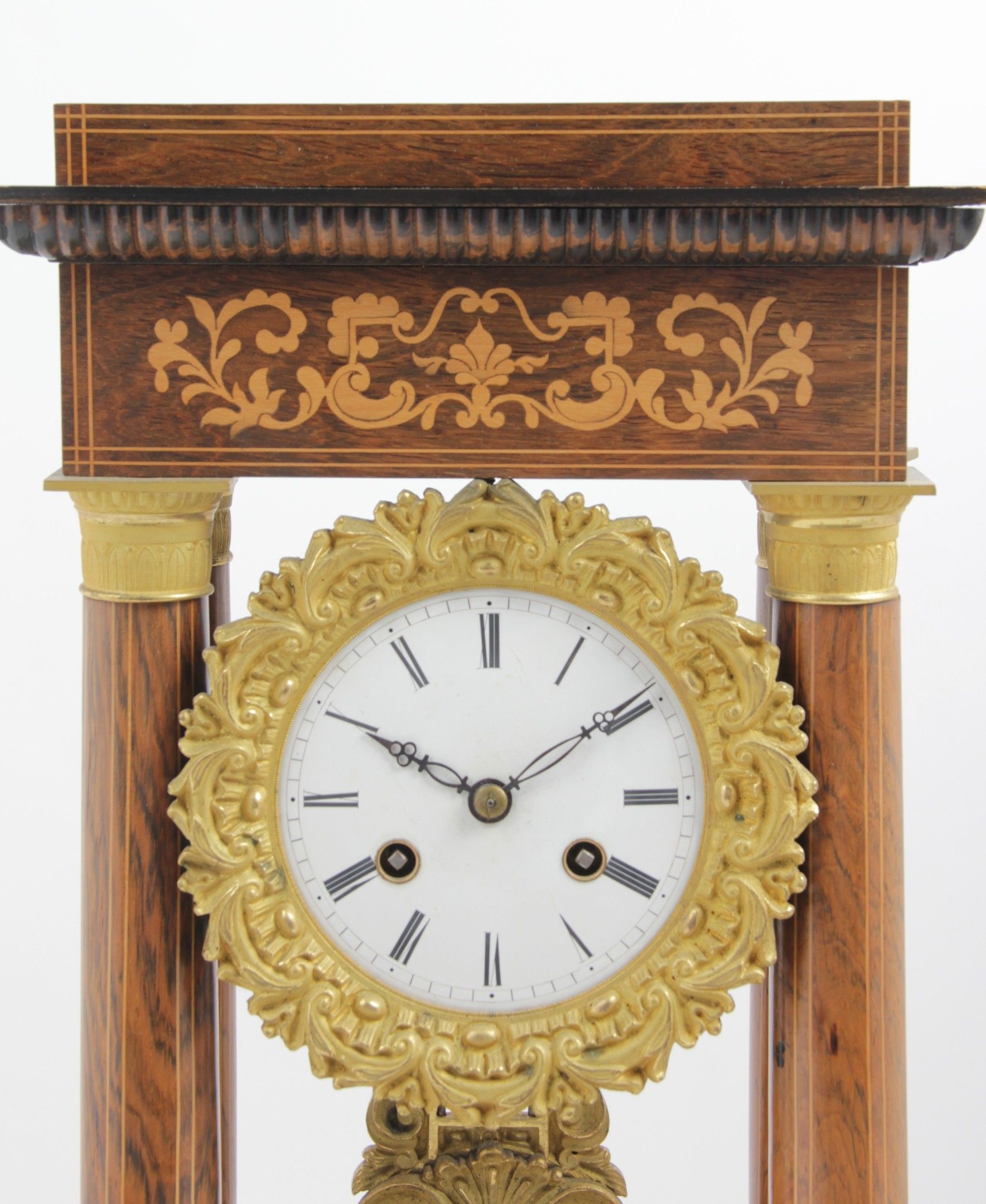 in rosewood and light wood fillets, uprights with columns. Pediment and base decorated with foliage. White enamel dial with Roman hour markers. With its counter base.