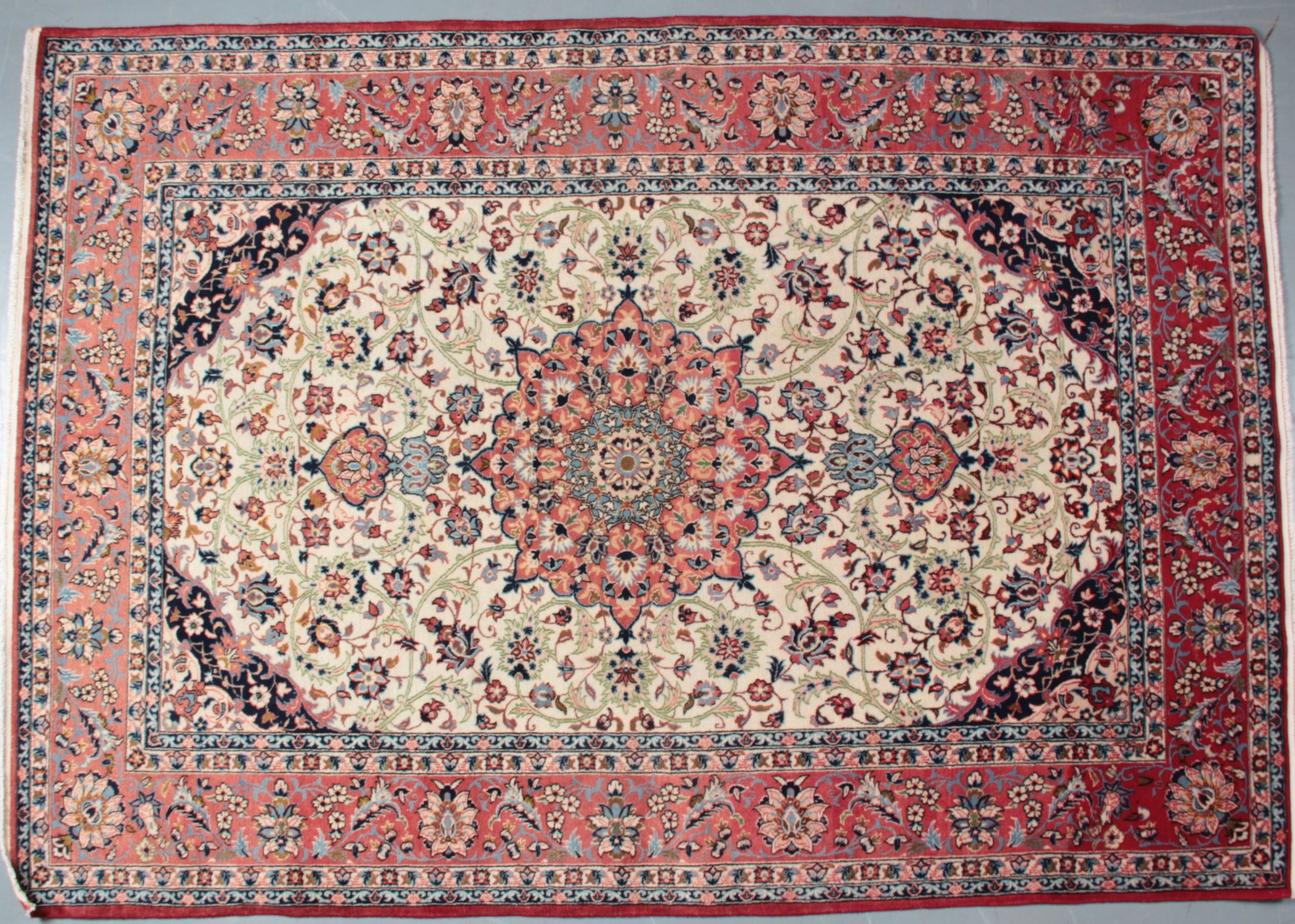 decorated with central rosettes on a beige background and foliage and flower scrolls, navy blue and ivory spandrels, brick red main border with flowers and foliage.