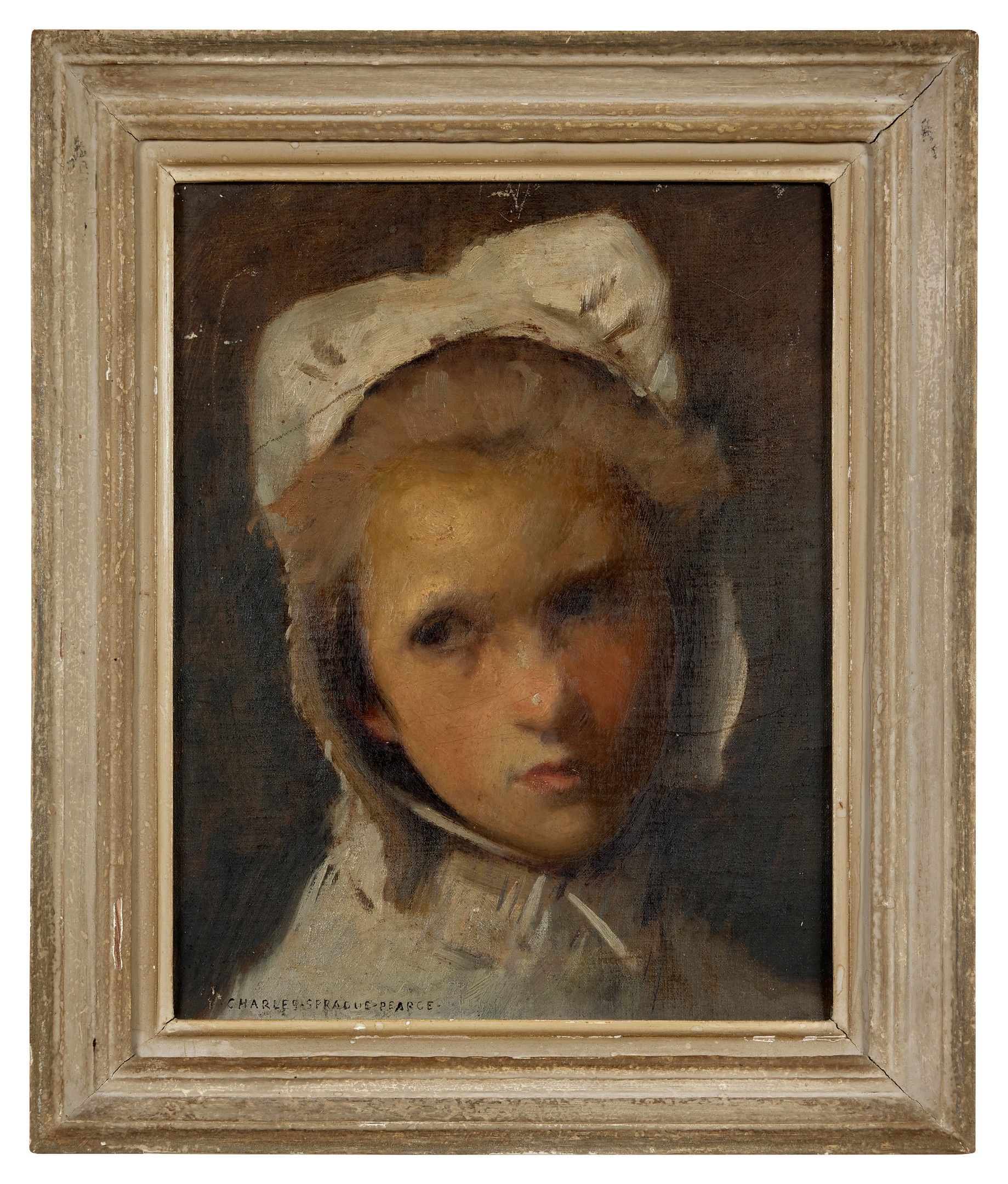 Charles Sprague PEARCE (1851-1914) Portrait of a Girl in a Bonnet Oil on canvas Signed lower left 27.5 x 22 cm With frame: 34 x 29 cm Provenance : Antonia Pearce, née Louise Catherine Bonjean, wife of Charles Pearce. Passed on to her son, Emile Carrière (1874-1946) and then by descent to the current owner. Oil on canvas, signed lower left, 10.6 x 8.6 in, with frame : 13.3 x 11.4 in, Provenance : Antonia Pearce, born Louise Catherine Bonjean. Passed on to his son, Emile Carrière (1874-1946) and then by descent to the current owner.