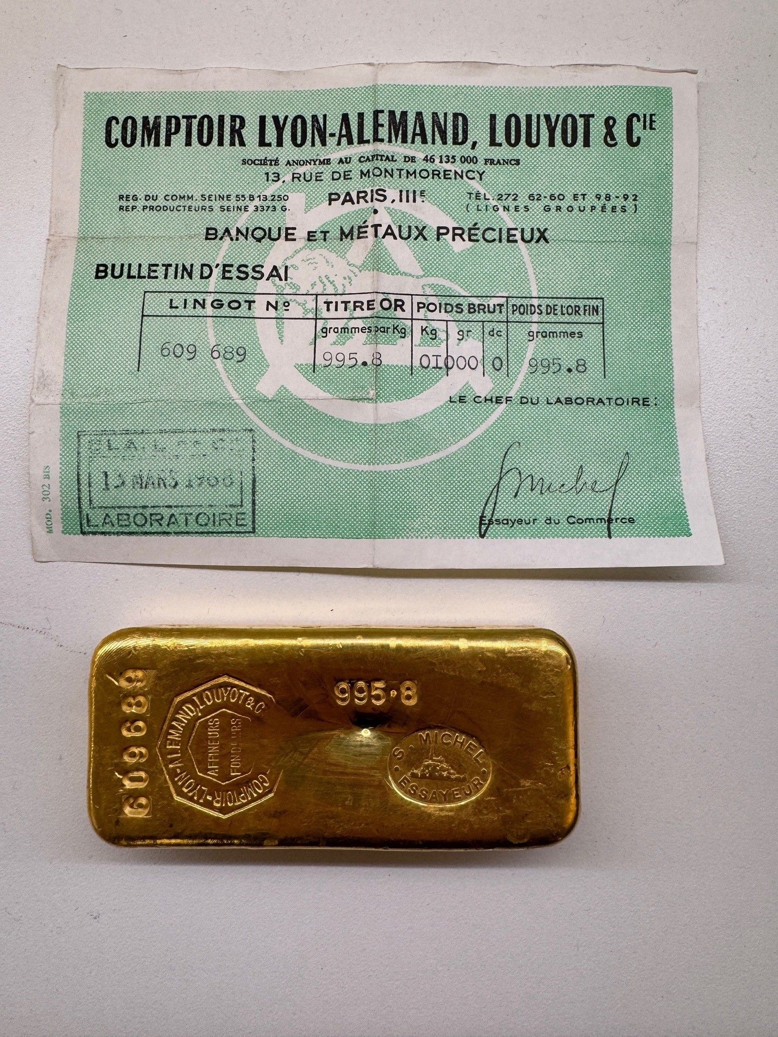 995.8 g fine gold ingot, N° 609689. Gross weight 1kg. With bulletin from Comptoir Lyon-Alemand, Louyot & Cie.