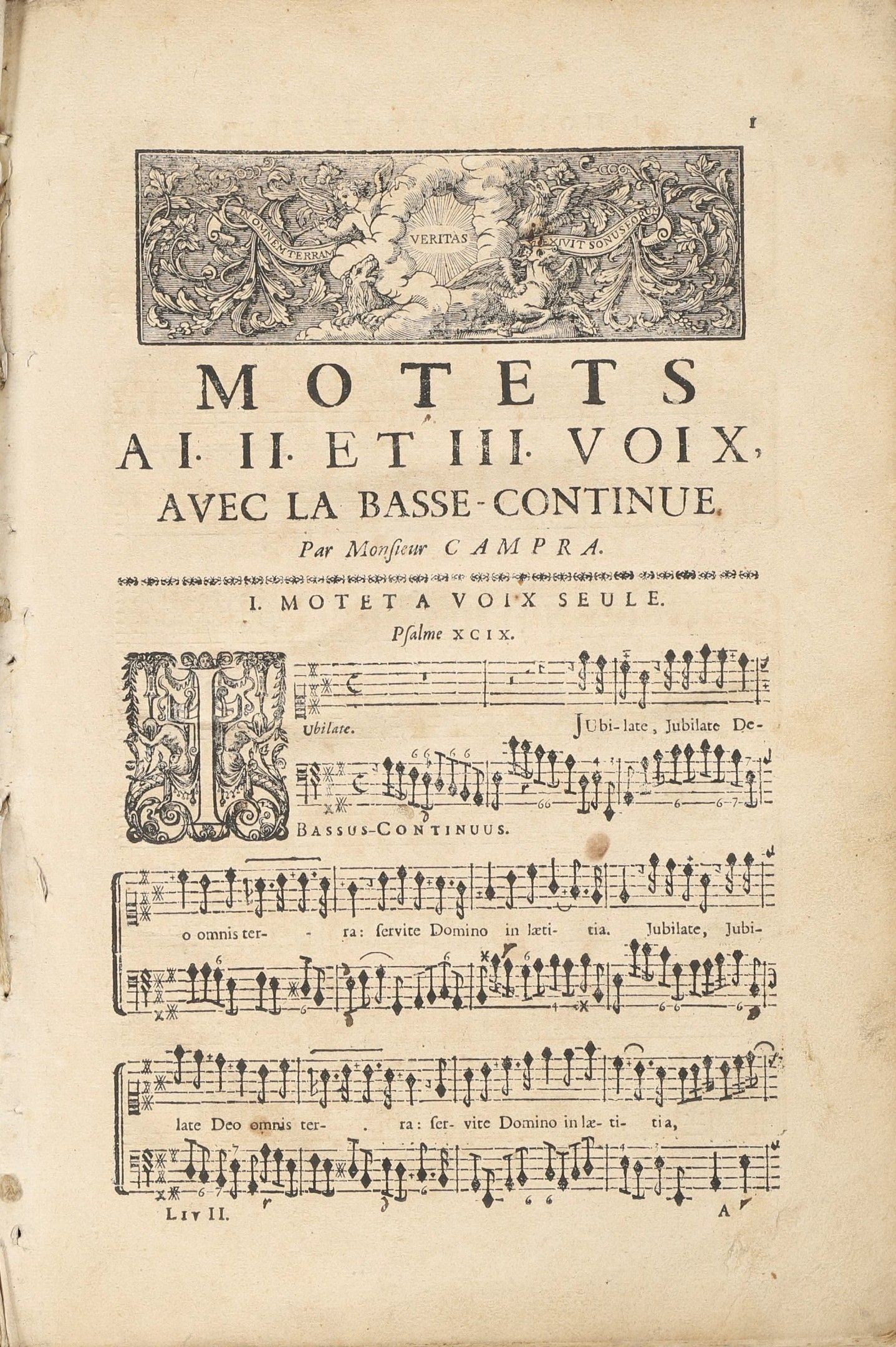 > CAMPRA (André). Motets I, II et III voix par M. Campra. No place or date [probably Paris, 1695], Christophe Ballard.