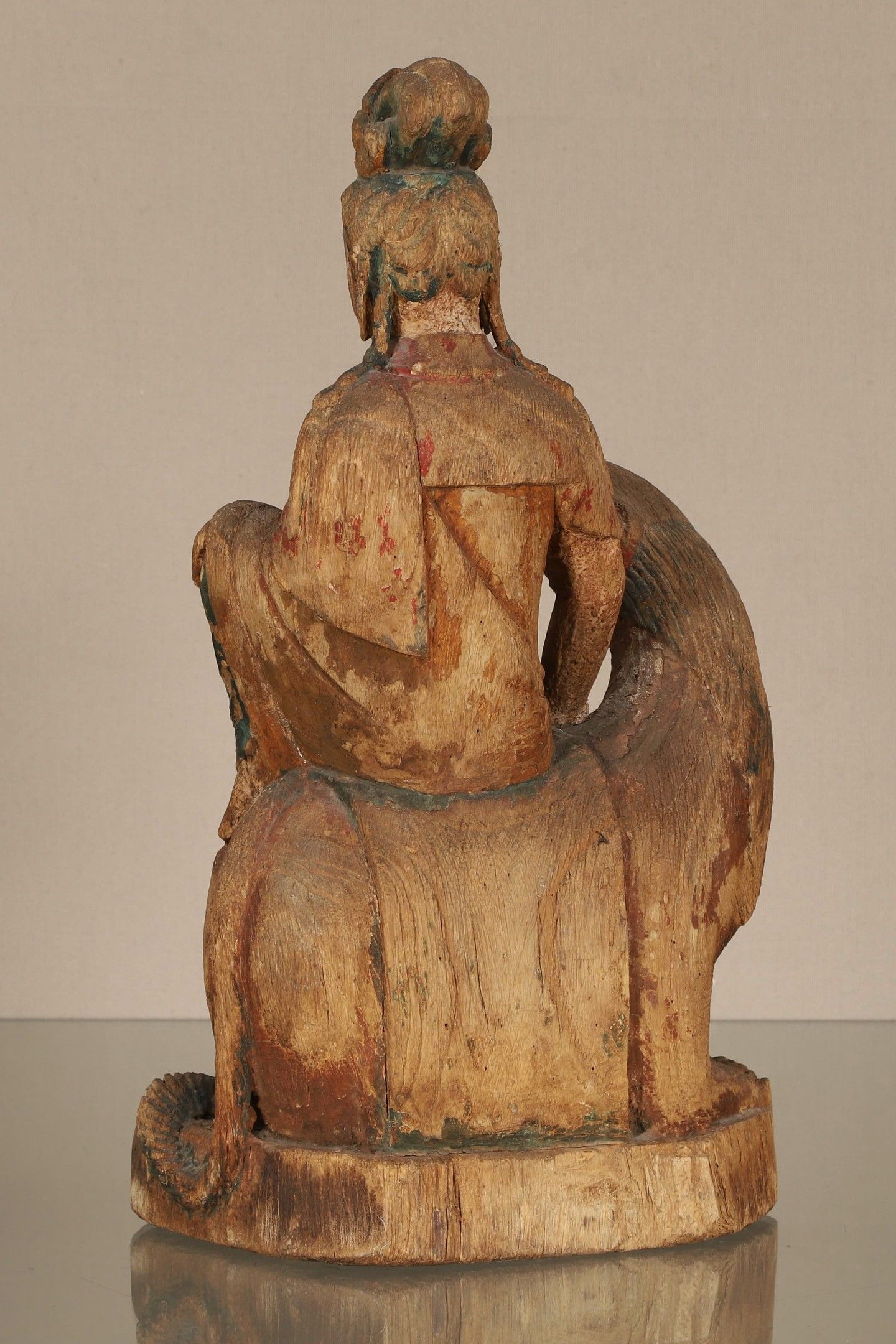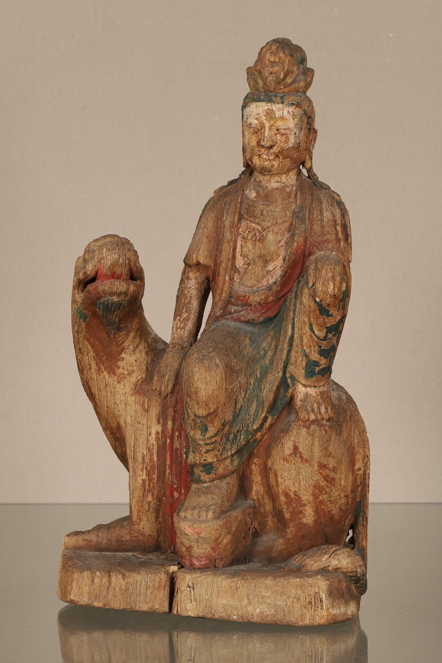 China Bodhisattva avalokiteshvara In carved wood with traces of polychromy, shown seated on a Fo dog H. 52 cm W. 28 cm D. 18.5 cm Provenance: > Private collection Eure-et-Loir