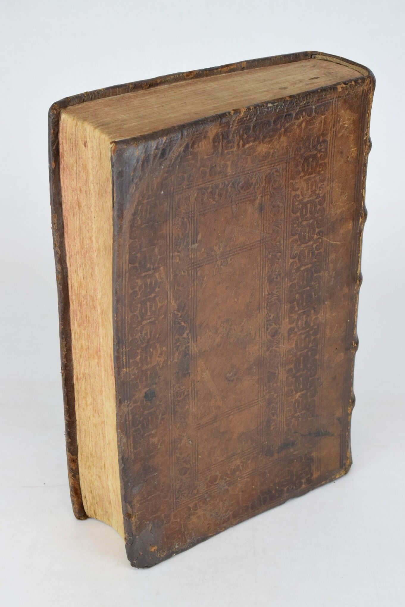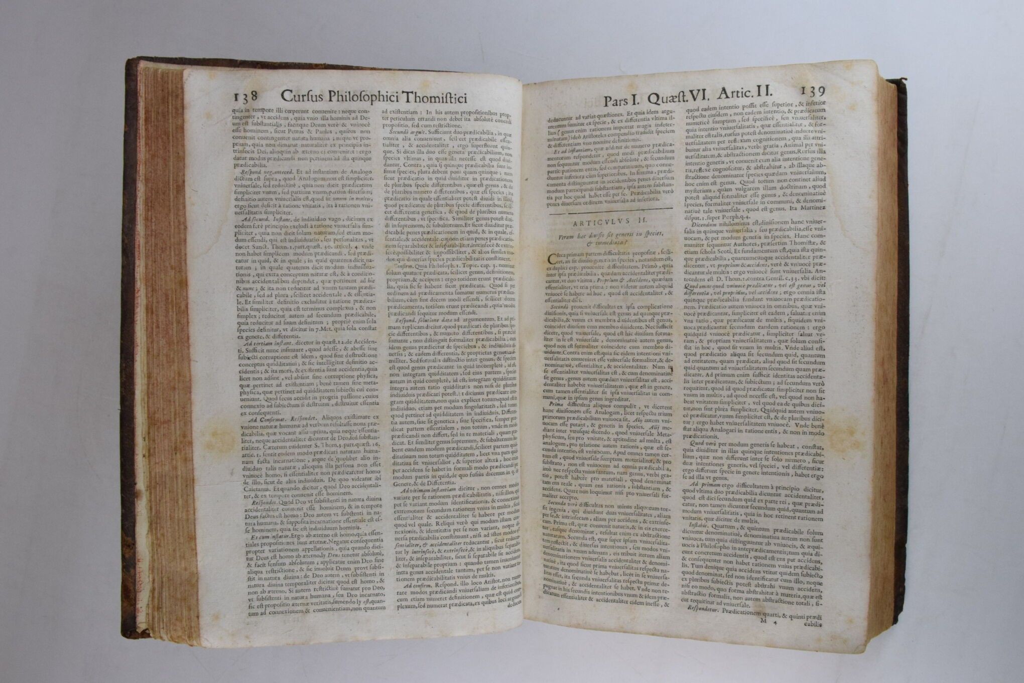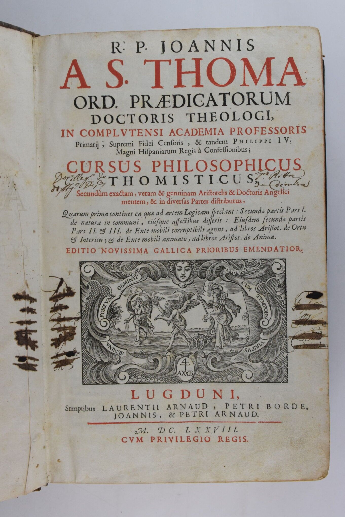 SAINT-THOMAS, Jean de (1589-1644; Dominican). Cursus philosophicus Thomisticus, secundum exactam, veram & genuinam Aristotelis & Doctoris Angelici mentem, & in diversas partes distributus... Lugduni (Lyon), Laurentii Arnaud, Petri Borde, Joannis & Petri Arnaud, 1678. In-folio, (14)-920-(30) pp, engraved title vignette and headbands. Contemporary binding in calf, framed with cold roulettes on the boards, spine decorated with gilt fleurons, traces of burns on the first board, corners and edges damaged, spines cracked, names inscribed on the title page, light foxing and trace of wetness. Jean de Saint-Thomas was a Spanish theologian famous for his commentaries on Saint Thomas Aquinas.